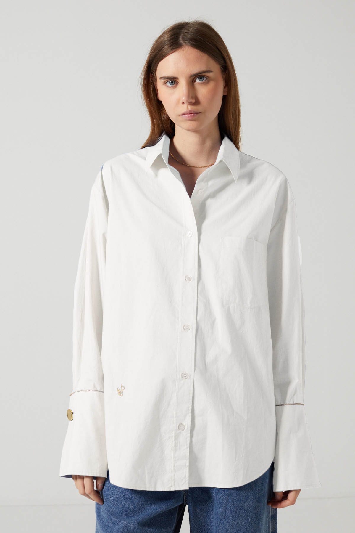 Plain poplin shirt with gold detailing . Large fit . Rounded hem . Shirt collar . Button fastening . Patch pocket on the chest . Long...