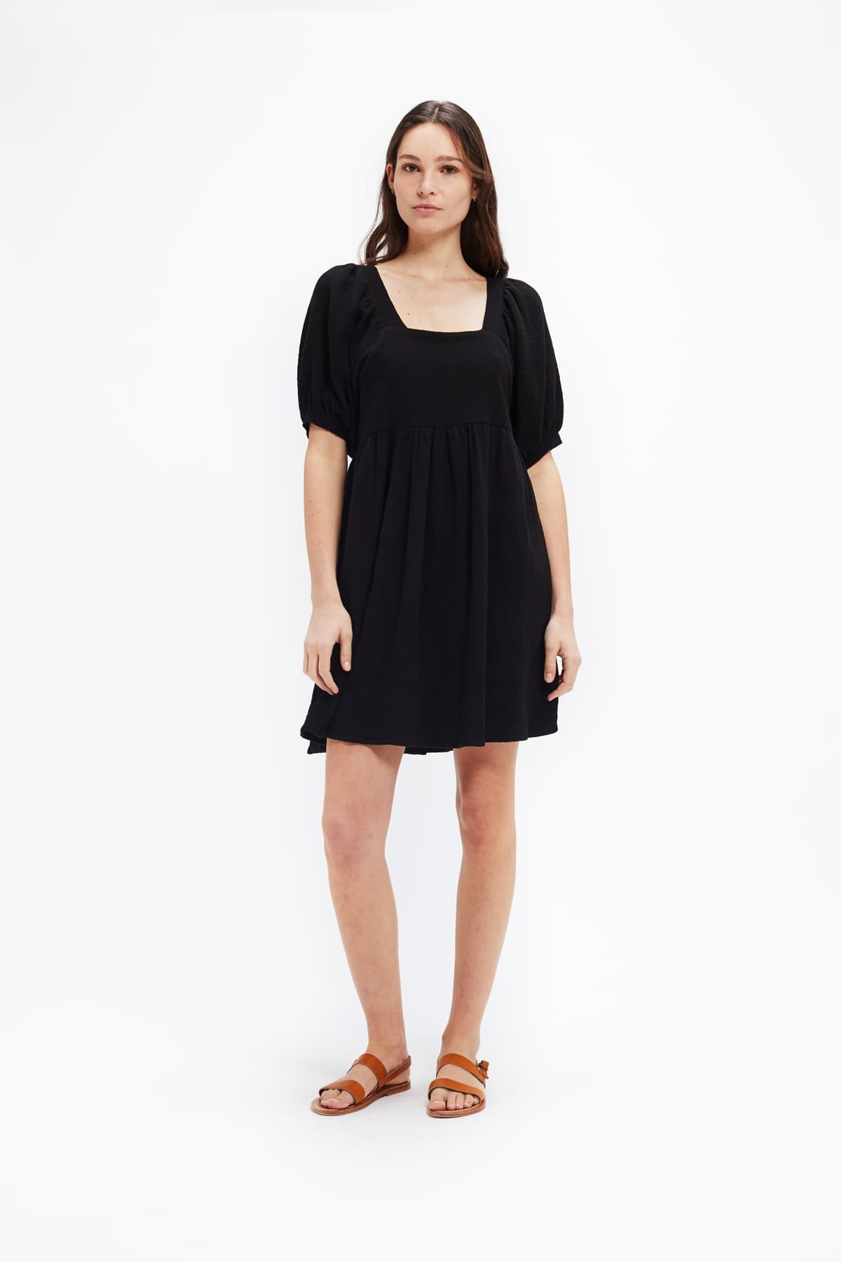 Short black dress . Straight cut . Puffy sleeves . Square neckline