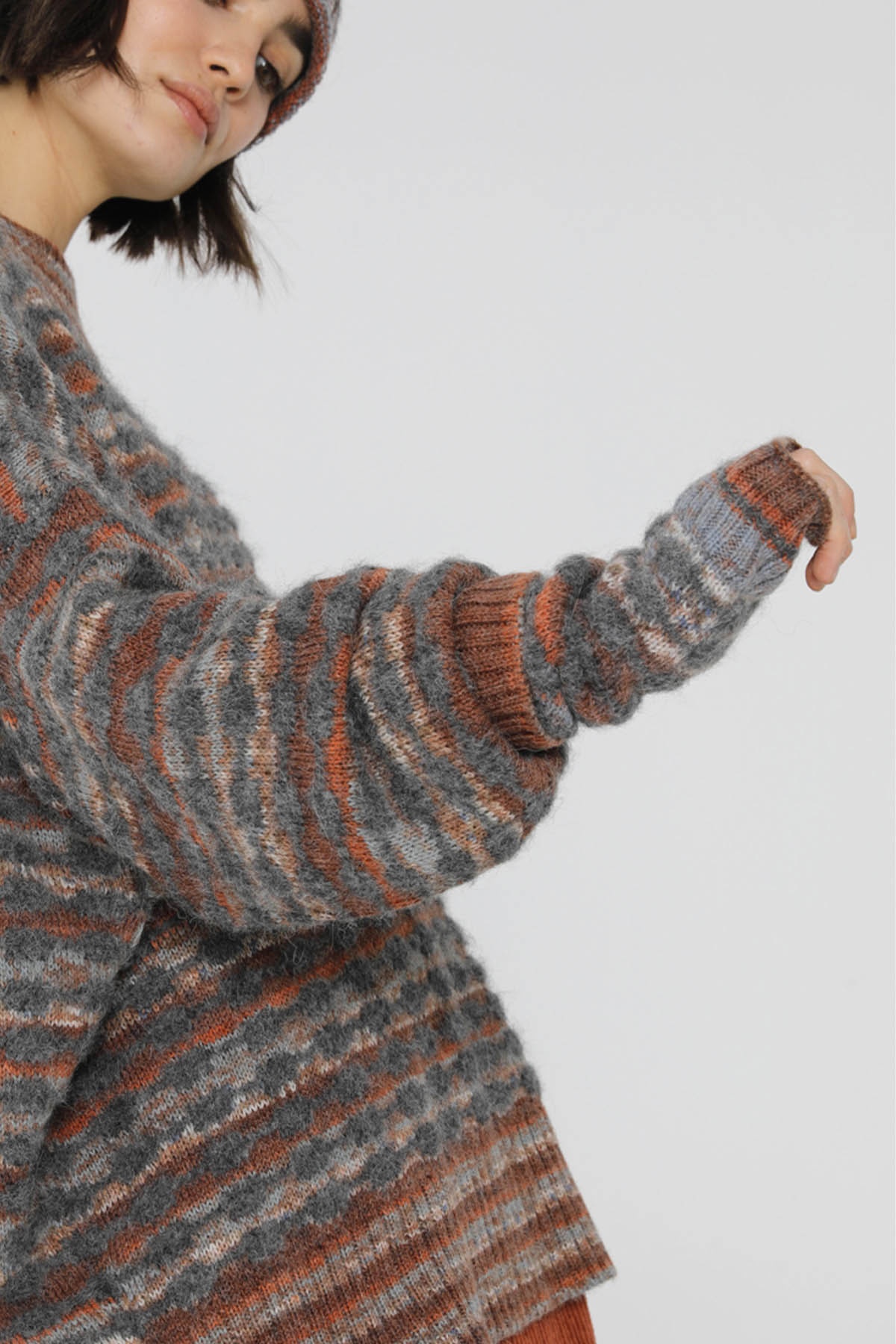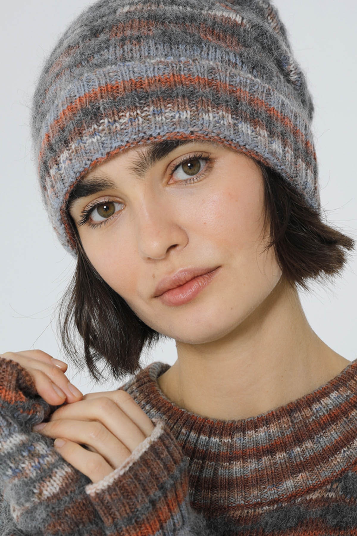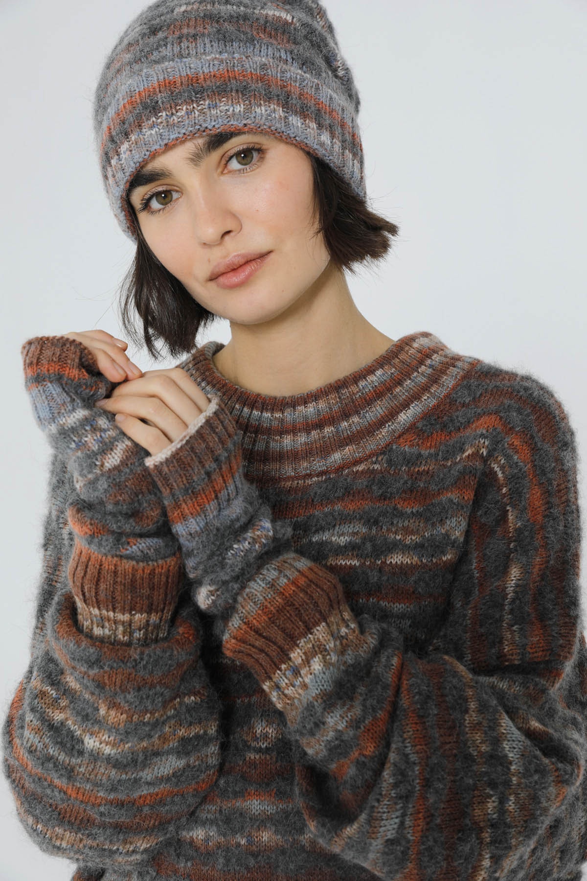 Neha's alpaca mittens offer warmth and style for cooler days. In a grey hue with a subtle mix of brown, they're designed to keep you comfortable while adding a touch of elegance to your outfit. Complete your ensemble with the matching jumper and hat for a perfect match.