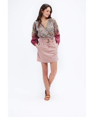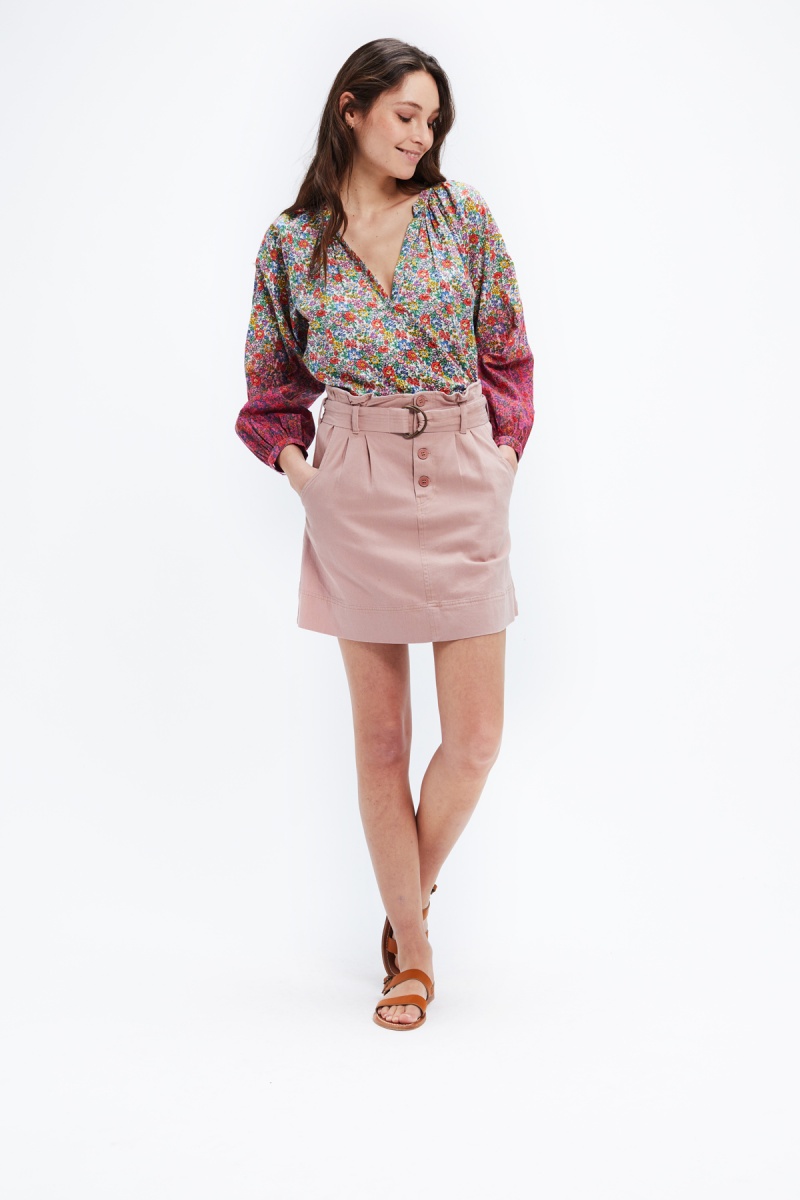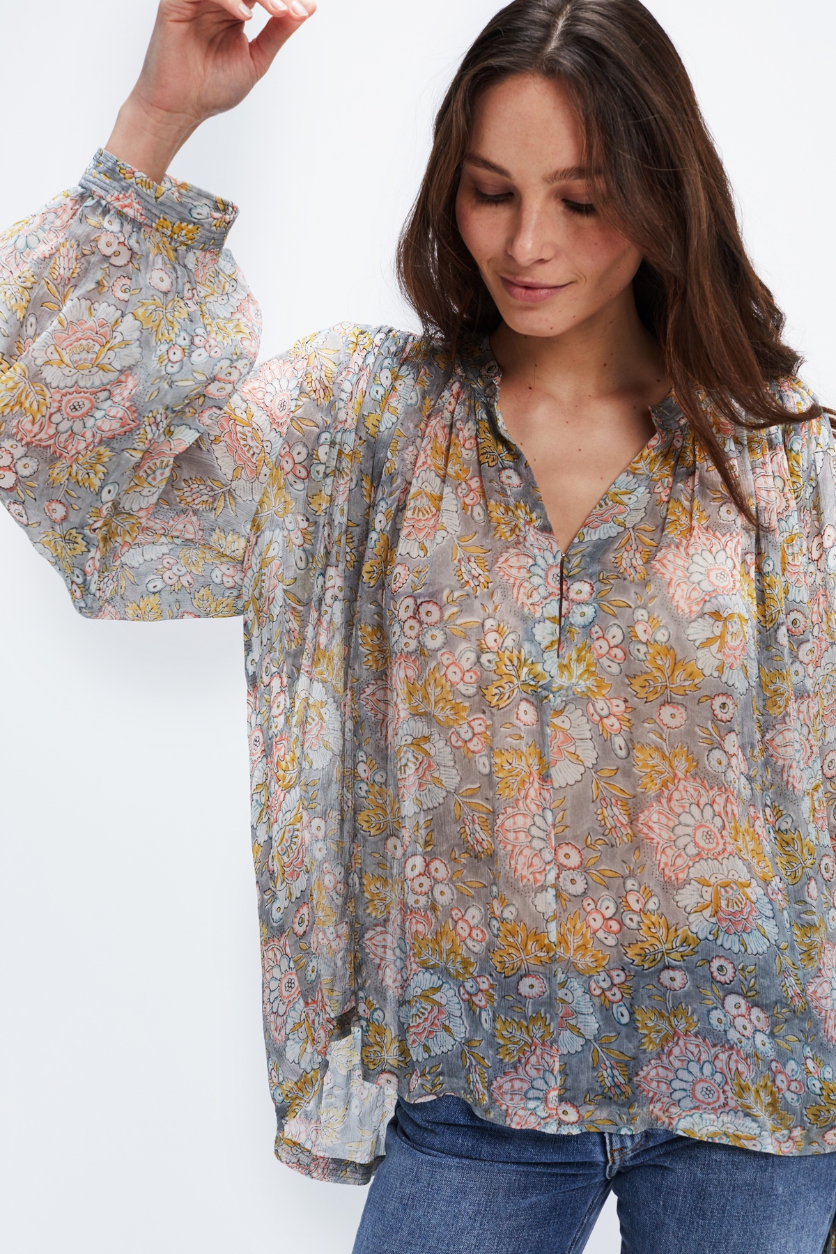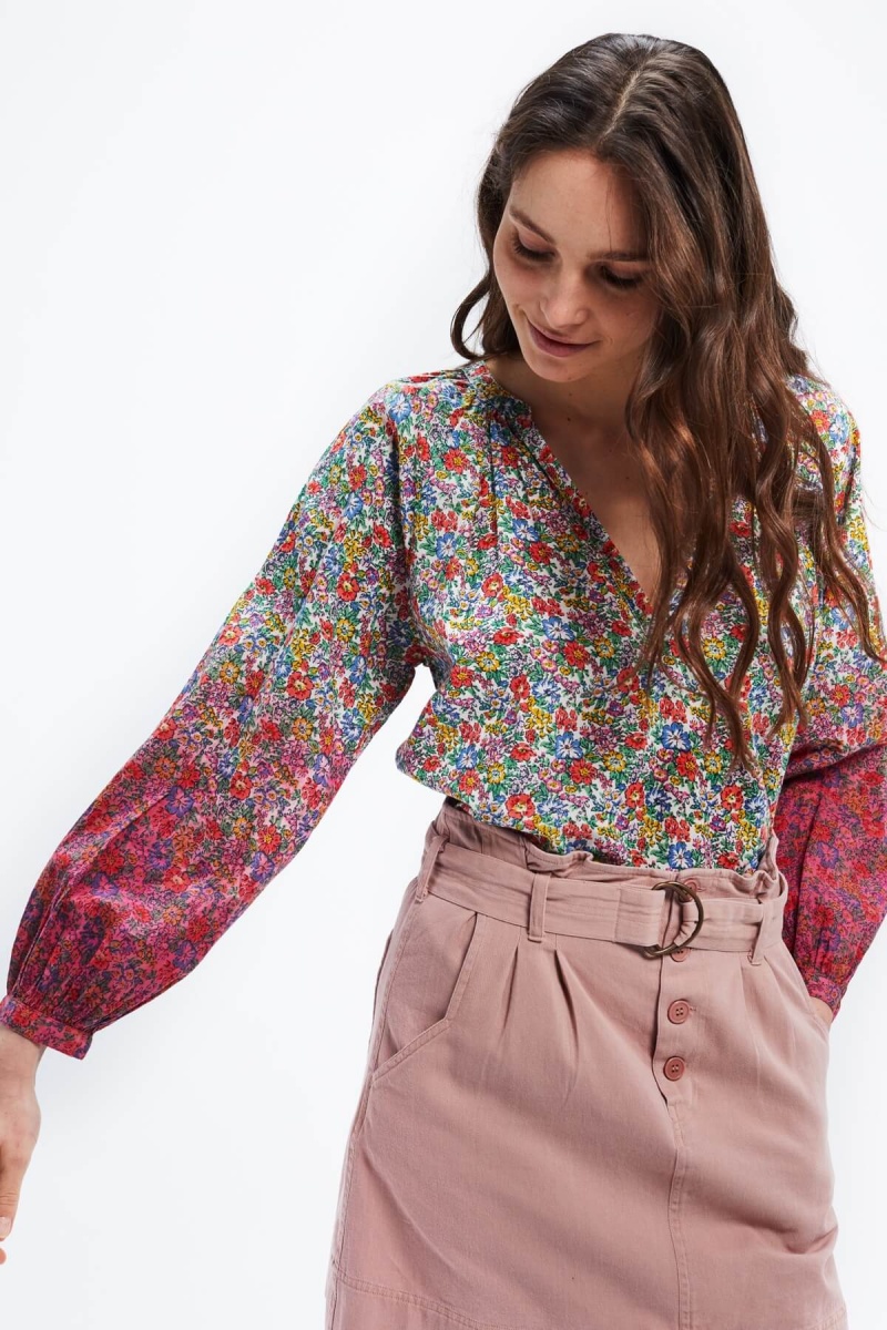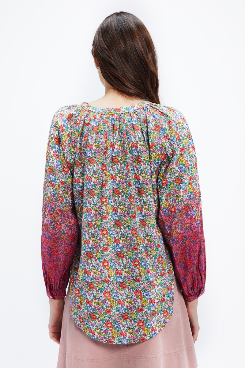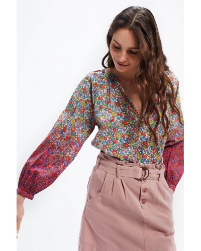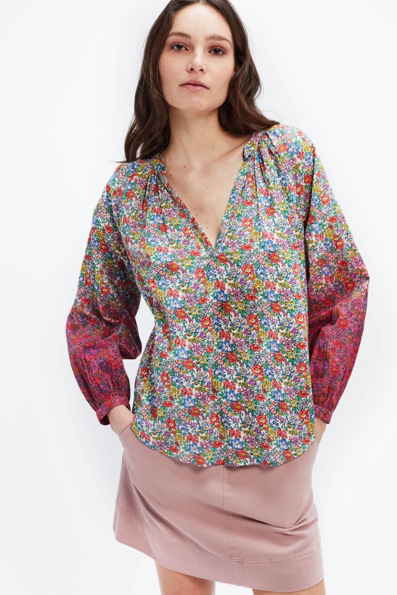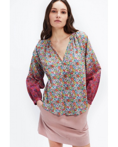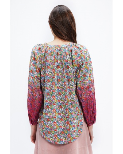 Viviani's blouse is made of cotton poplin with a liberty pattern and a viola dip-dye. Slip it casually over jeans for a romantic, casual look.