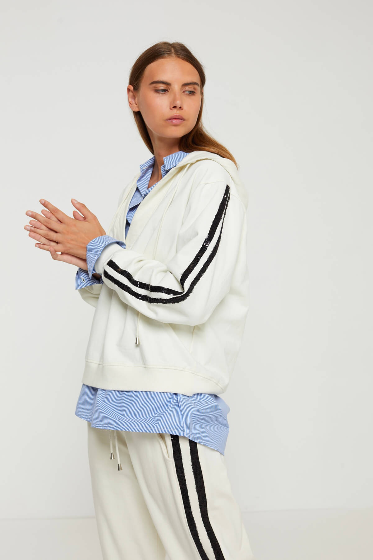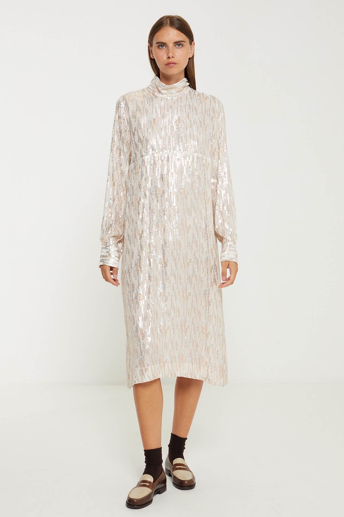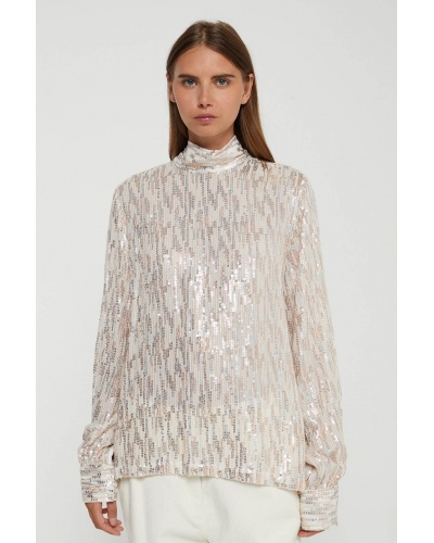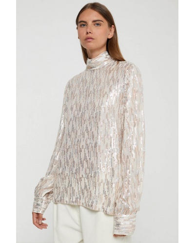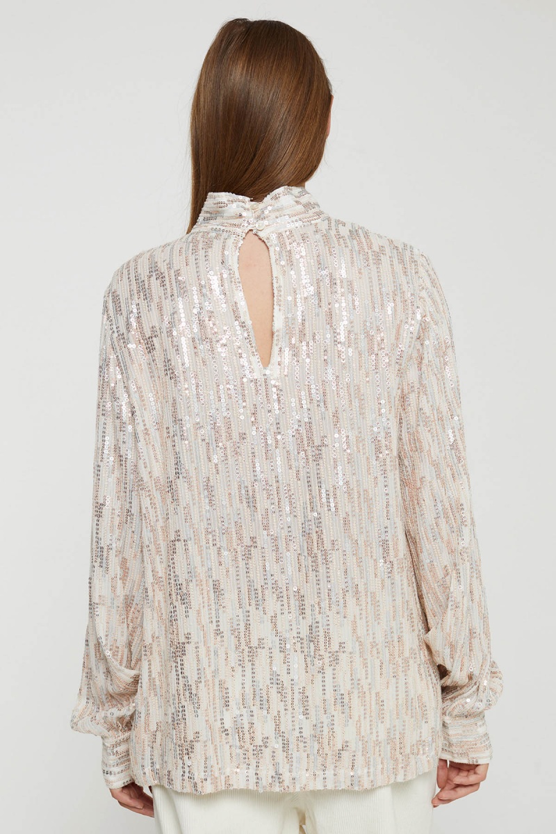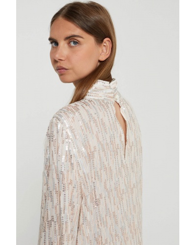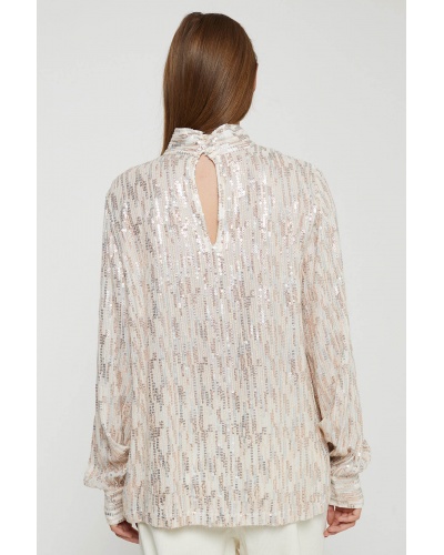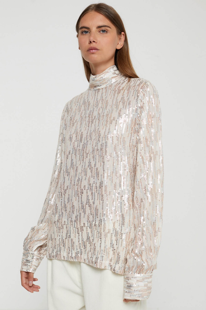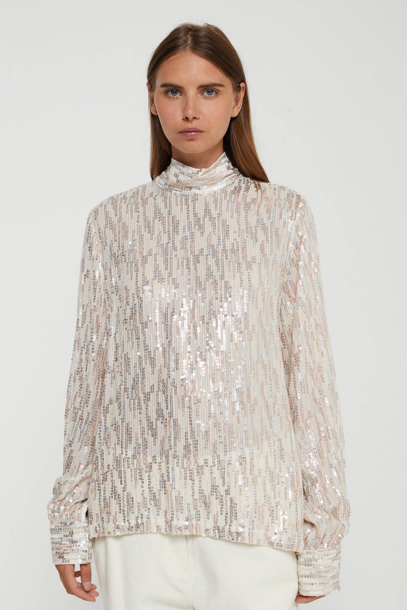 The entire blouse is adorned with pearly pink sequins, creating a bright and captivating effect. This abundance of sequins adds a festive dimension to your outfit, perfect for special occasions or even better: the festive season.