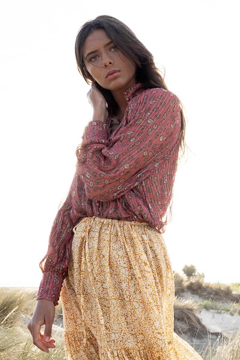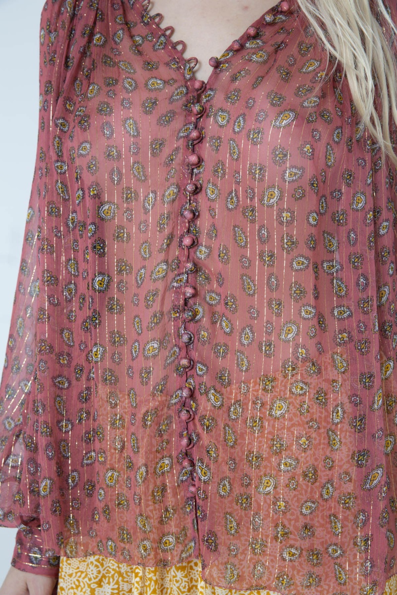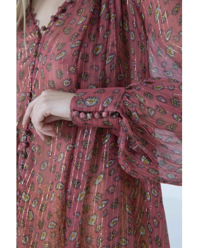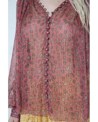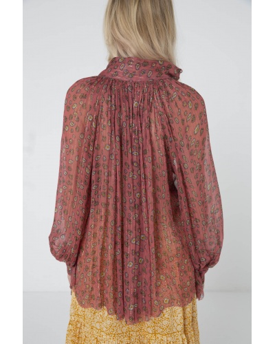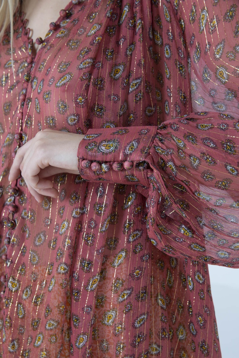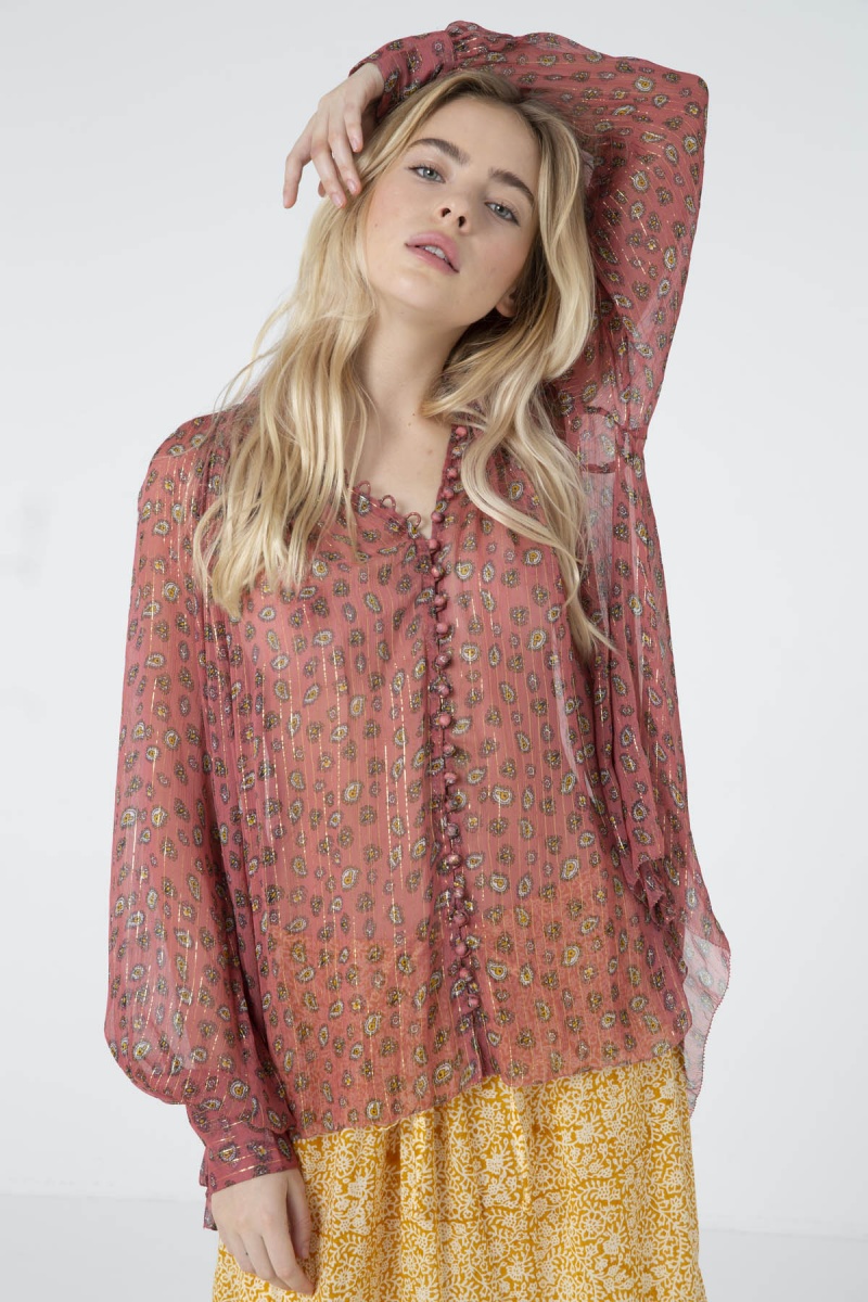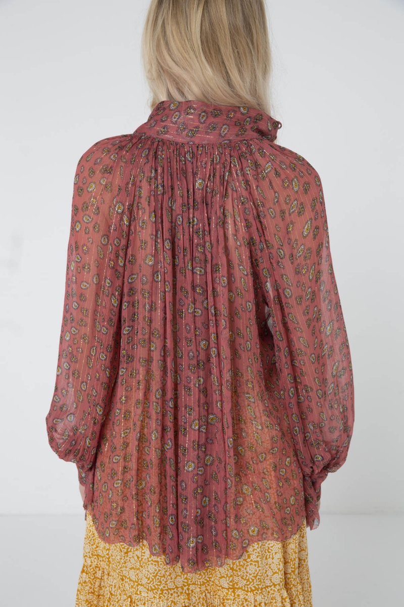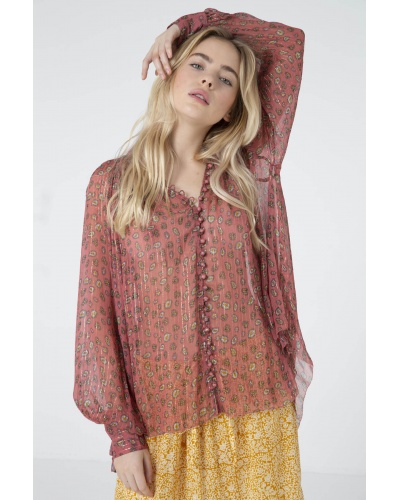 Patterned flowing shirt . Loose fit  . Shirt collar . Button closure . Long sleeves  . Buttoned puffed cuffs . Slightly transparent