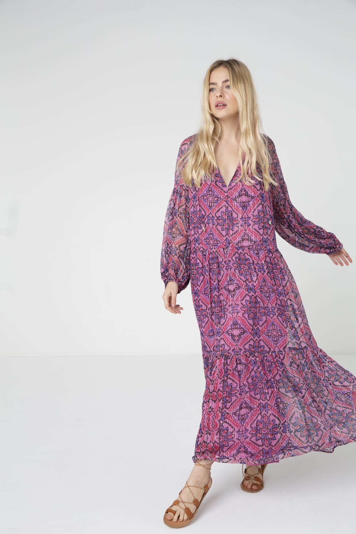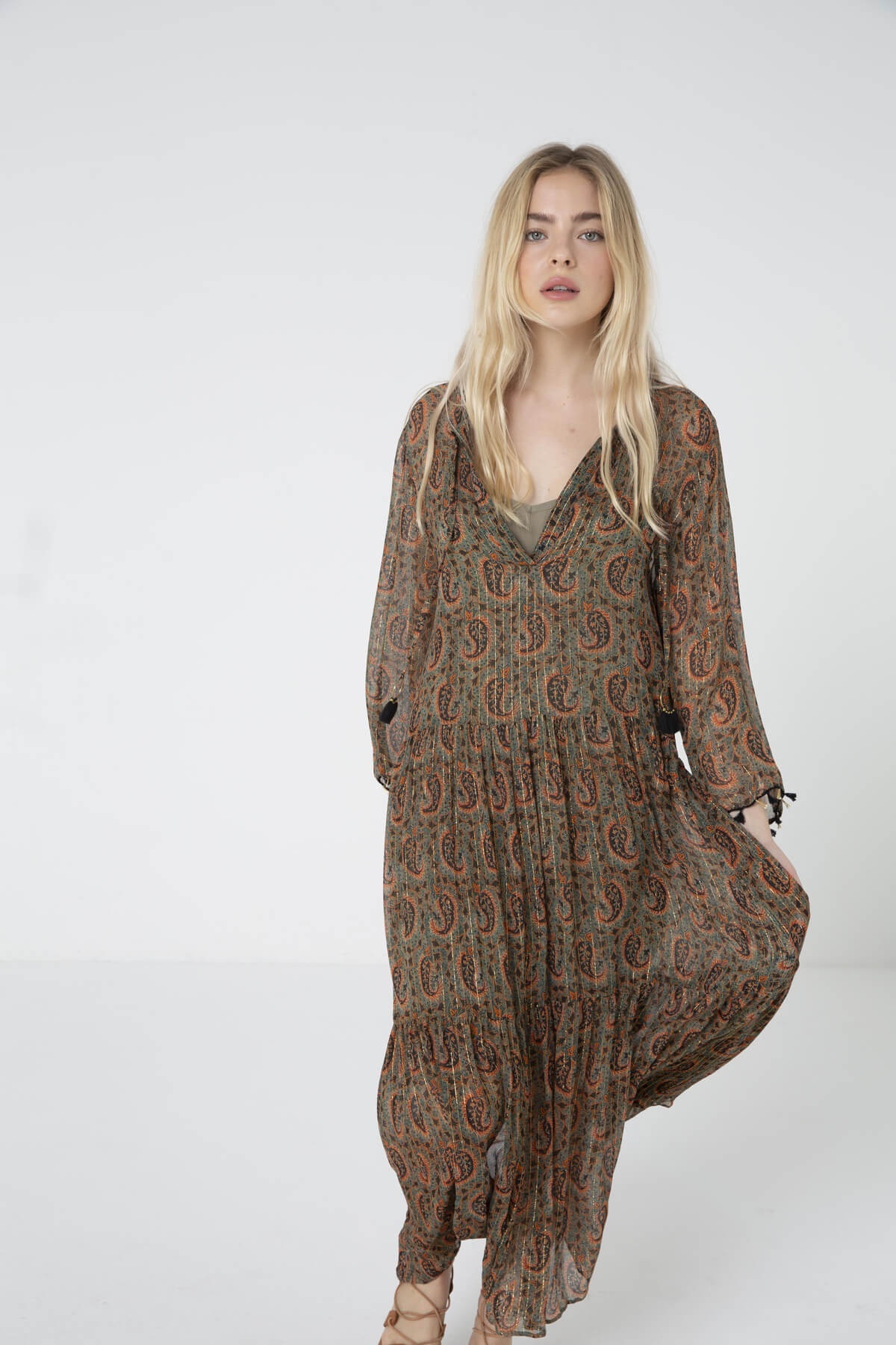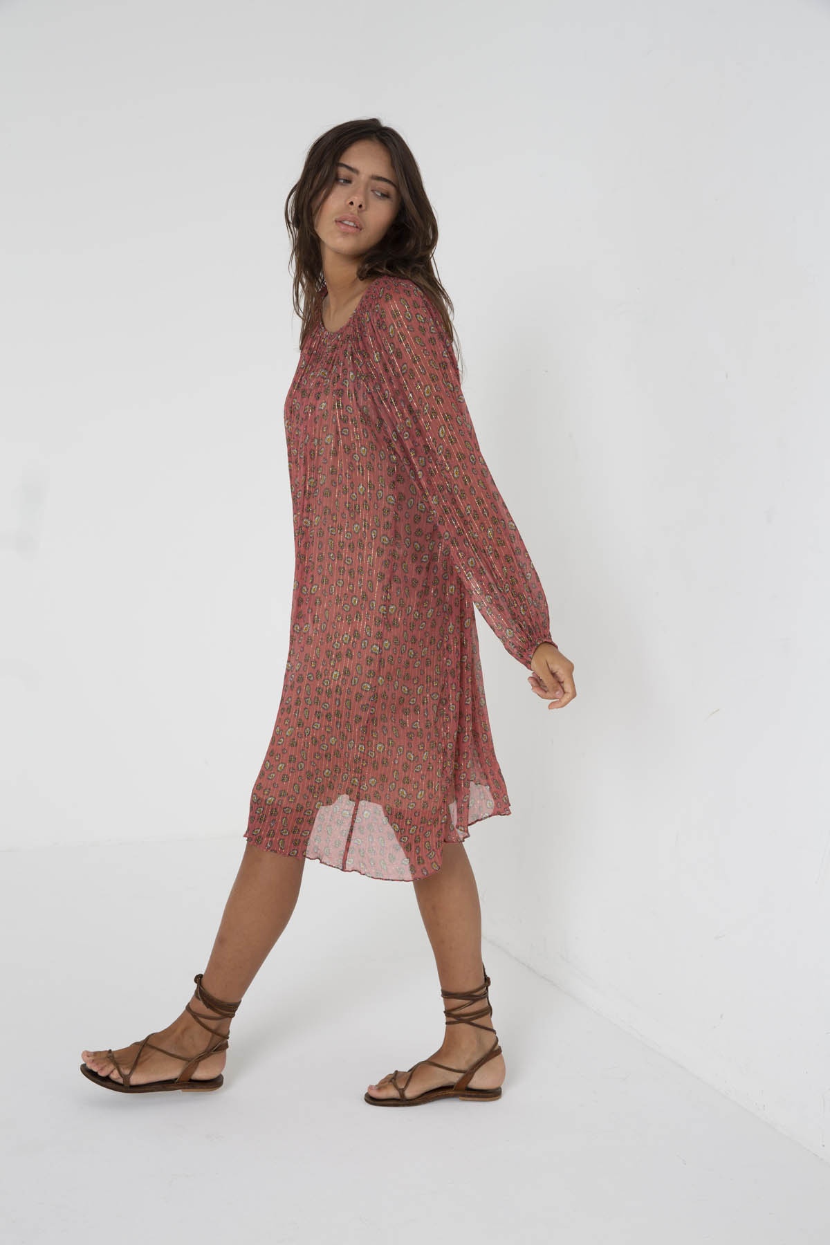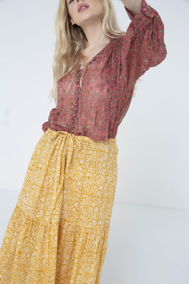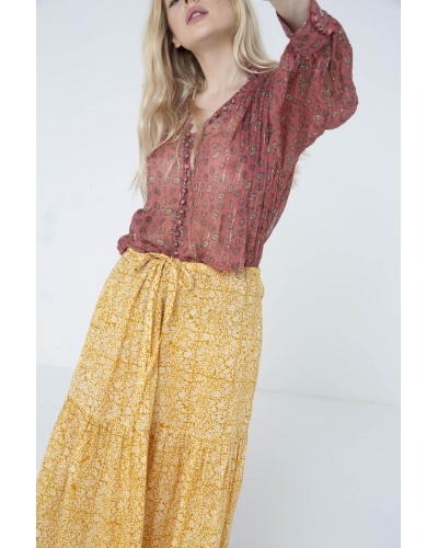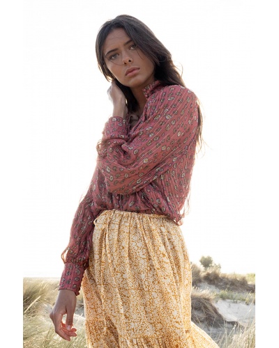 Patterned flowing shirt . Loose fit  . Shirt collar . Button closure . Long sleeves  . Buttoned puffed cuffs . Slightly transparent