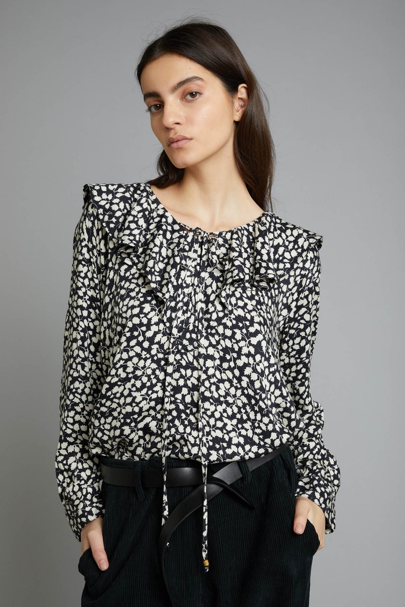 The Ruffle blouse seduces with its timeless black and white floral print and romantic allure. It is enhanced by a delicate ruffled collar that frames the décolleté and is extended by a tie, offering a refined, adjustable touch.