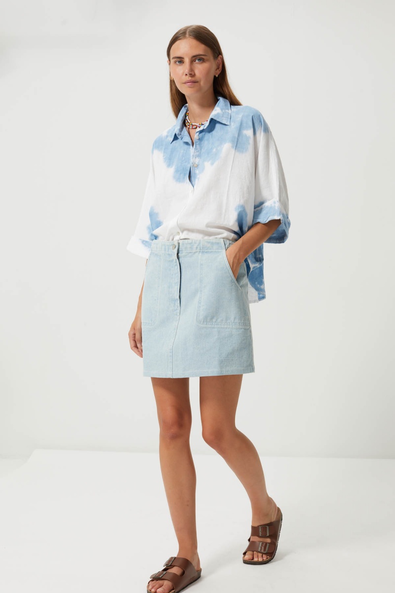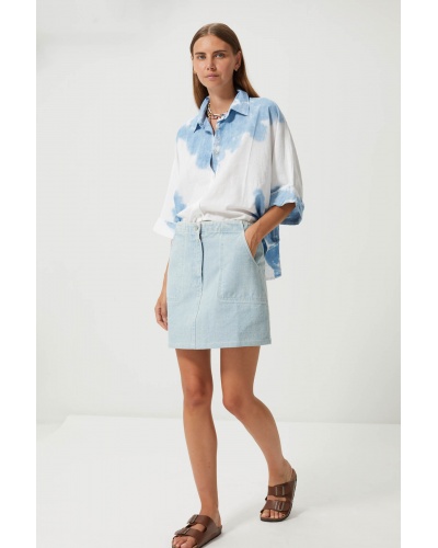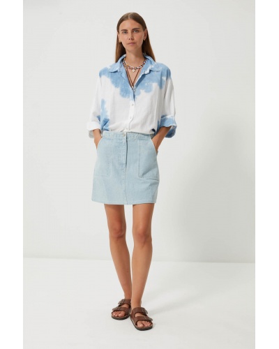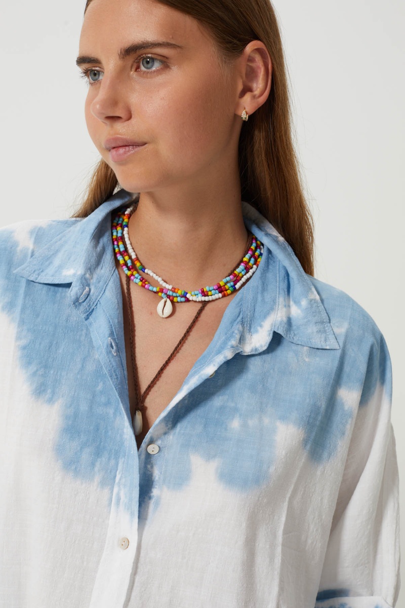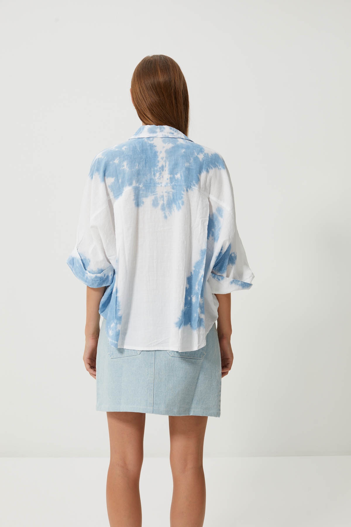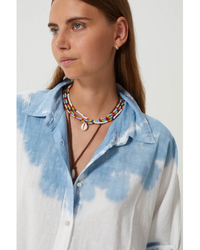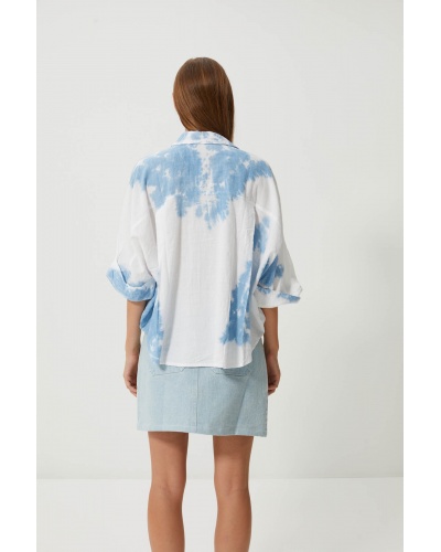 Let yourself be seduced by the Arlong shirt, a fluid, luminous piece with a blue tie & dye pattern evoking the softness of clouds on a dazzling white background.