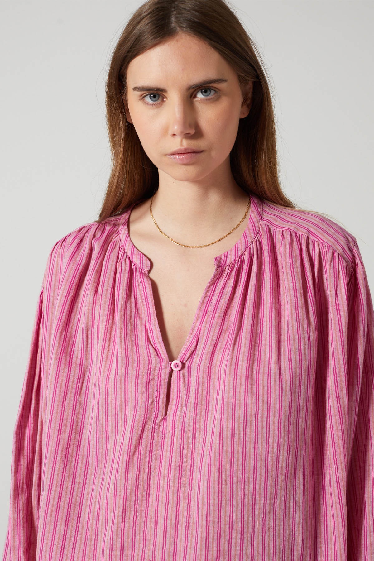 Its delicate smocked collar adds a refined touch, while its long, slightly puffed sleeves add a subtle fluidity.