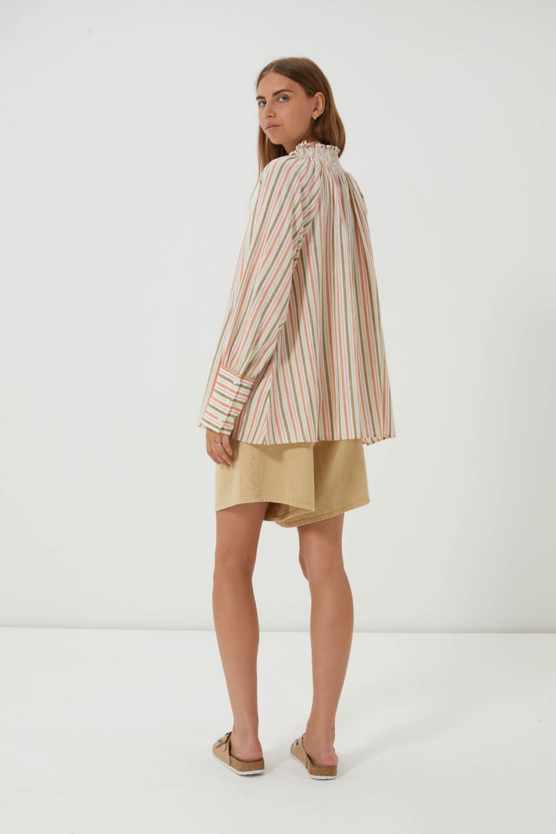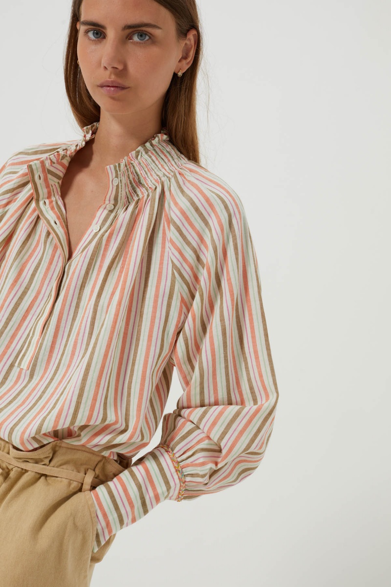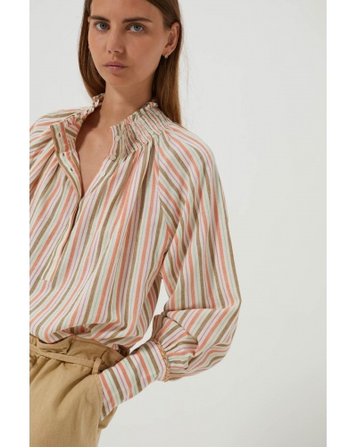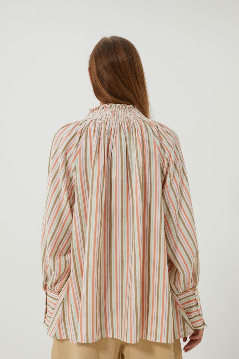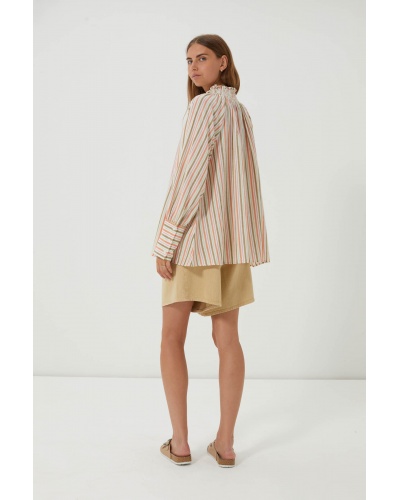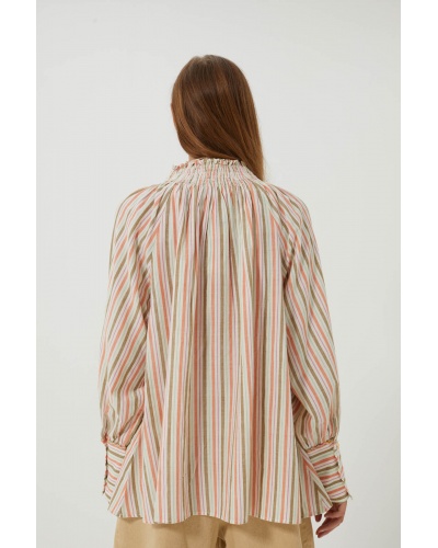Its delicate smocked collar adds a refined touch, while its long, slightly puffed sleeves add a subtle fluidity.