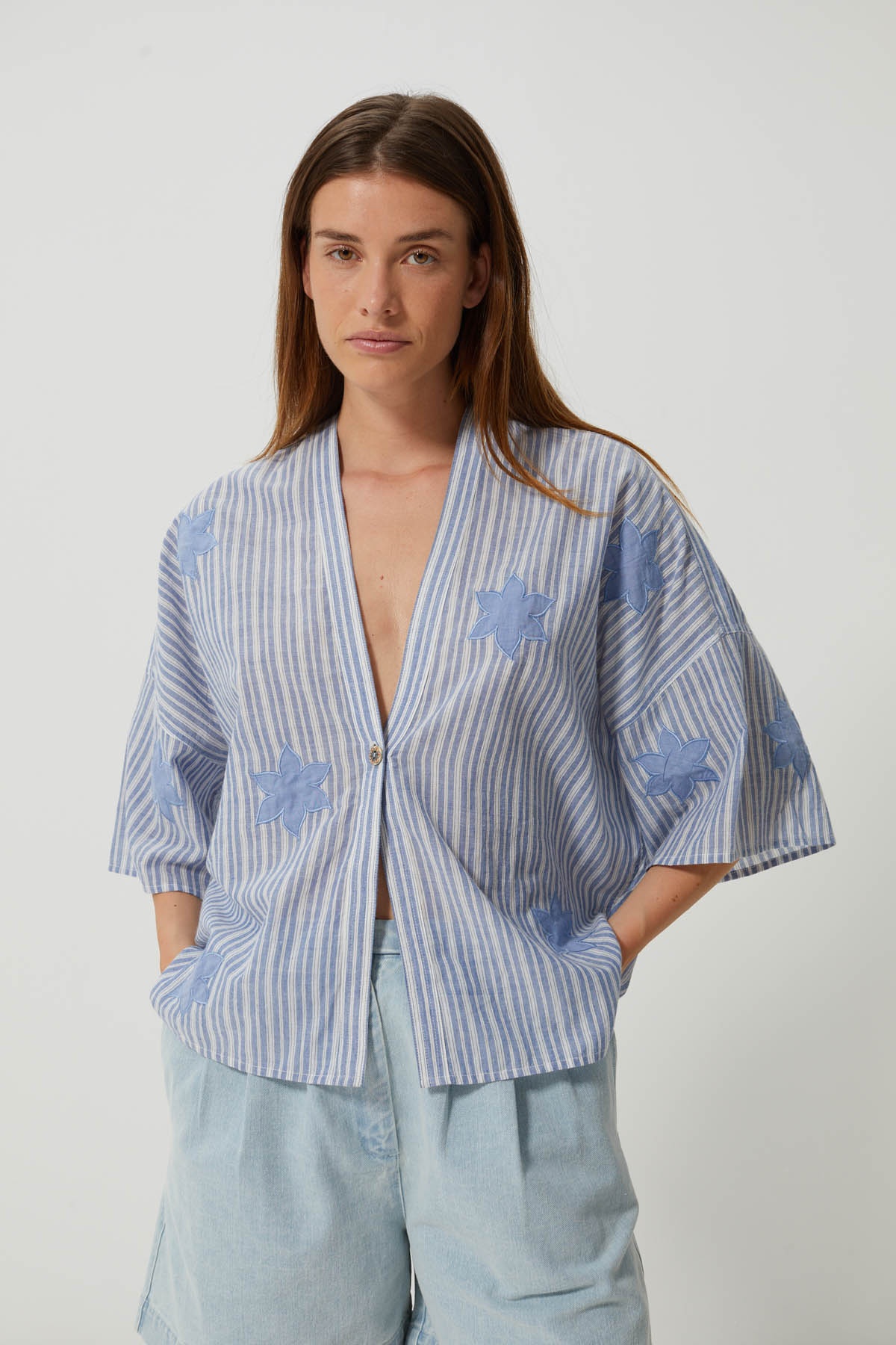 Its blue stripe pattern, embellished with embroidered flowers, gives this shirt a refined, bohemian feel, ideal for a light-hearted summer look.