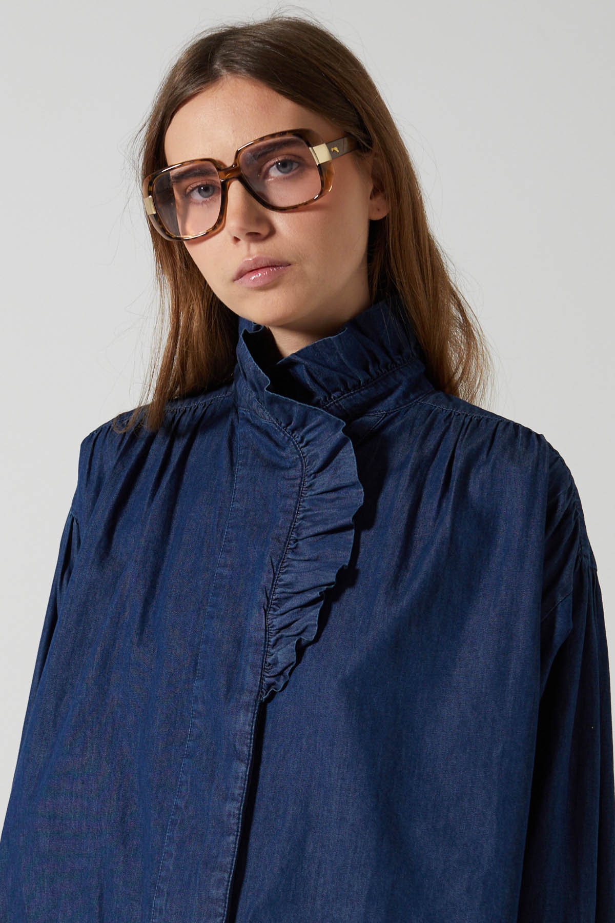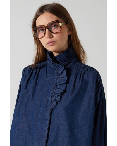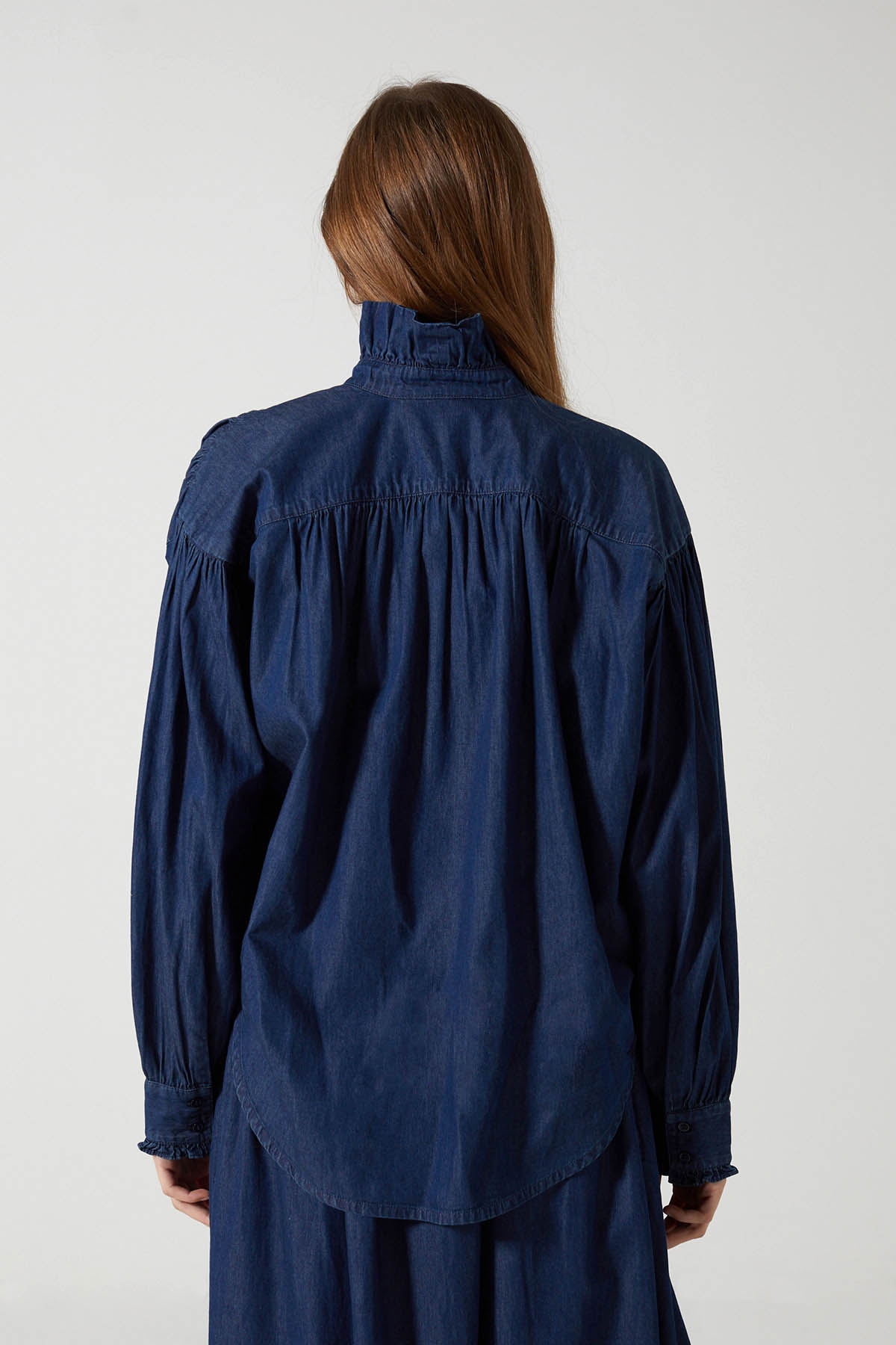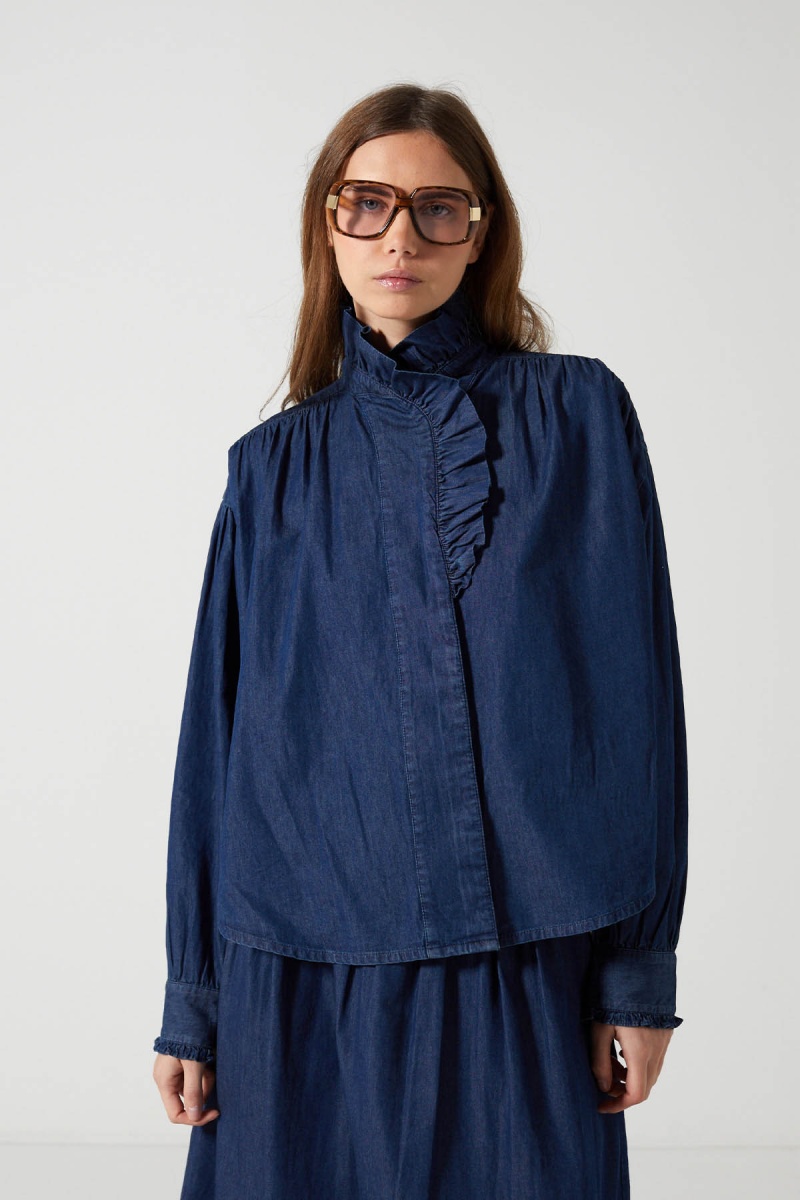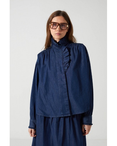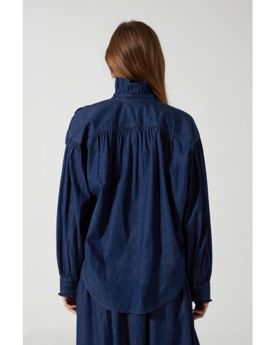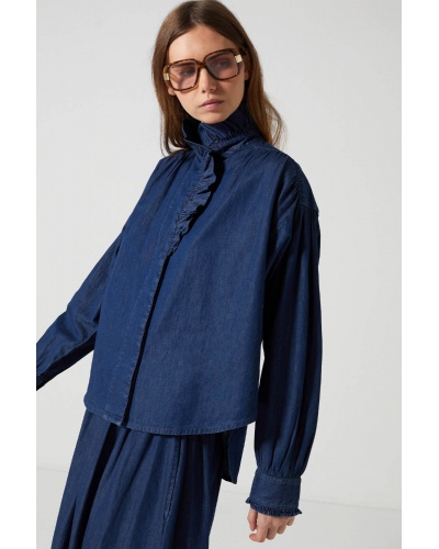 The Alice top revisits denim with a poetic and refined touch. It stands out with its high collar adorned with ruffles, giving it a modern romantic look. A chic and easy-to-wear essential that elegantly accompanies the transition to autumn.