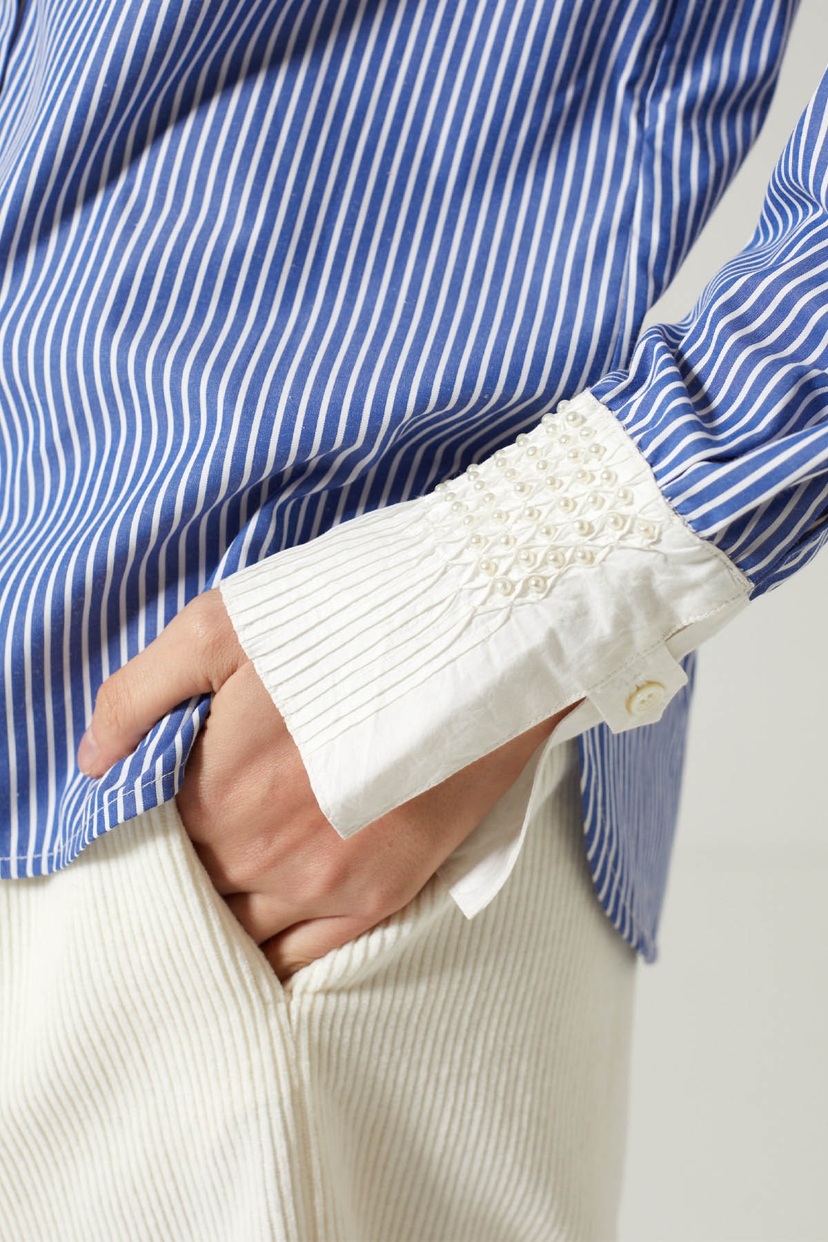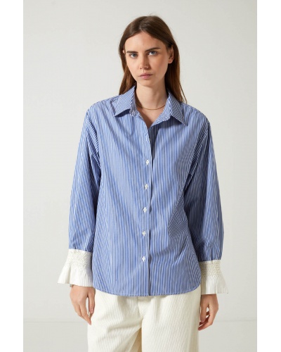 The Avaline shirt revisits a classic wardrobe staple with a distinctly feminine touch. Crafted from blue and white striped cotton, it stands out with its smocked cuffs in contrasting embroidered poplin fabric embellished with pearls.