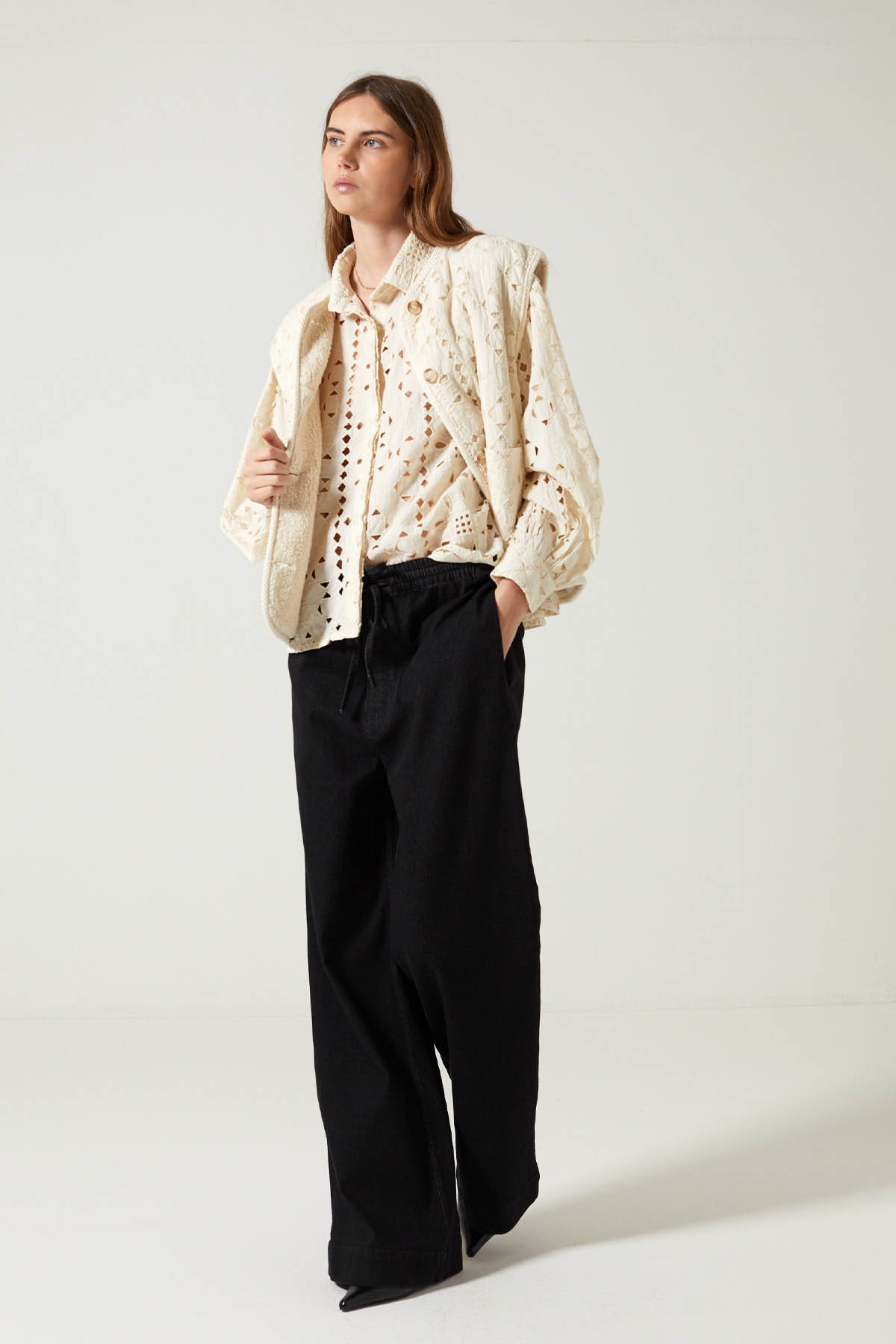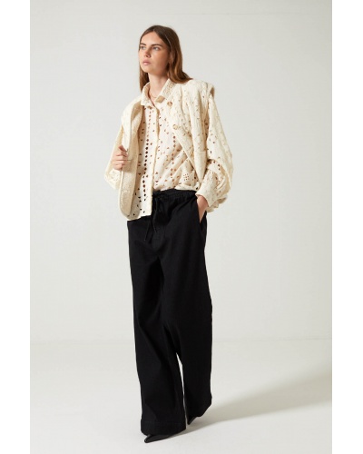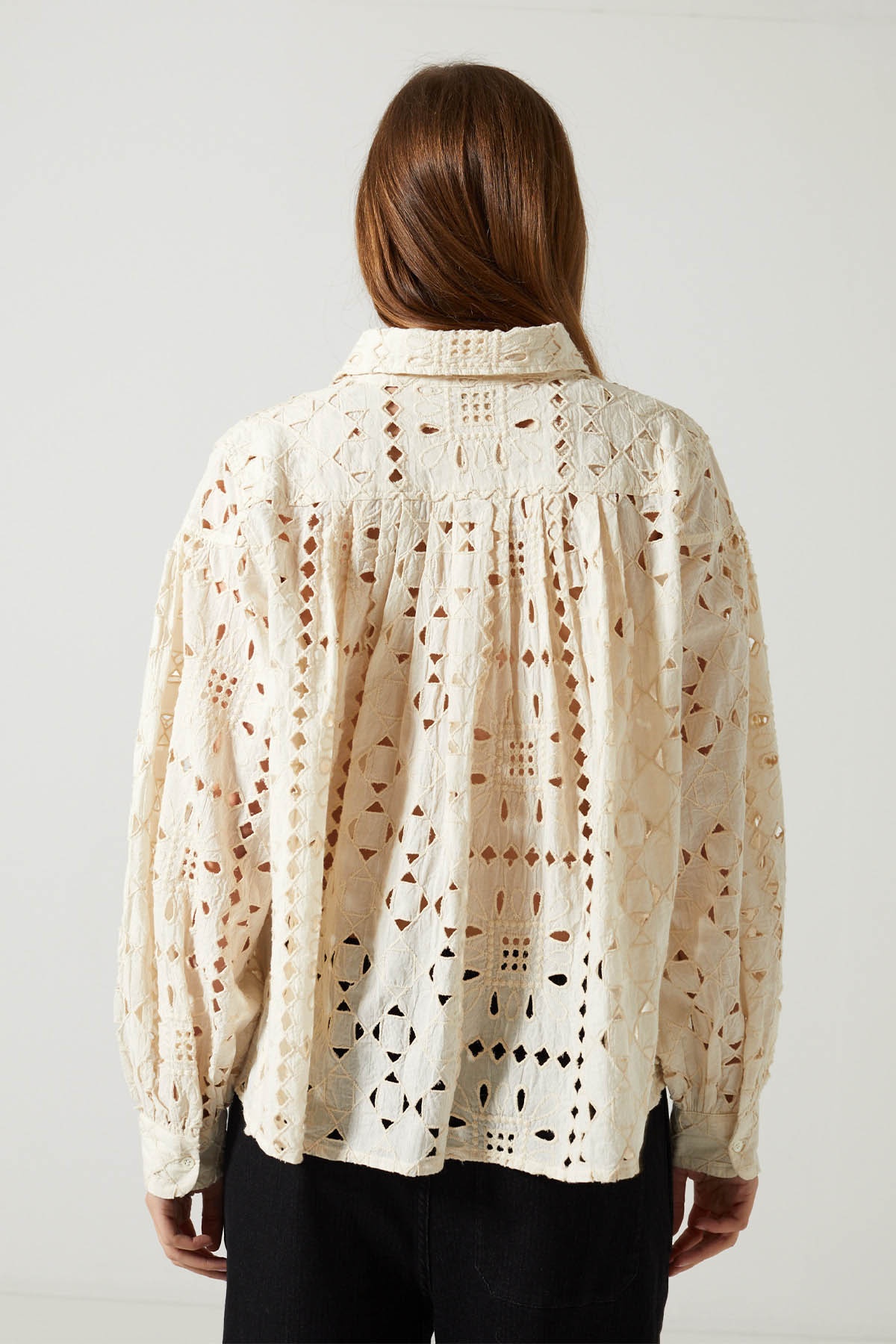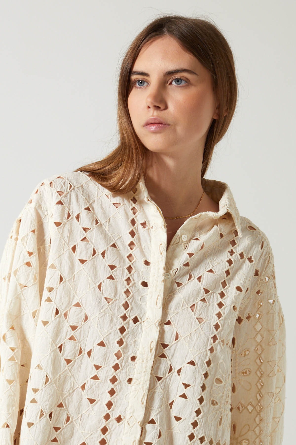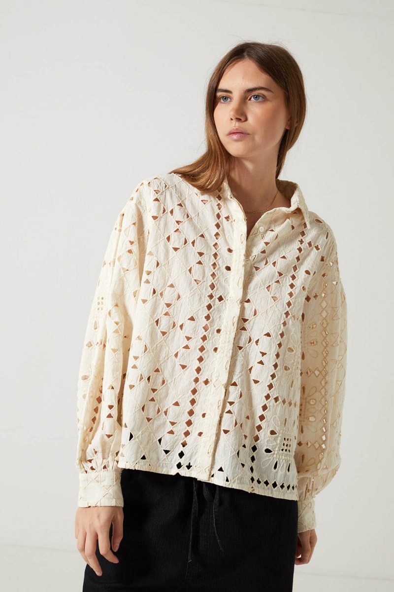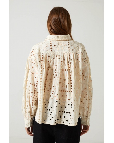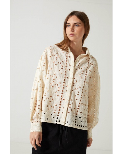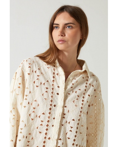 The Louma shirt captivates with its delicacy and sheer fabric. Crafted in graphic embroidery, it reveals a delicate openwork pattern that plays with light and layering.