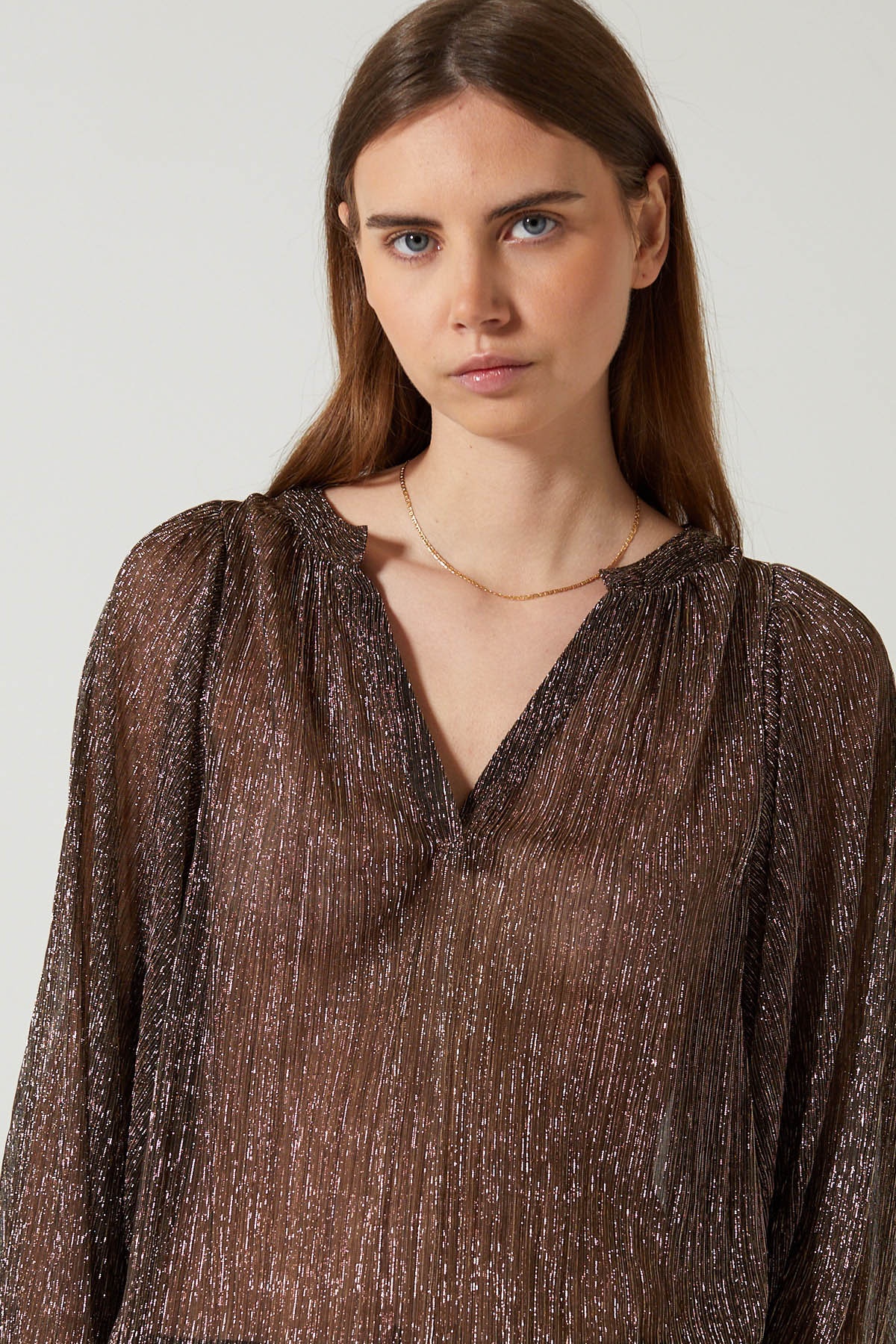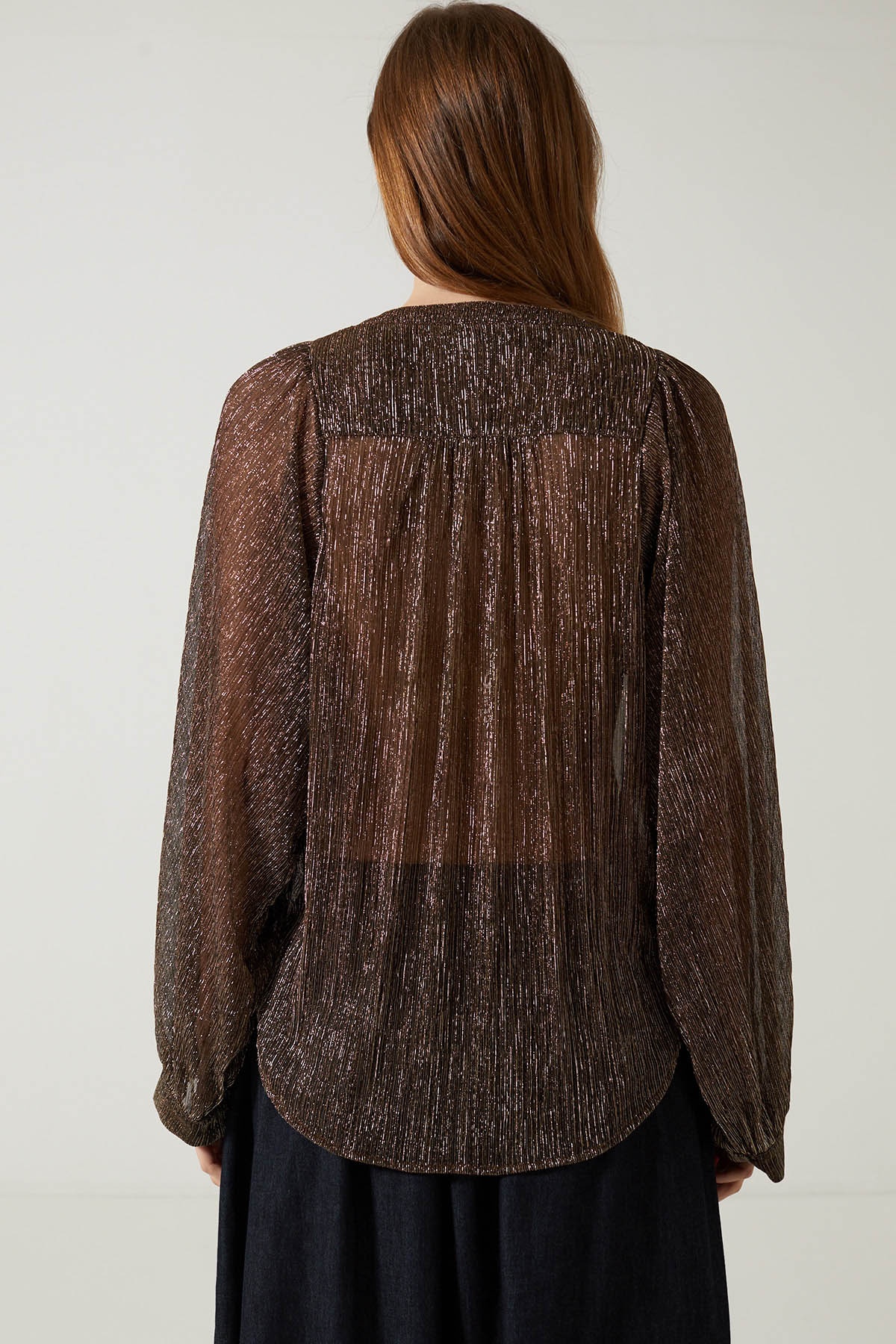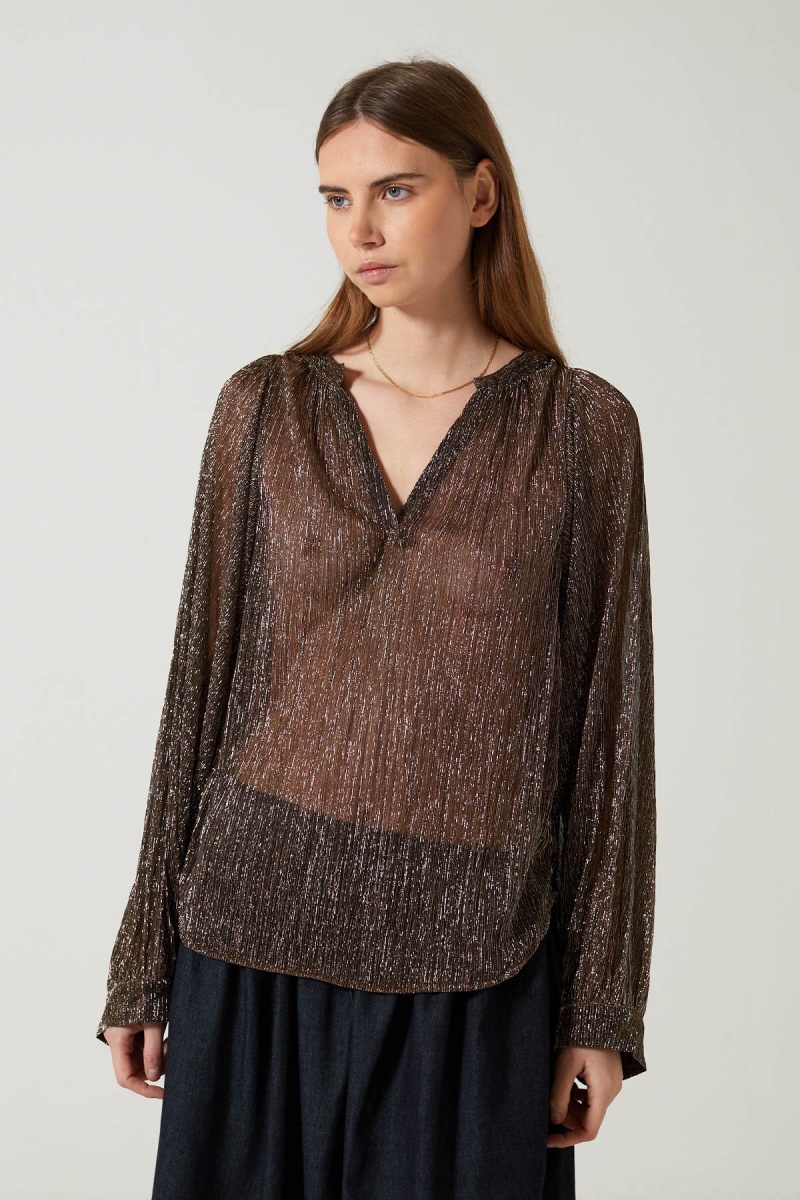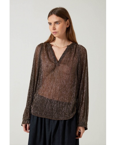 The Nikita blouse captivates with its delicate look and metallic sheen that elegantly catches the light. Crafted from a lightweight, slightly sheer voile fabric, it exudes confidence and femininity while maintaining a fluid silhouette that is easy to wear.