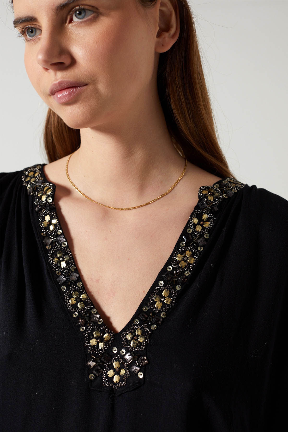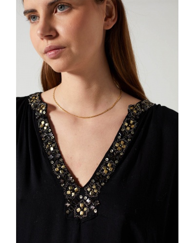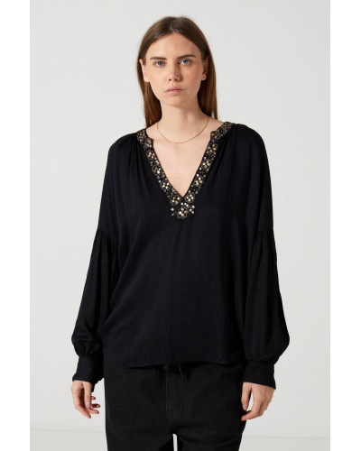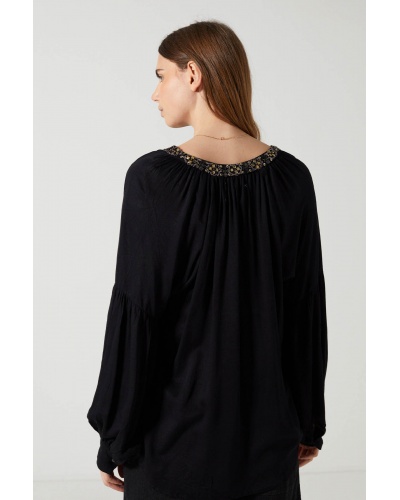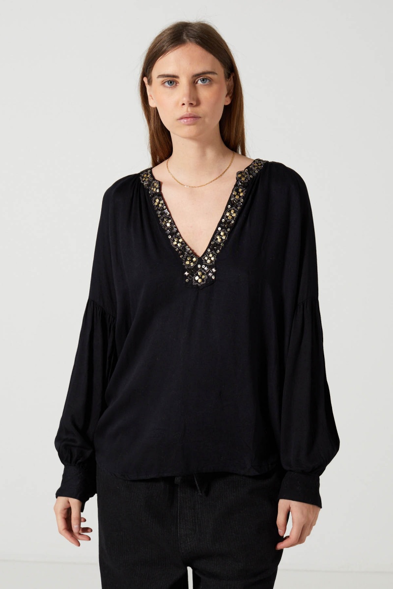 Crafted from flowing black rayon, the Original blouse captivates with its V-neckline embellished with pearl and sequin embroidery, adding a touch of luxury and sophistication.