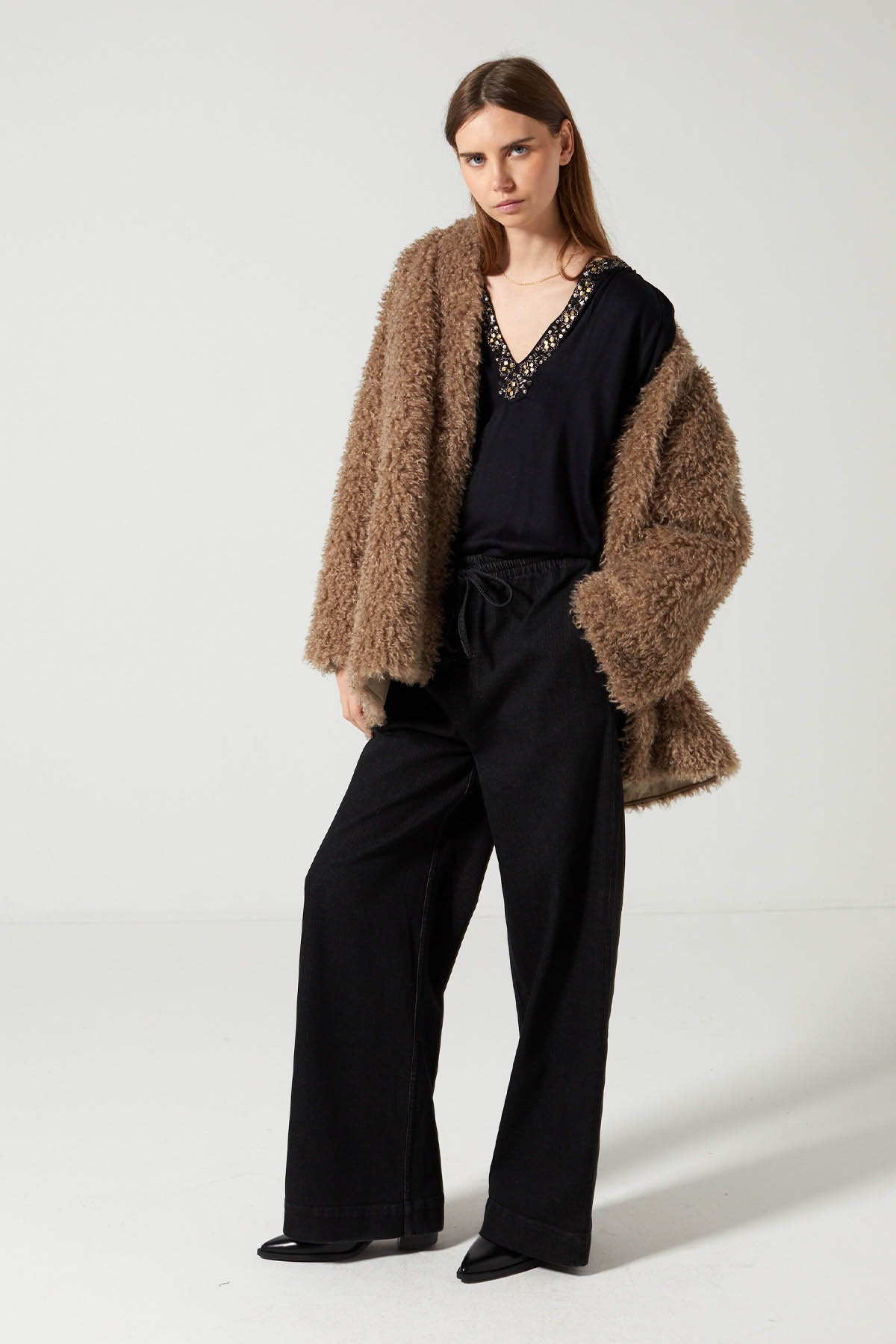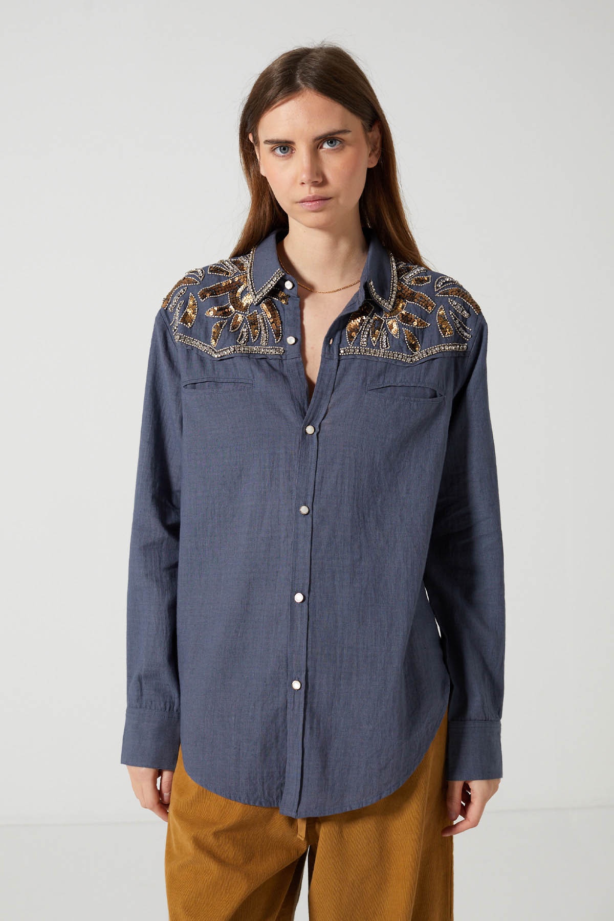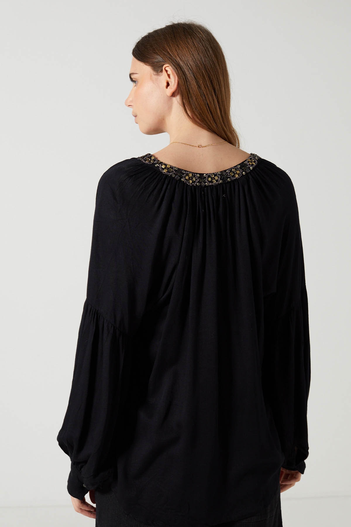 Crafted from flowing black rayon, the Original blouse captivates with its V-neckline embellished with pearl and sequin embroidery, adding a touch of luxury and sophistication.