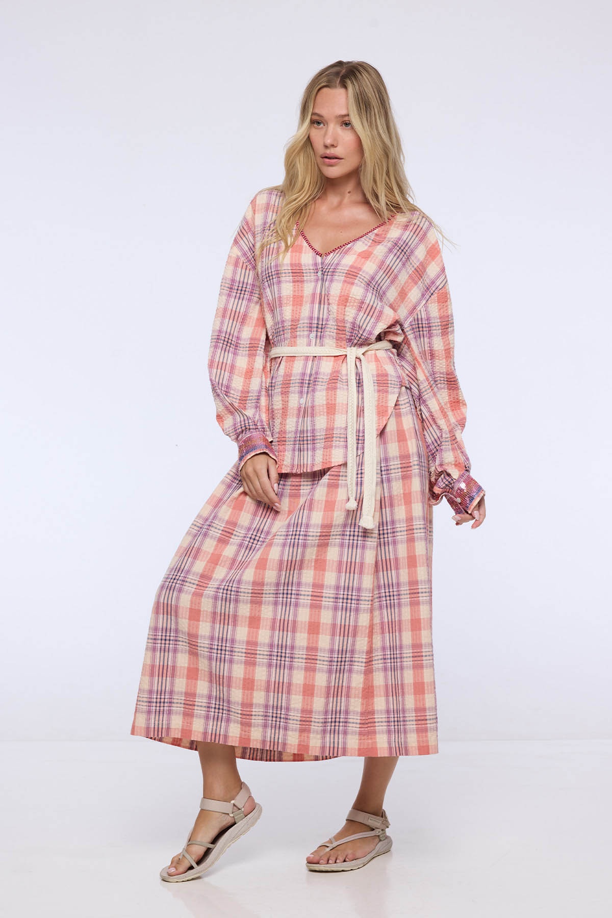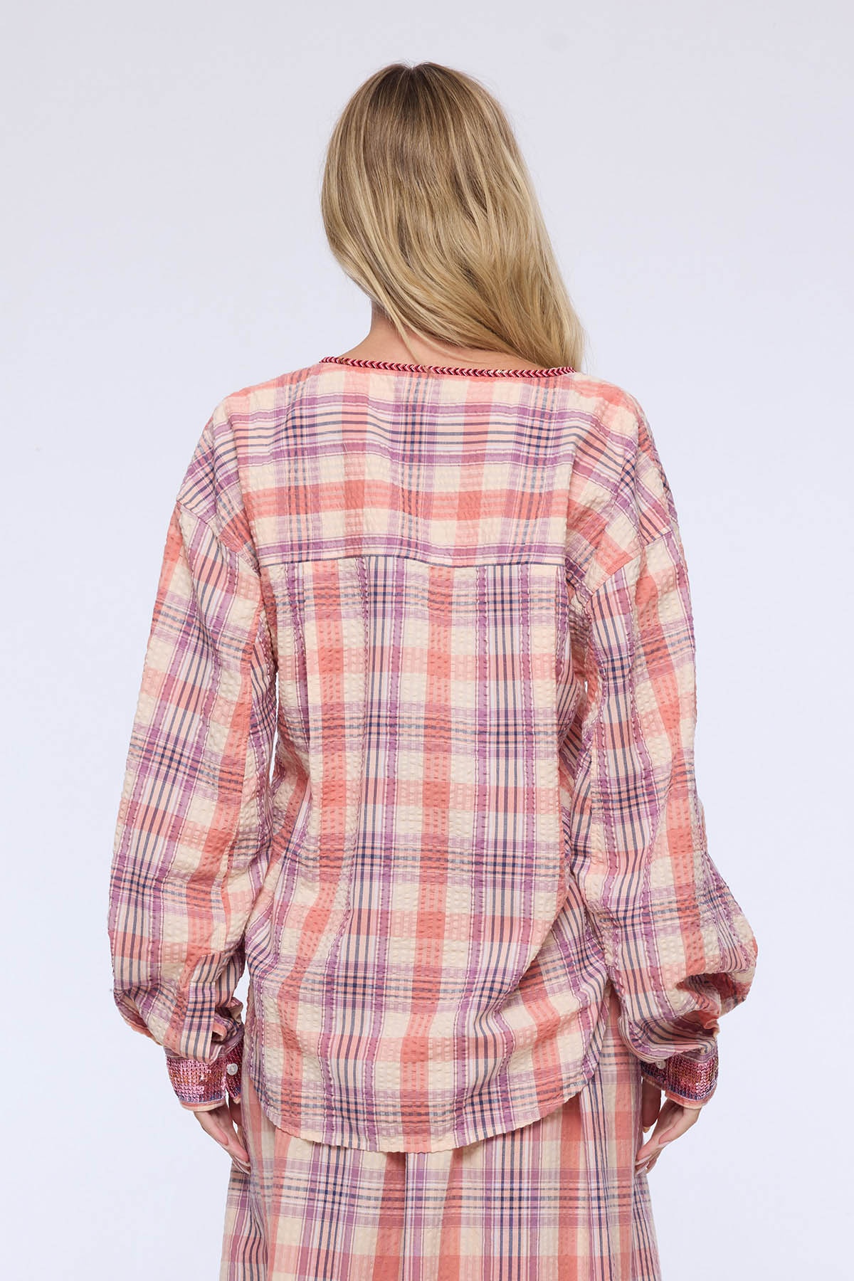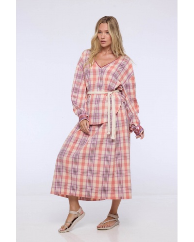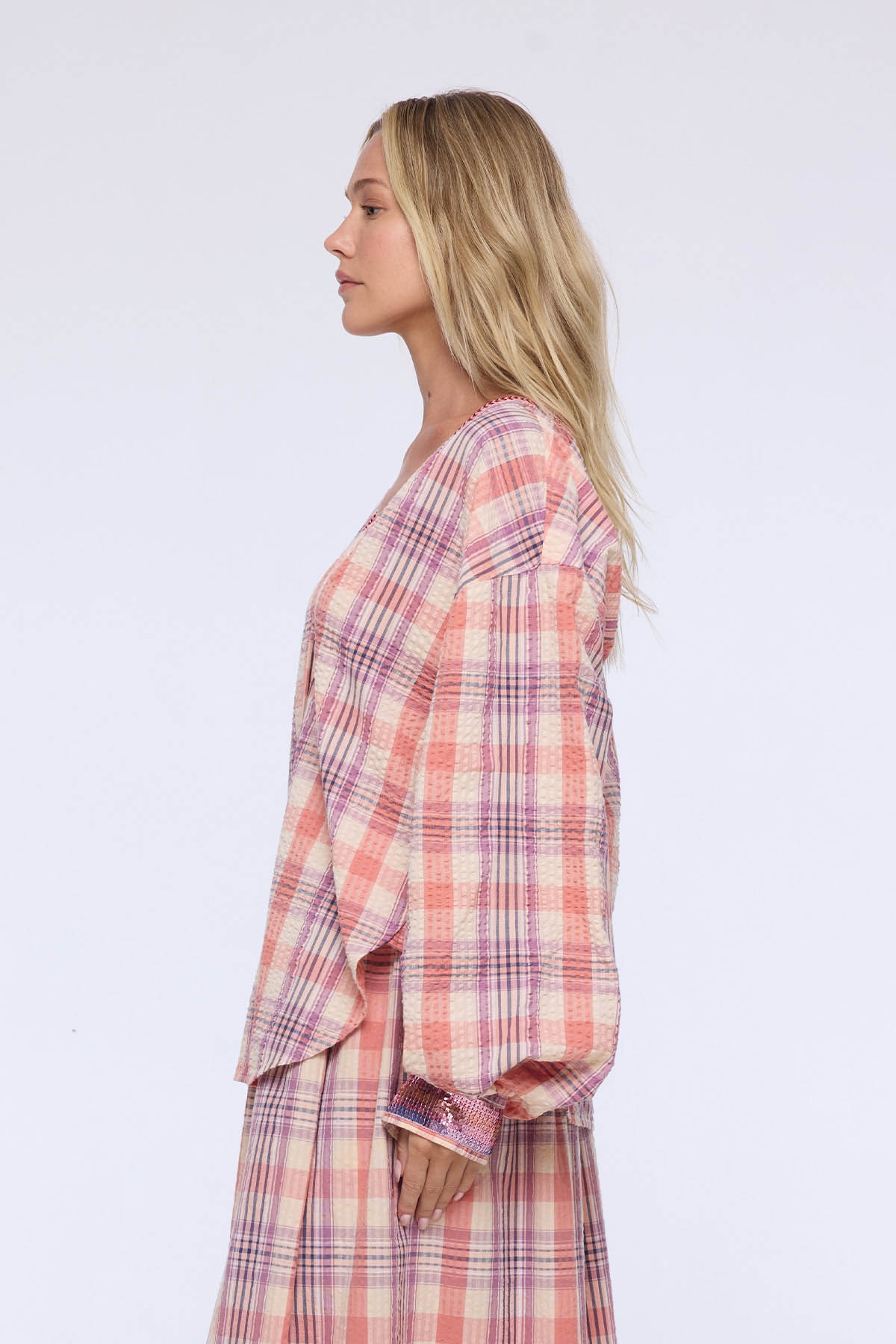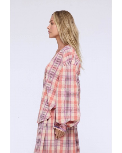 The Joli blouse is an irresistible feminine piece, designed to bring lightness and charm to your seasonal looks. Crafted from a waffle-weave fabric in shades of pink, peach, and purple, it offers a flowing drape and a soft feel that accentuate its romantic appeal.