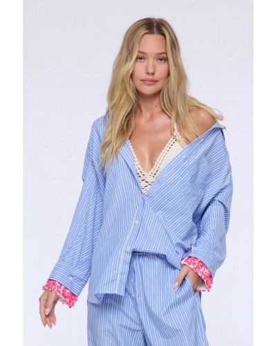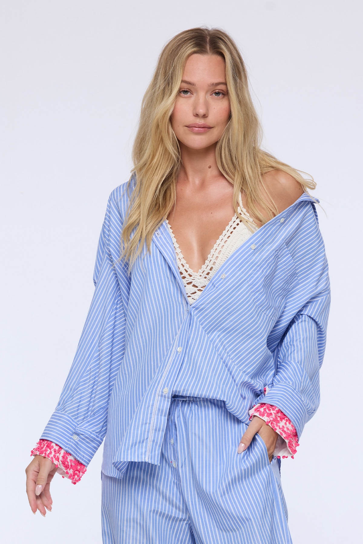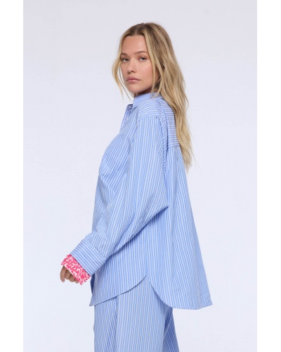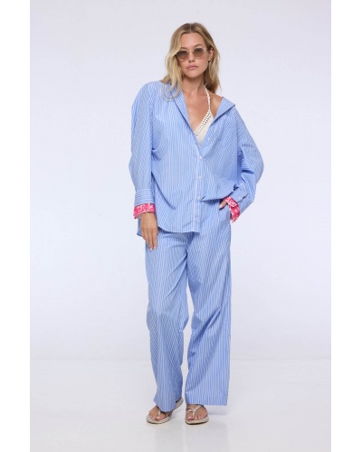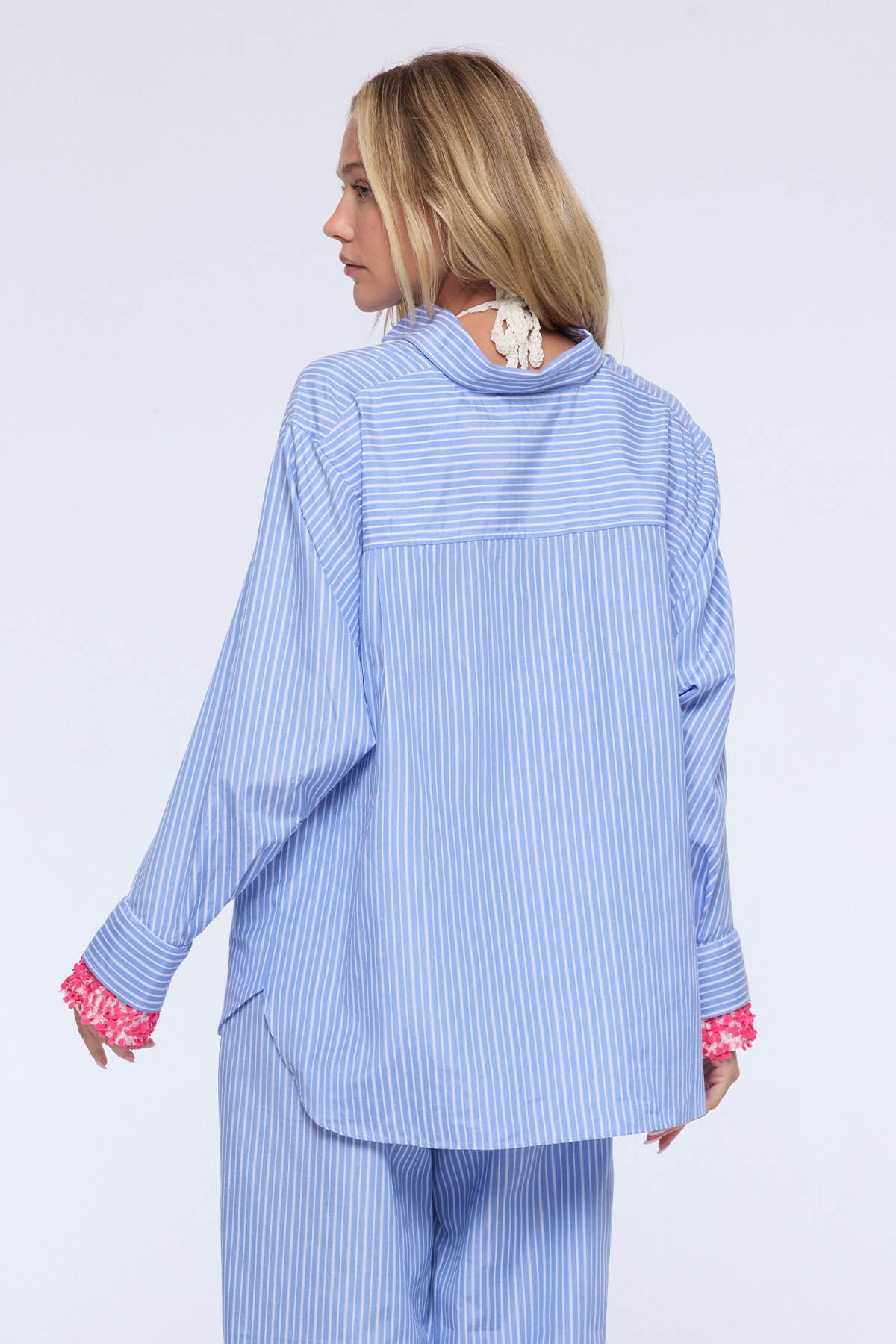 It stands out with its thin blue stripes and double cuffs, trimmed with fuchsia sequins, which add rhythm and originality to the silhouette. Long and oversized, wear it with matching pants for a unique and trendy total look.