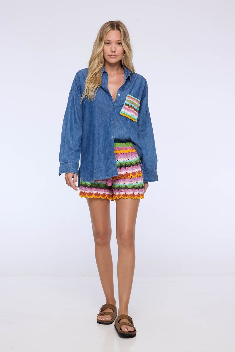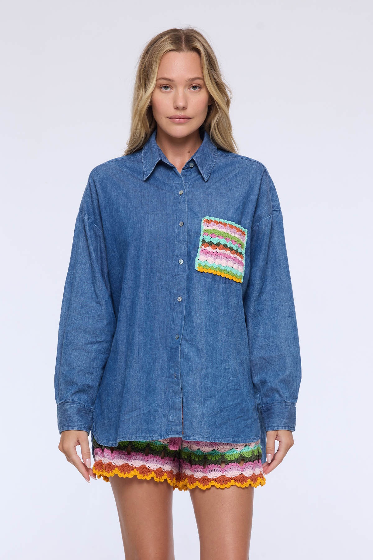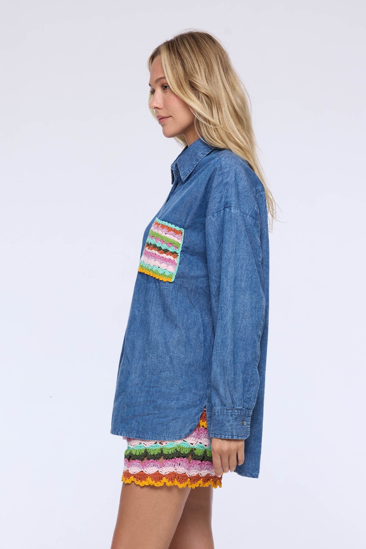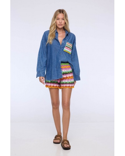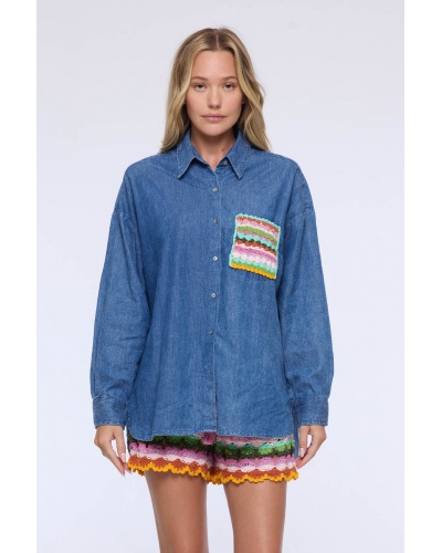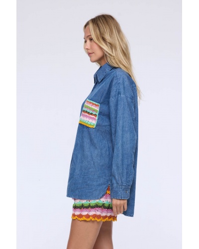 Its multicoloured crocheted breast pocket adds texture, colour and originality to the silhouette. This handcrafted detail contrasts subtly with the denim and gives the piece a unique identity.