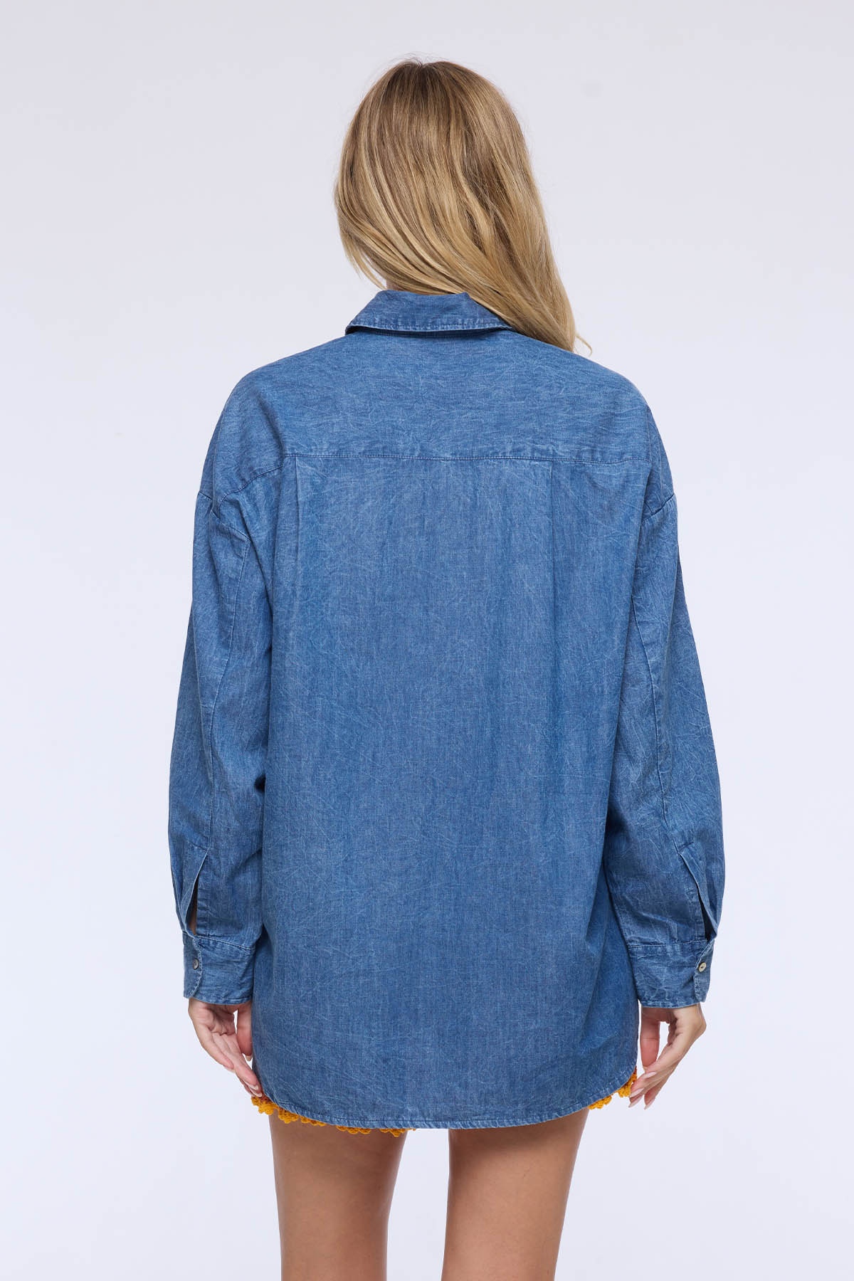 With its slightly loose fit, long sleeves and shirt collar, it can be worn buttoned up or open, with shorts or trousers, for a relaxed and on-trend style.
