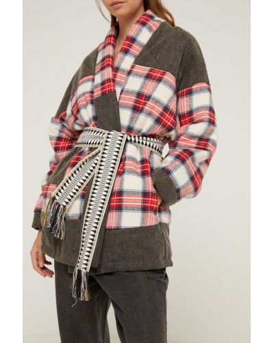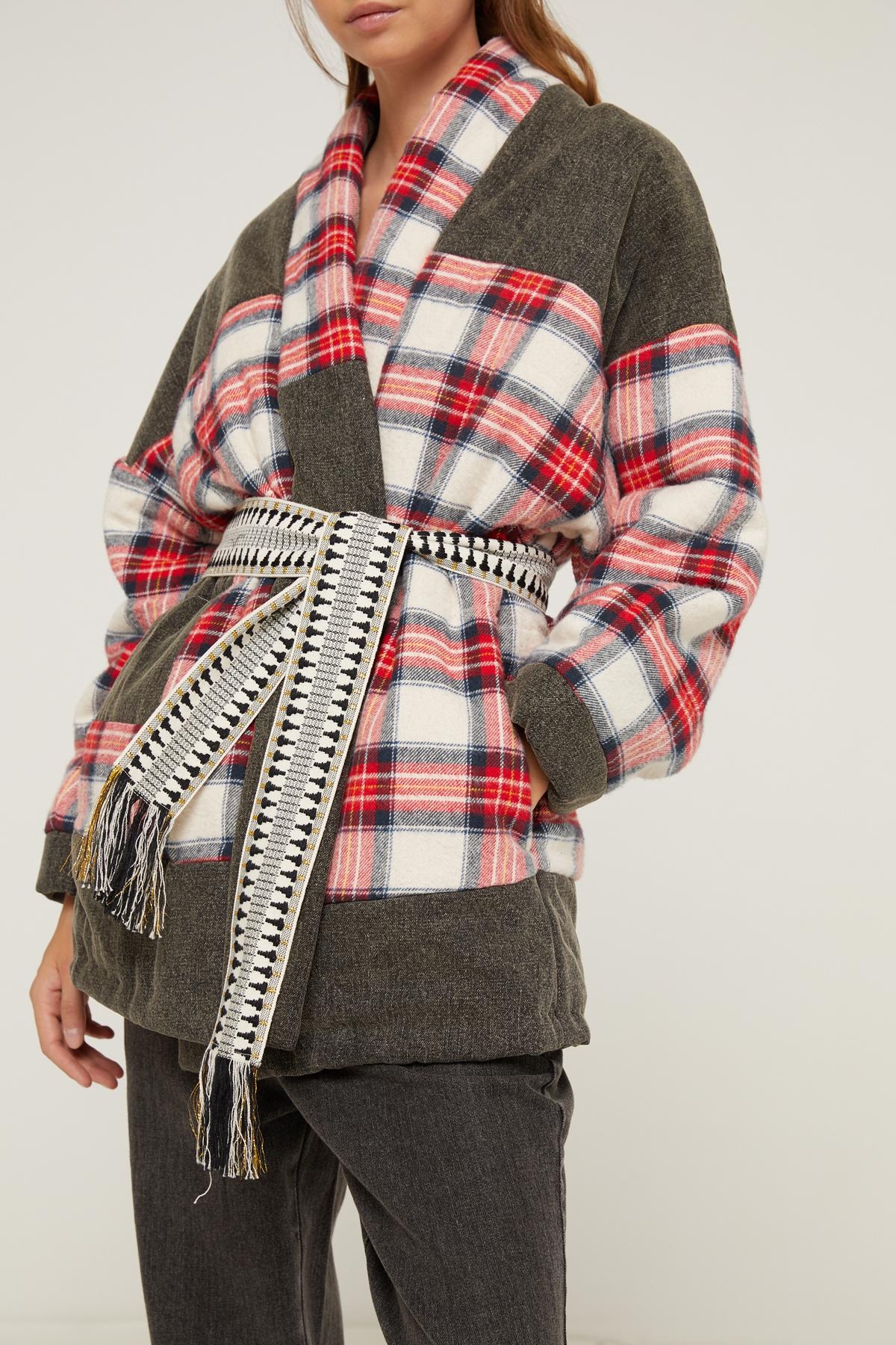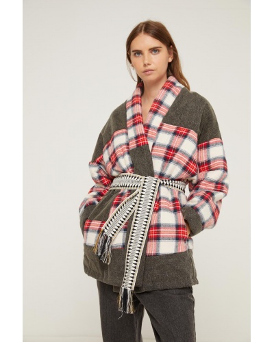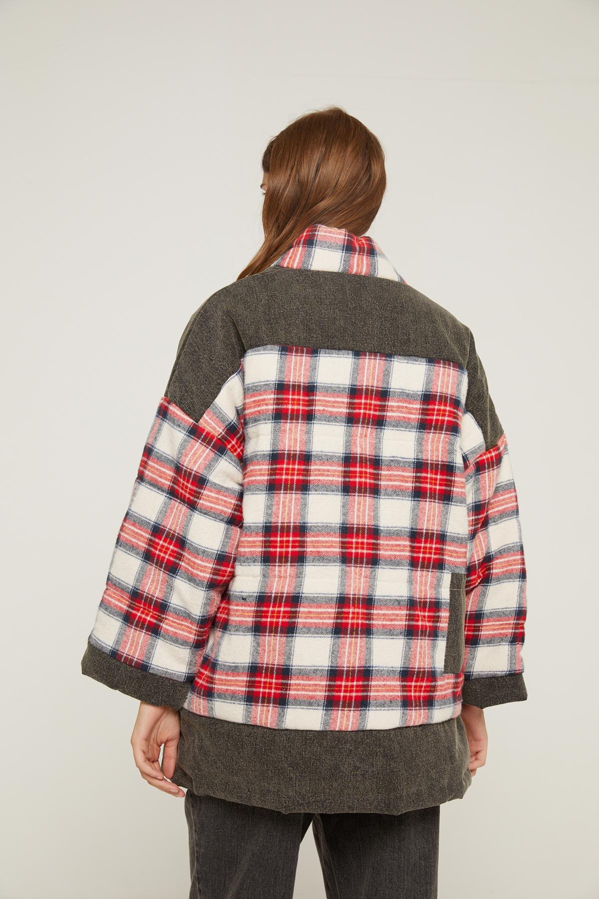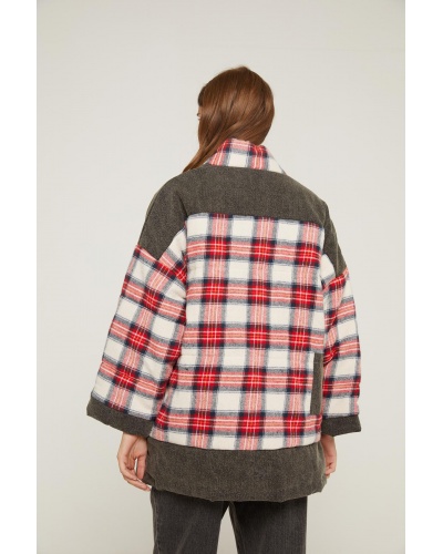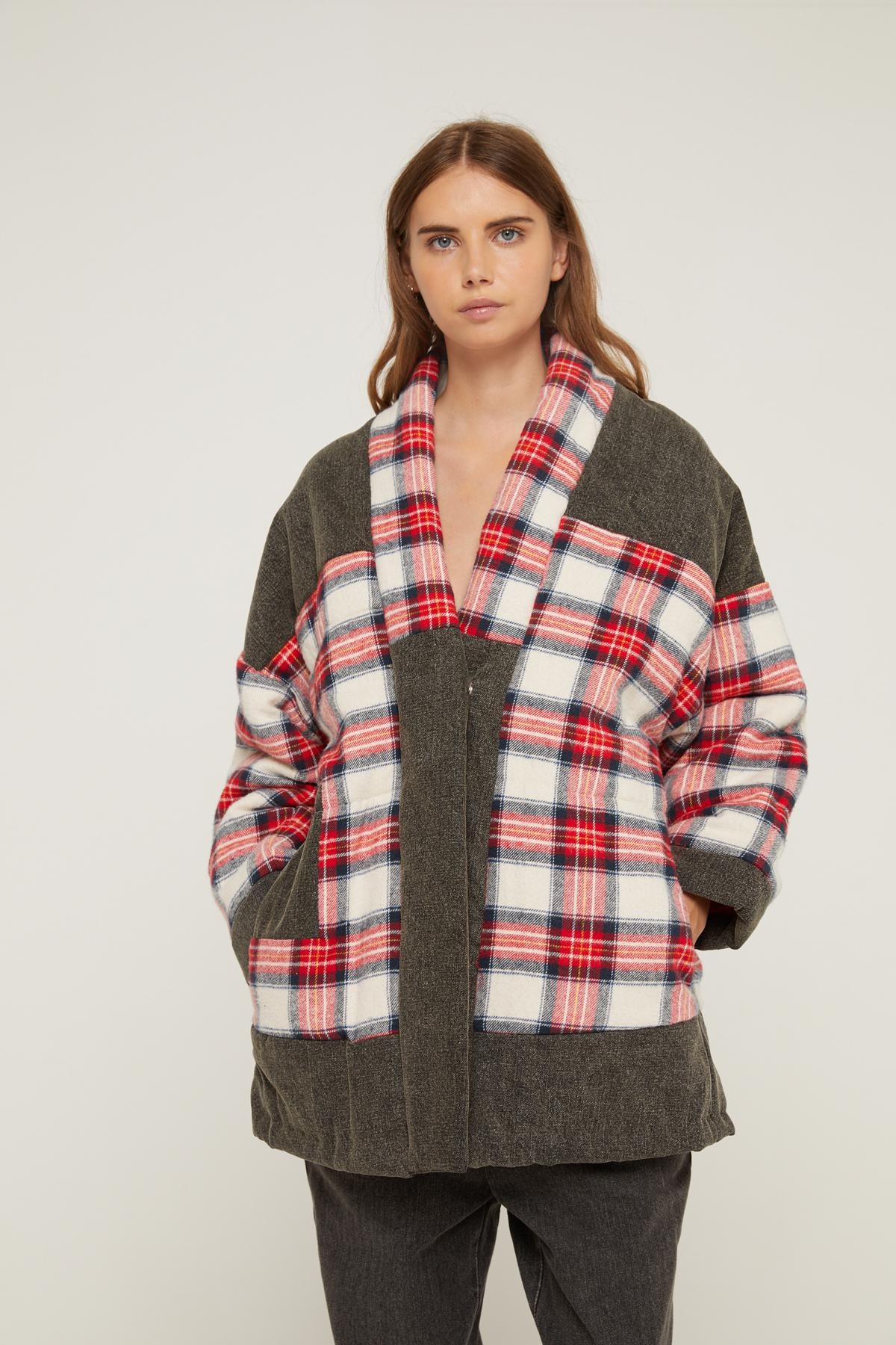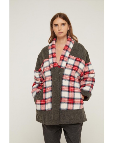 Inspired by a kimono shape, the Luck down jacket is oversized, fleecy, with cotton flannel inserts and red tartan checks. This jacket is a strong piece that will add character to your outfit.