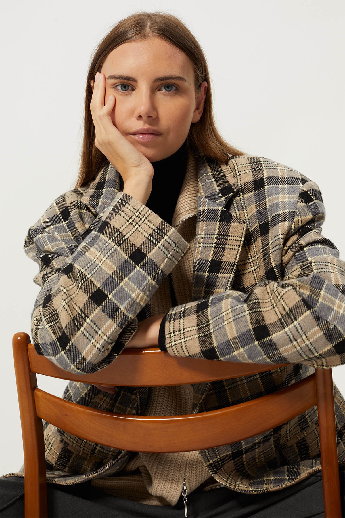 The Nahy blazer features a timeless check print and neutral colours, offering a soft palette of beige, black and shades of grey. Its oversized cut adds a modern dimension, ensuring a look that's both elegant and daring.