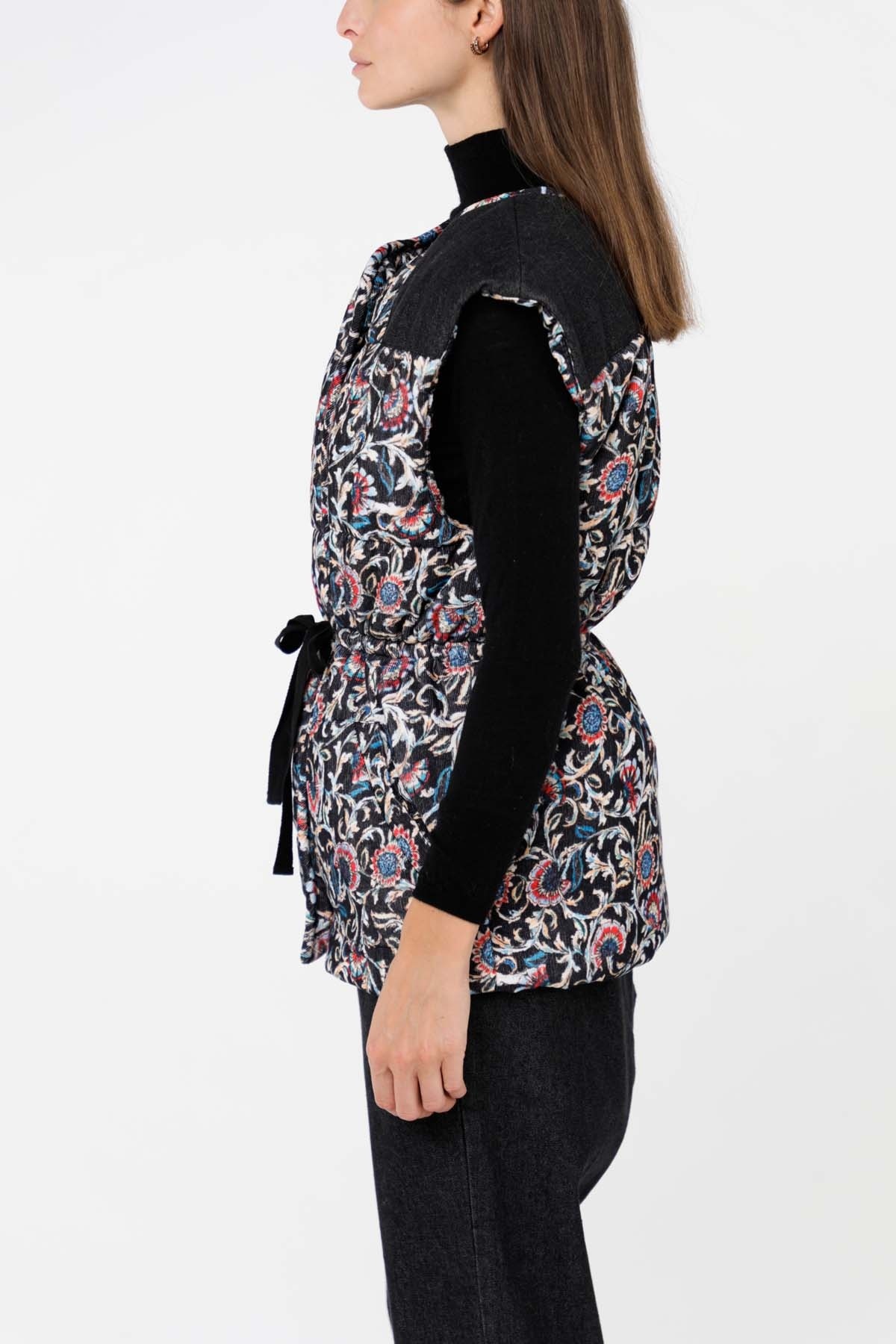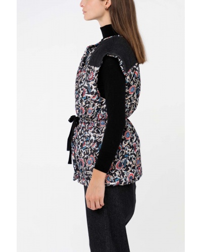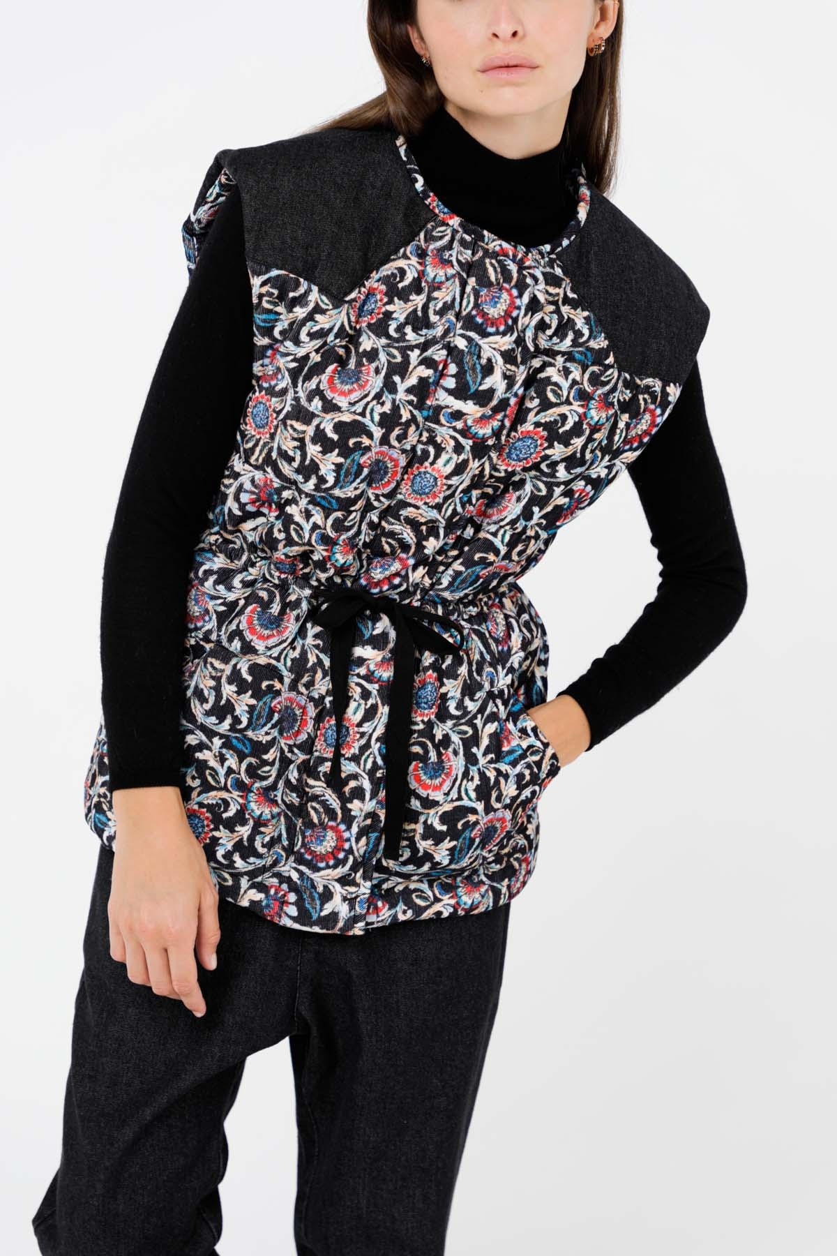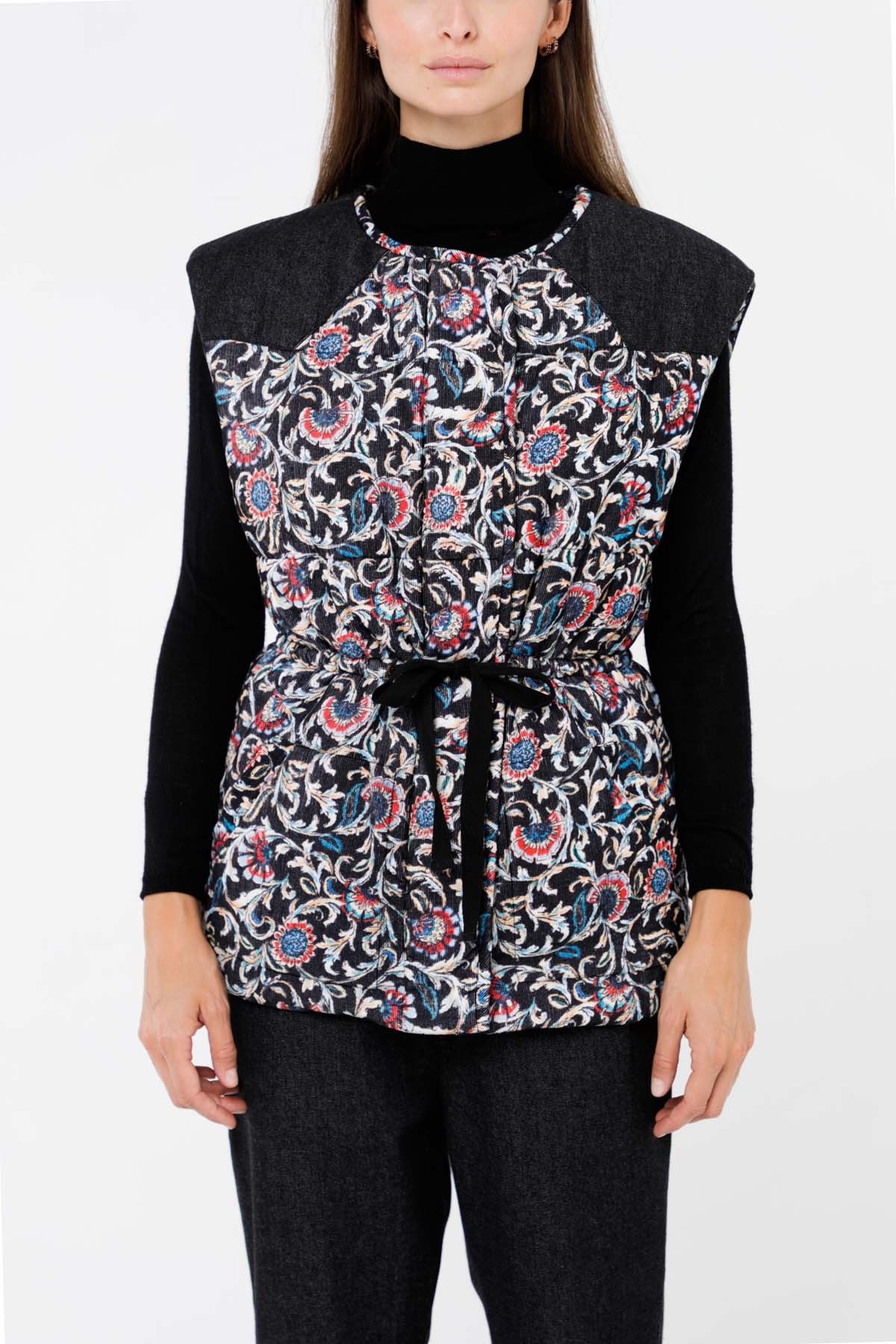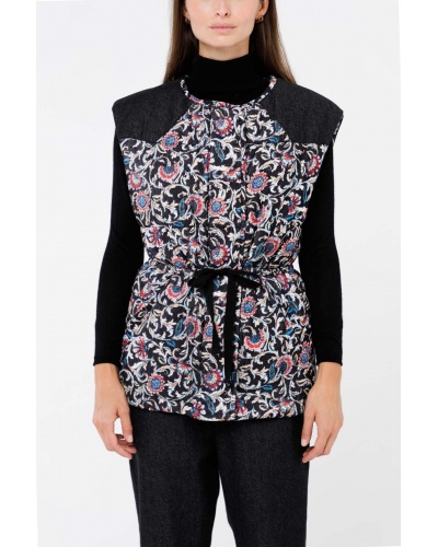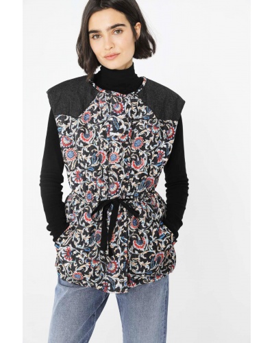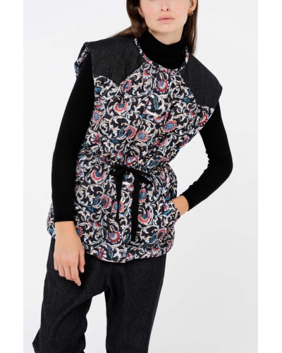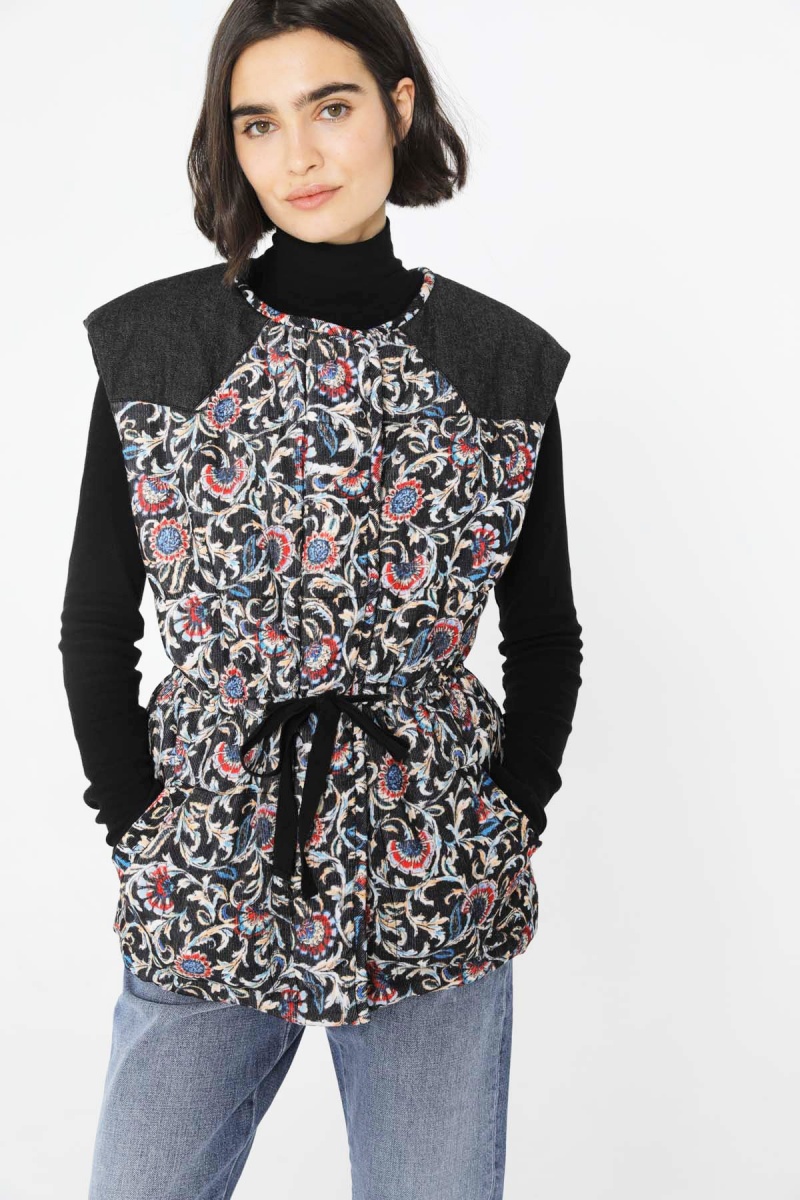 The sleeveless Zaza down jacket is fitted and fleeced in corduroy with denim inserts on the shoulders. A zip closes the front and a tie tightens it at the waist.