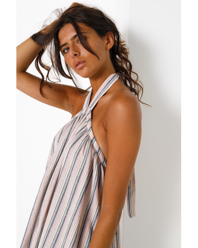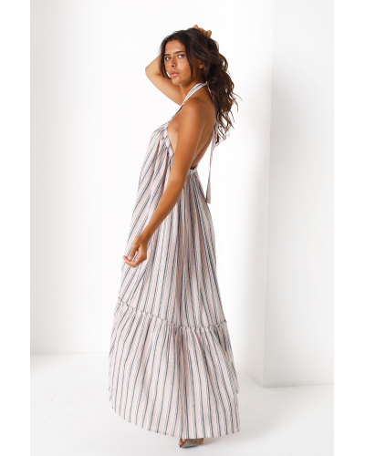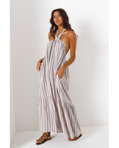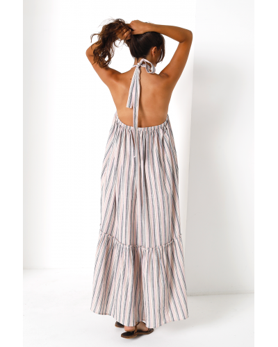 The Noemi dress will accompany you on your escapades in the sun. This long dress is distinguished by its bare back which will highlight you. It will perfectly match with golden bracelets and pretty sandals.