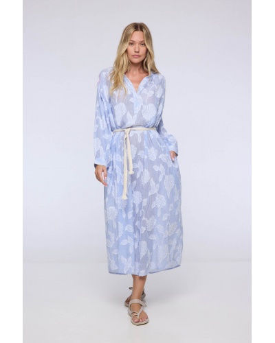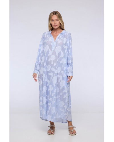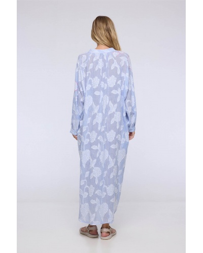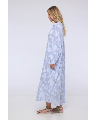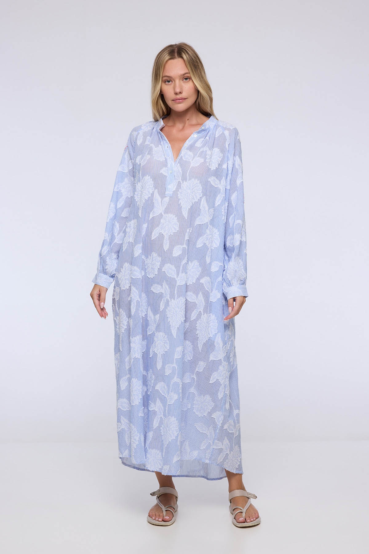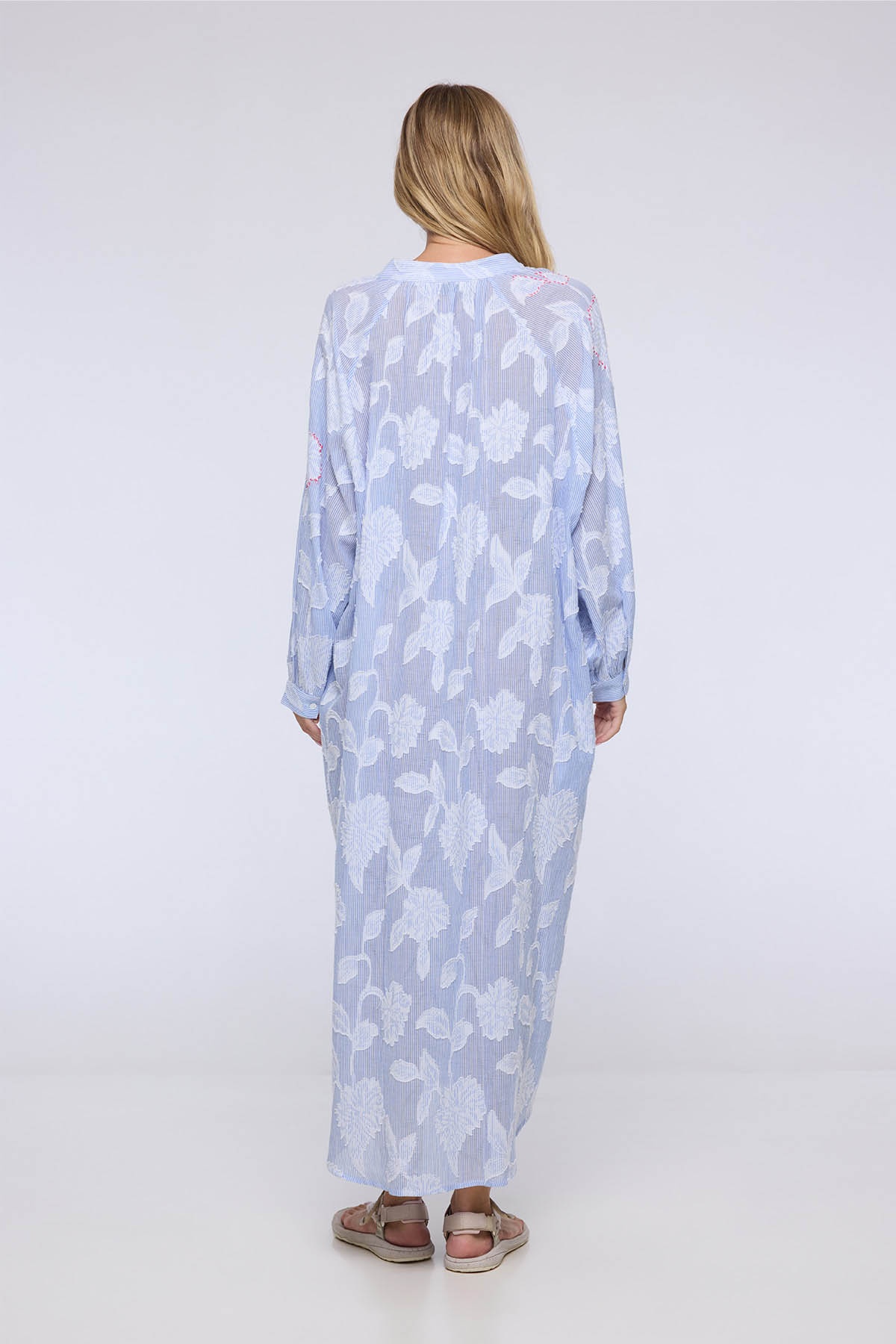 The Ashvem dress is a long, light, and voluminous dress designed for warm spring and summer days. Made from a flowing voile fabric with thin sky blue stripes, it stands out for its oversized floral embossed pattern that adds texture and femininity.