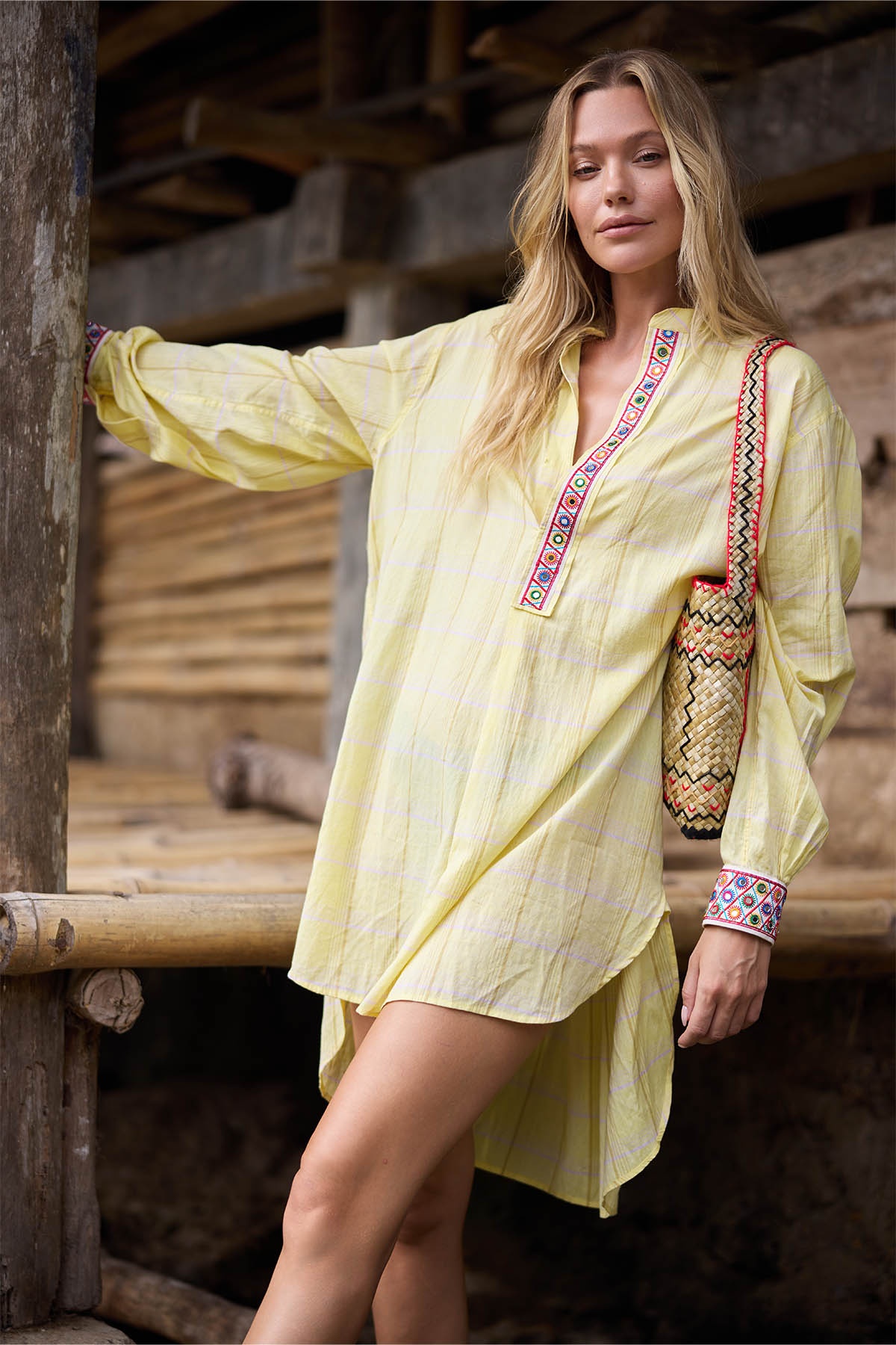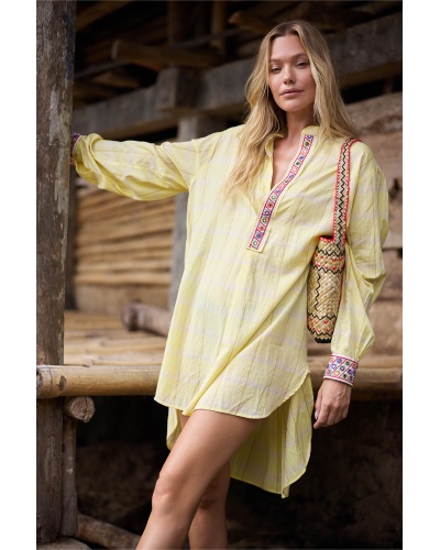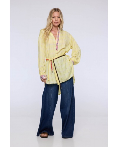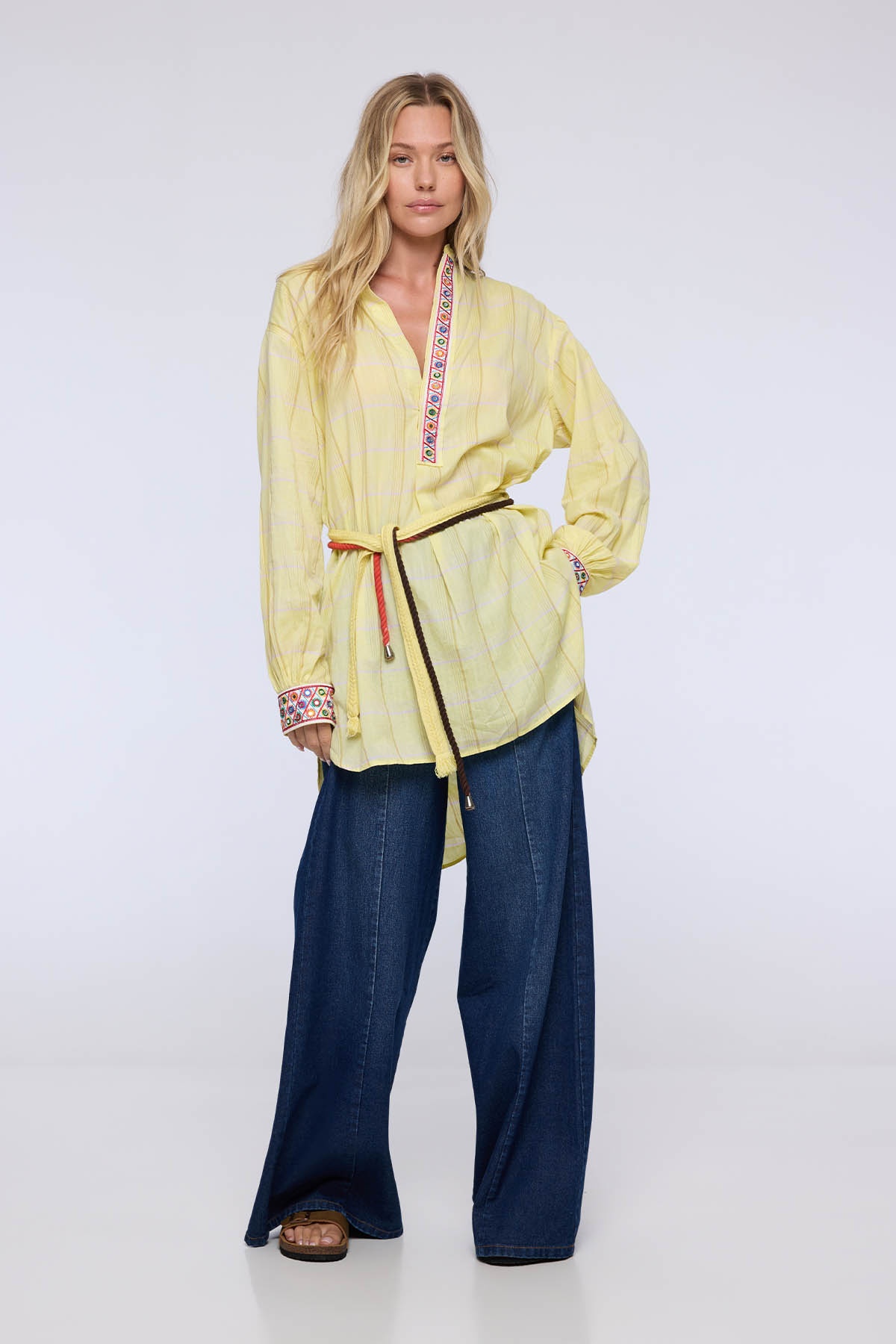 Colourful embroidered details along the button placket and cuffs add a distinctive artisanal touch.