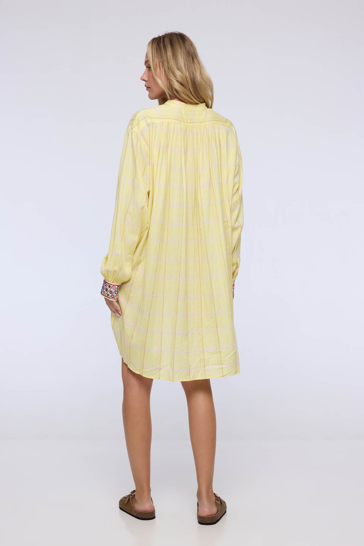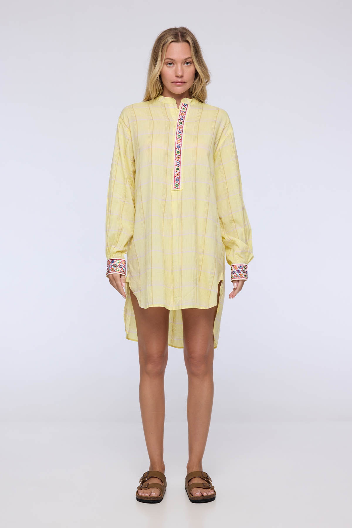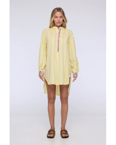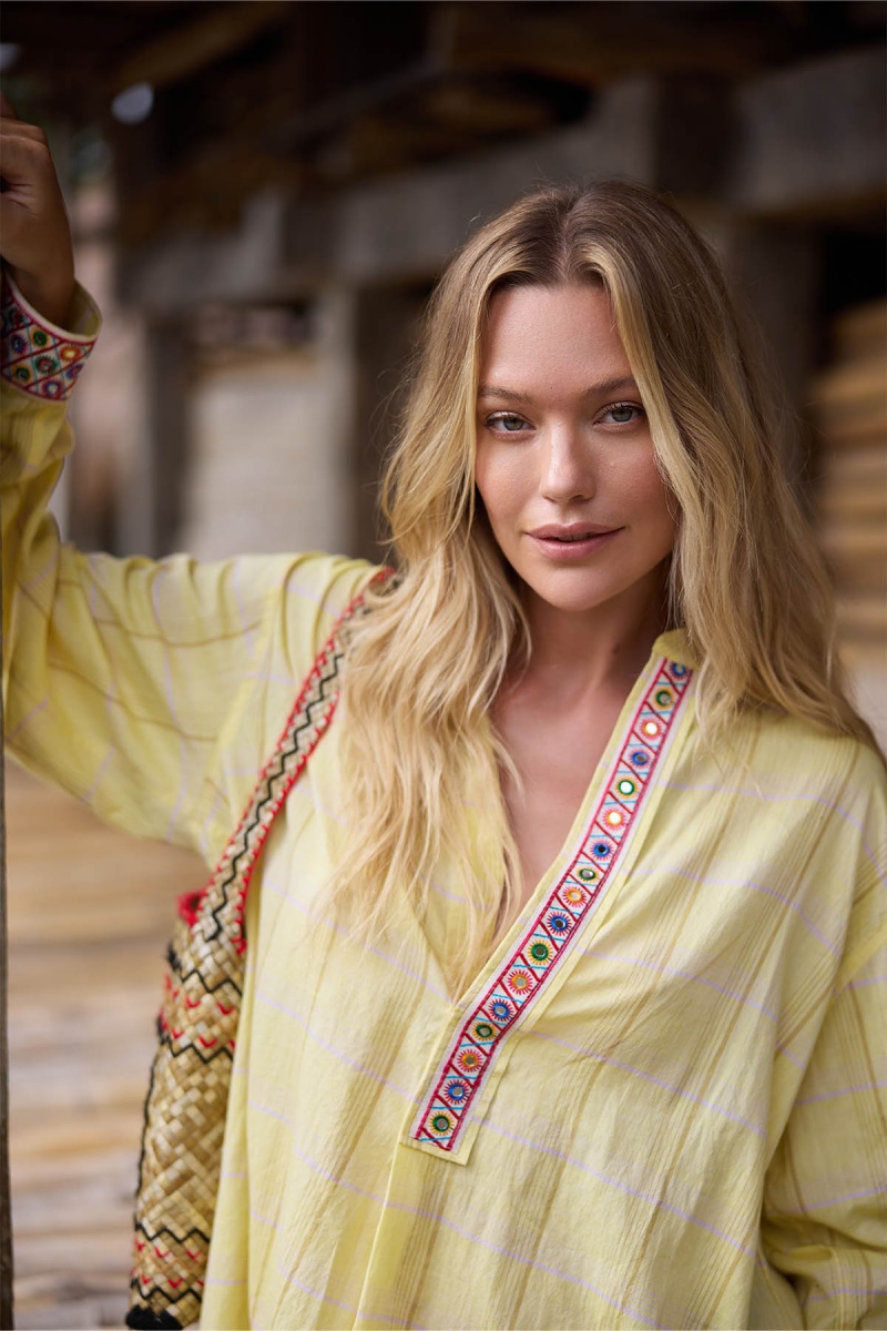 Colourful embroidered details along the button placket and cuffs add a distinctive artisanal touch.