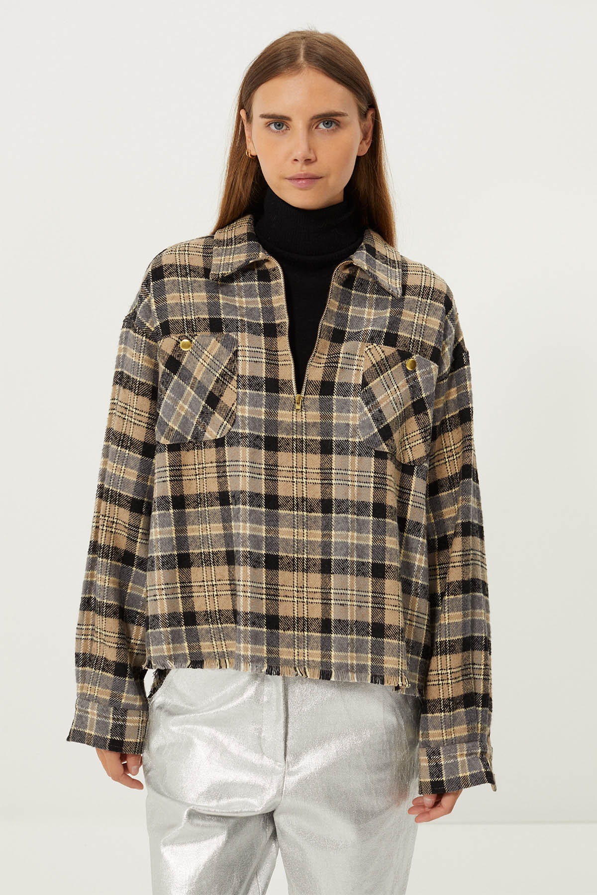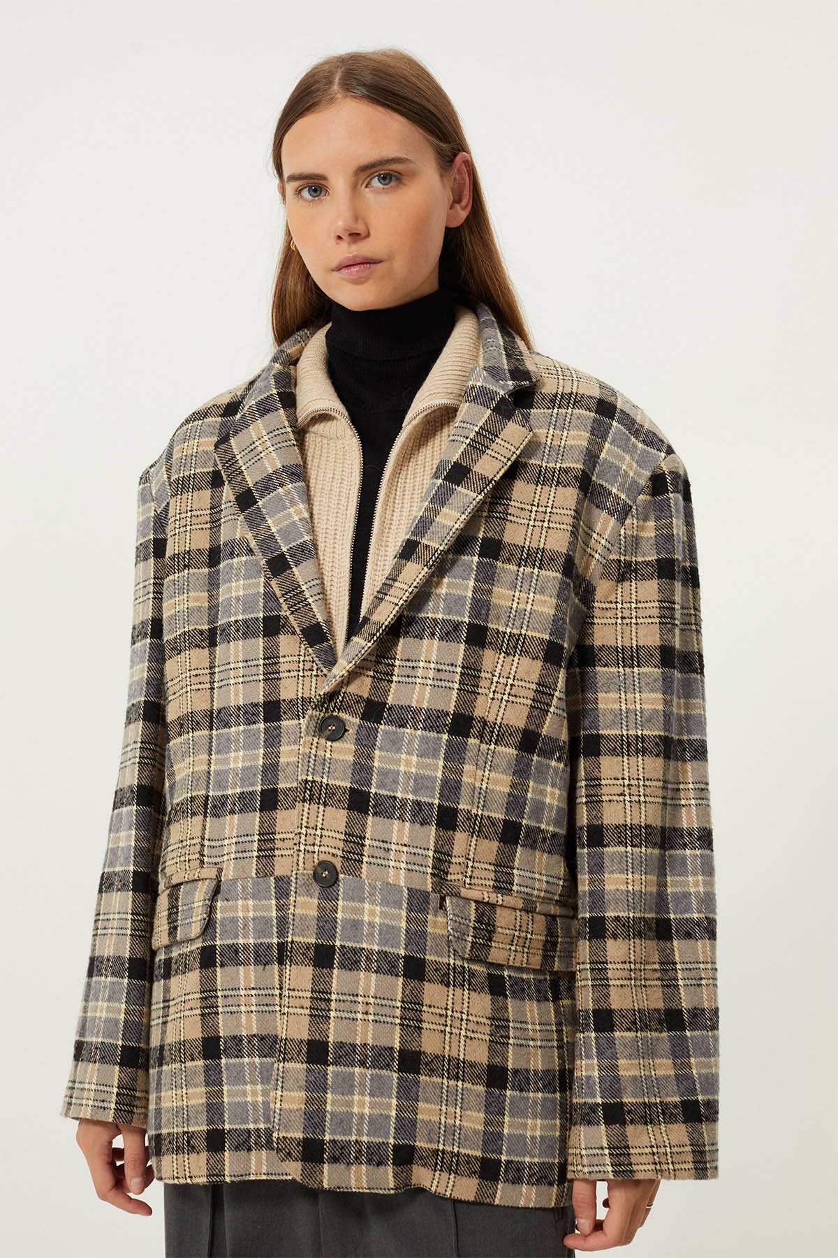 With its timeless check pattern and adjustable waistband, it enhances your figure while enveloping you in warmth.