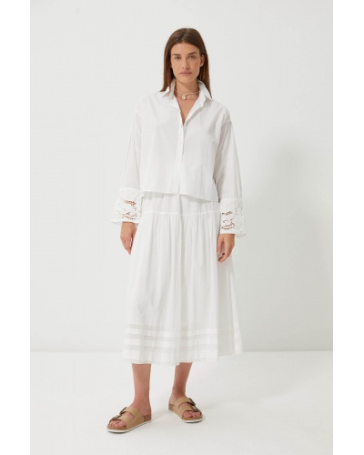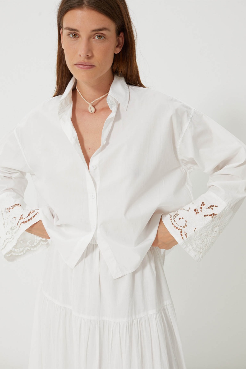The Baratie shirt revisits the classic white blouse with a poetic twist. Made from lightweight cotton, it features long sleeves embellished with openwork embroidery at the cuffs.