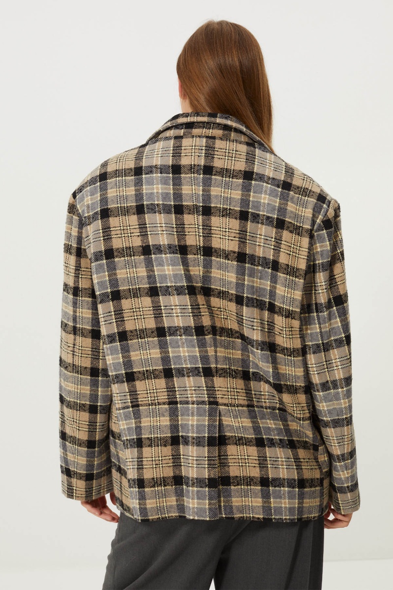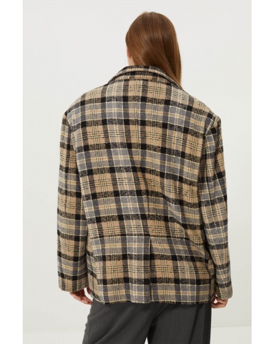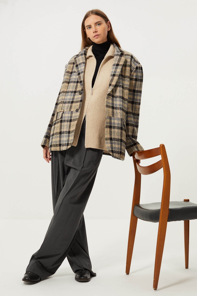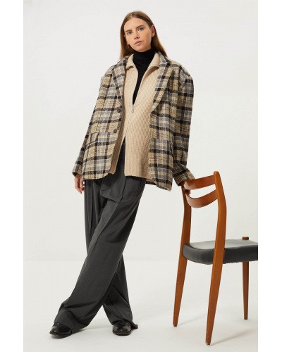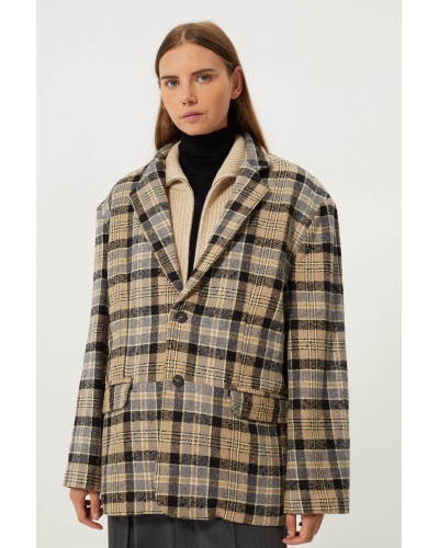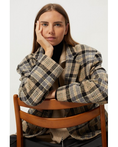 The Nahy blazer features a timeless check print and neutral colours, offering a soft palette of beige, black and shades of grey. Its oversized cut adds a modern dimension, ensuring a look that's both elegant and daring.