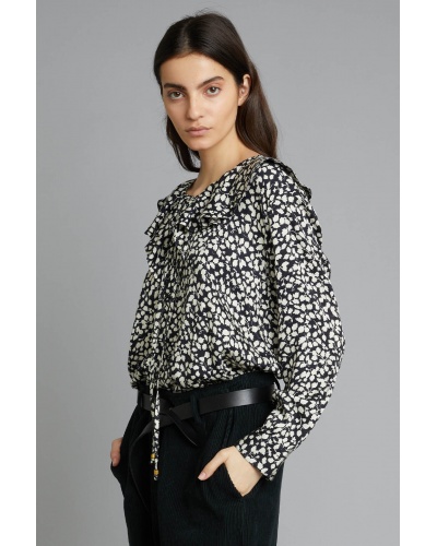 The Ruffle blouse seduces with its timeless black and white floral print and romantic allure. It is enhanced by a delicate ruffled collar that frames the décolleté and is extended by a tie, offering a refined, adjustable touch.