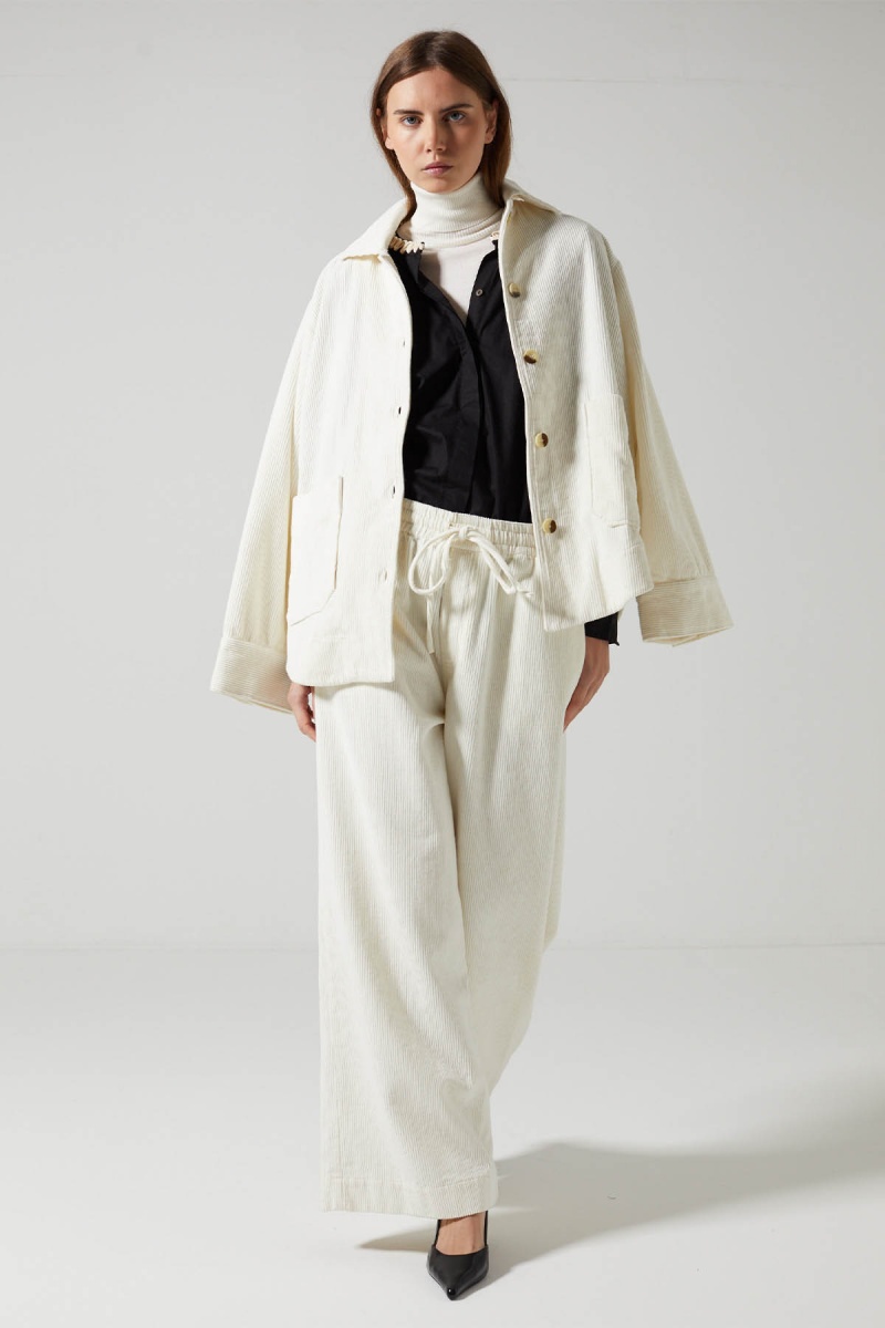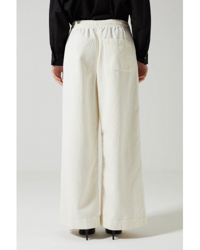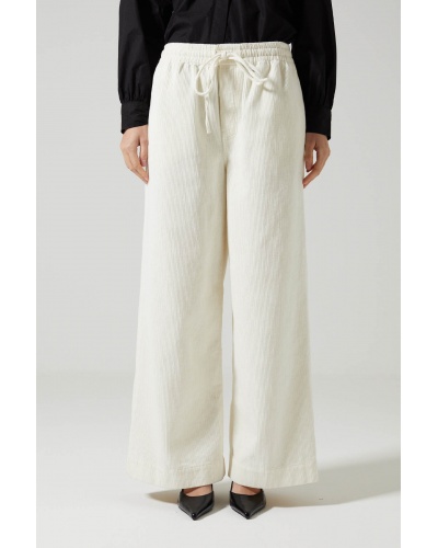 The Loula trousers combine comfort and elegance with their loose fit in ecru corduroy. Their elasticated waistband with drawstring gives them a relaxed look, ideal for cosy days at home or more sophisticated outfits.