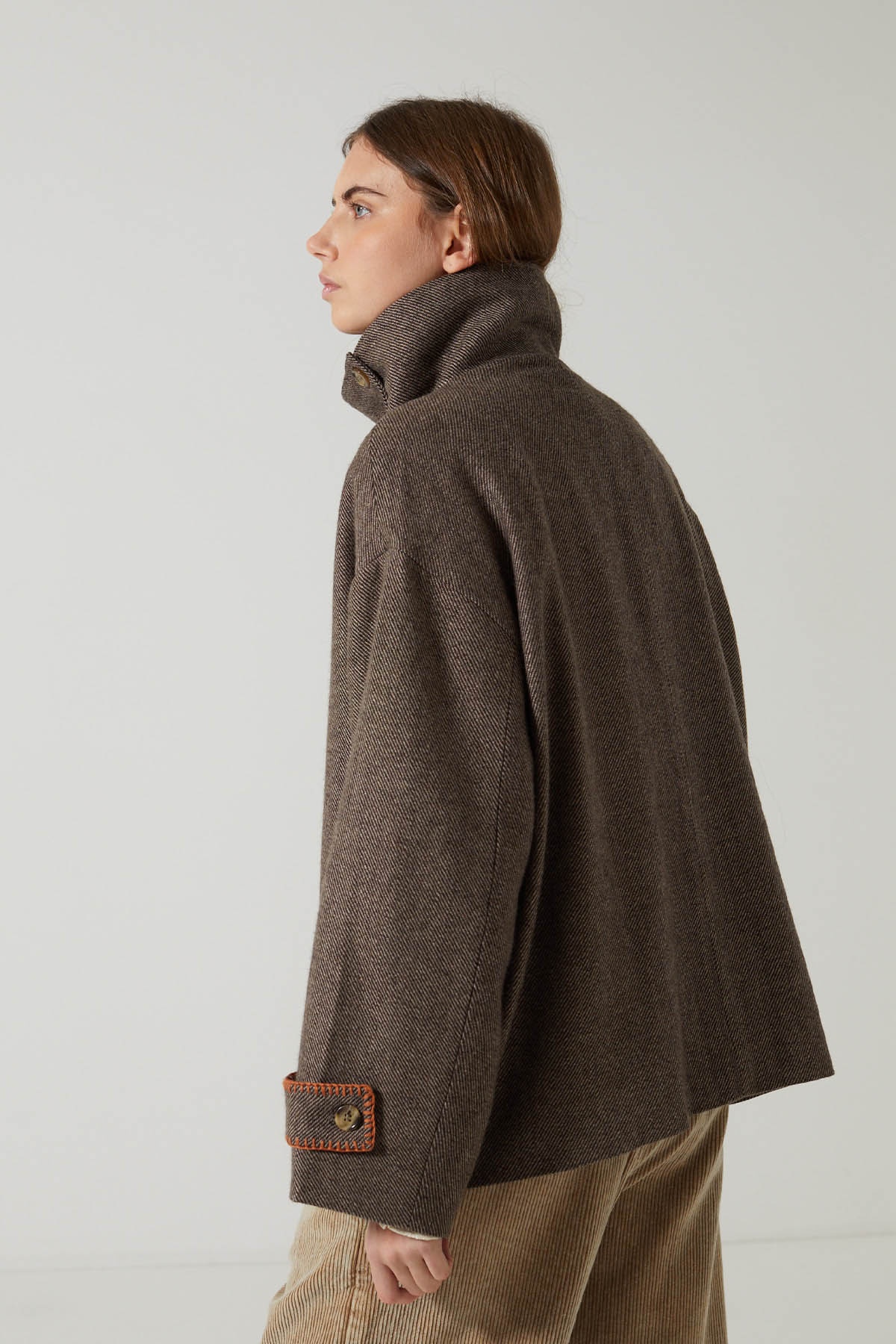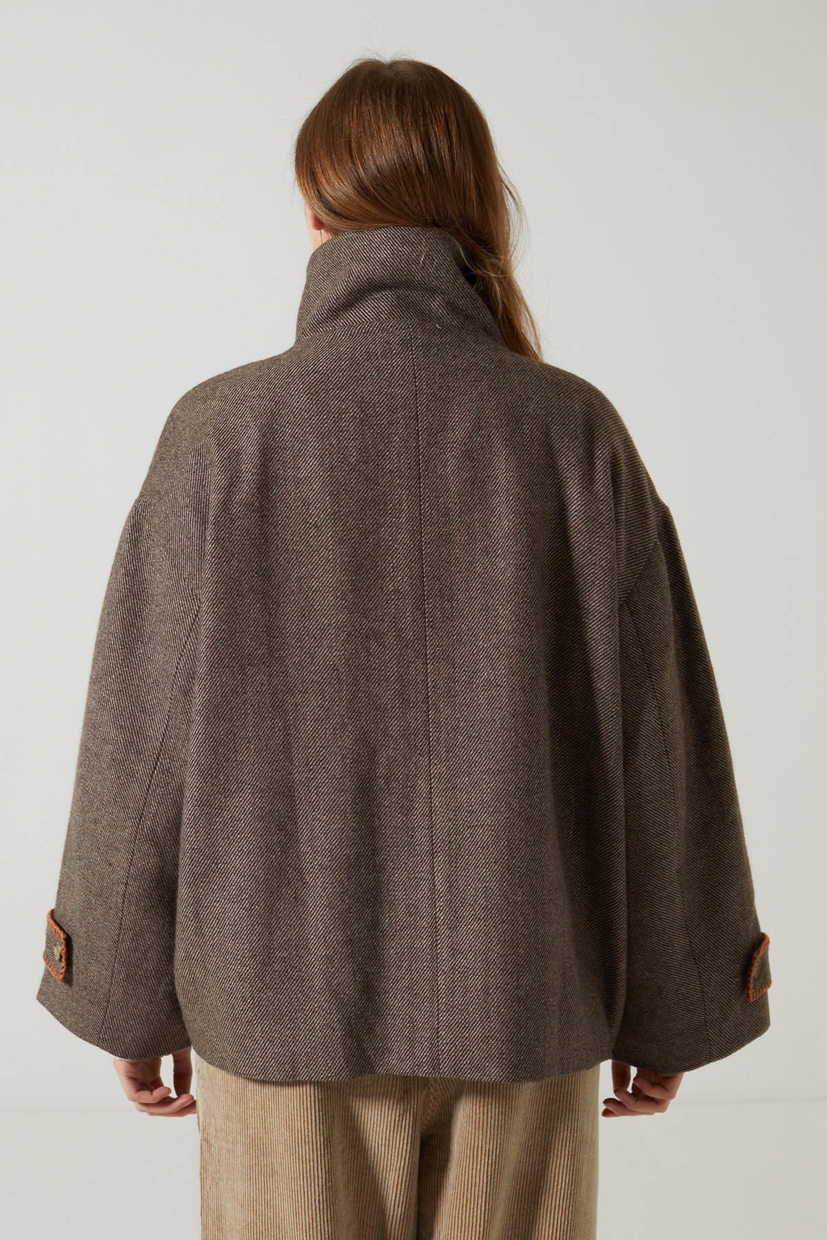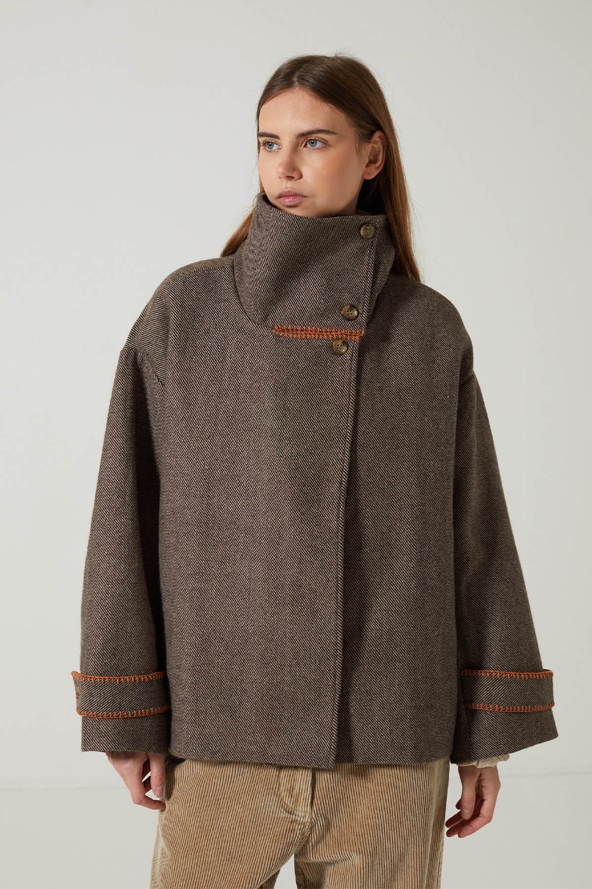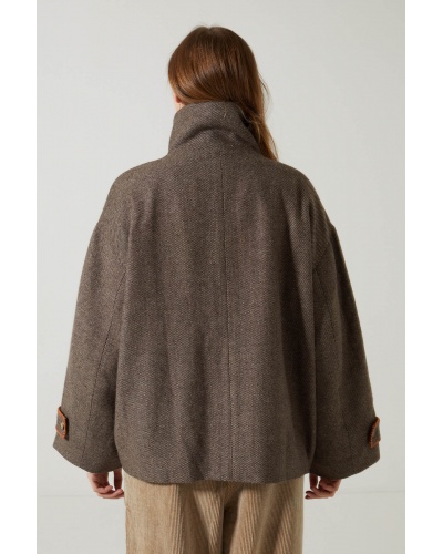 Crafted from textured herringbone wool, the Sylma jacket charms with its loose fit and large adjustable stand-up collar, which can be worn up for a bold look or down for a more relaxed style.