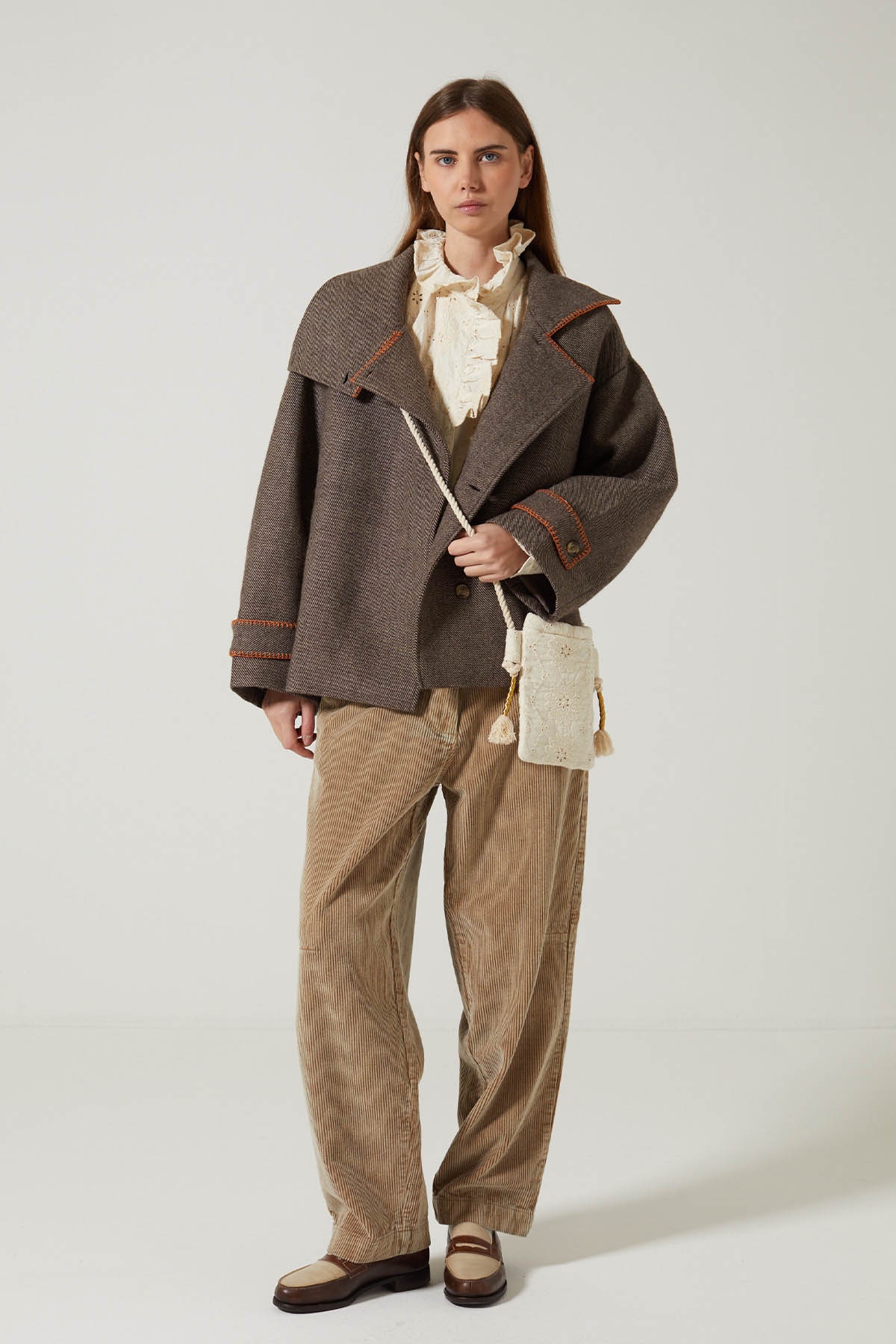 Contrasting topstitching on the collar and cuffs adds a touch of character, while highlighting the attention to detail in the finish. Its generous volume is perfect for layering over a knitted jumper or romantic blouse.