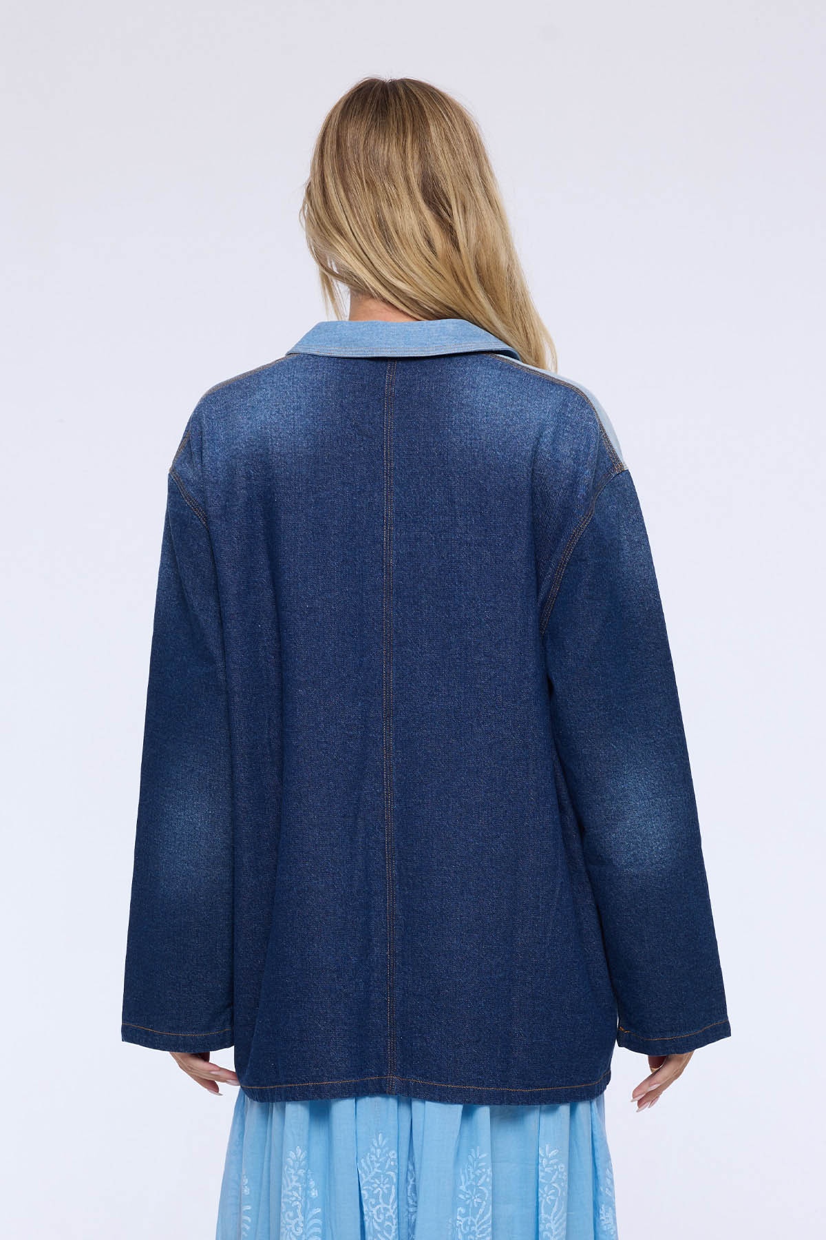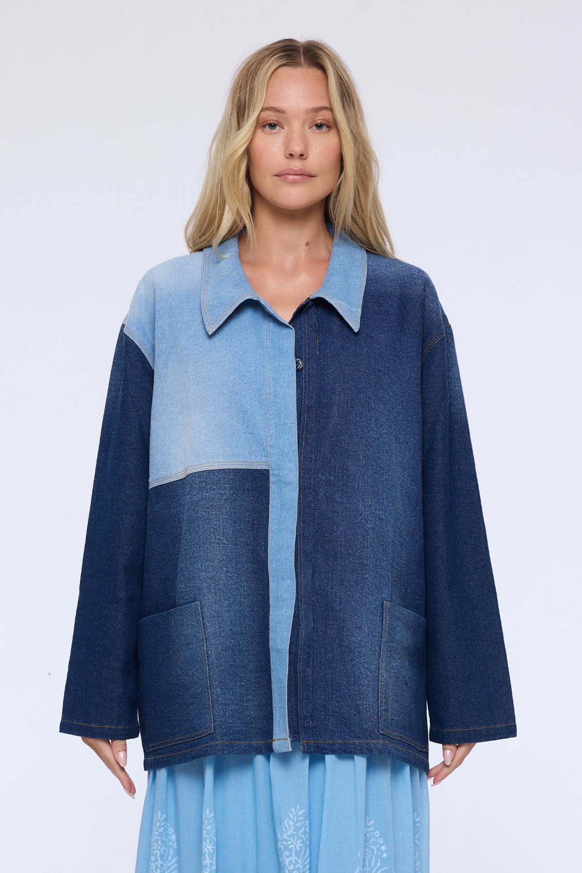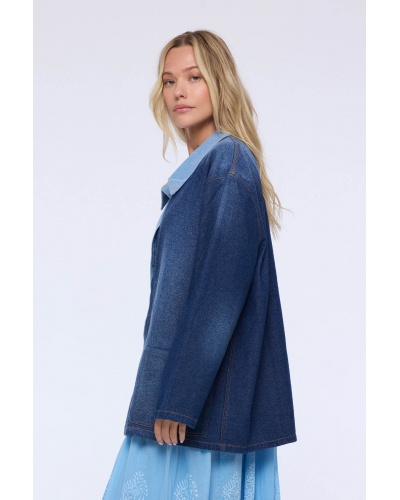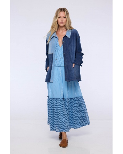 The Mila denim jacket stands out with its patchwork of blue denims, which adds structure and modernity to this wardrobe essential. Its loose fit ensures comfort and effortless style.