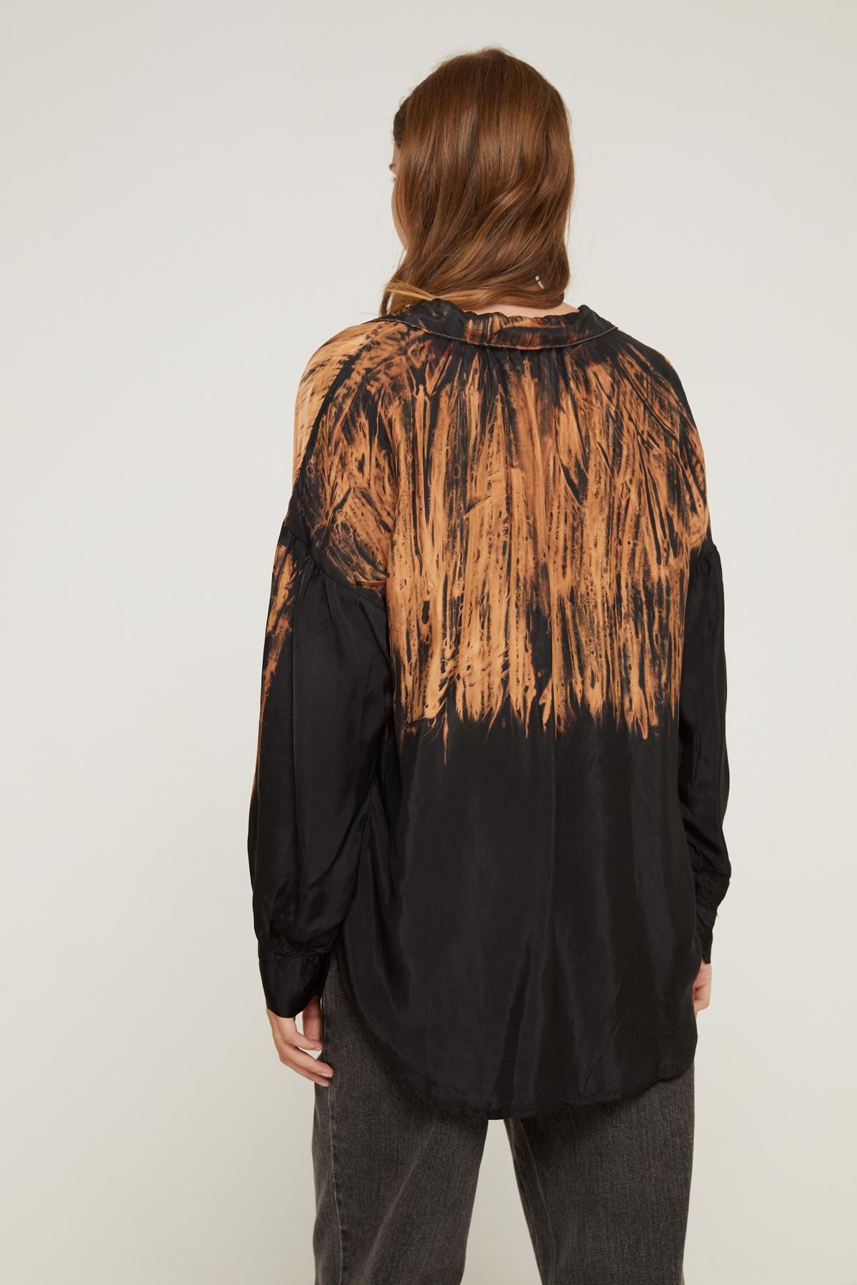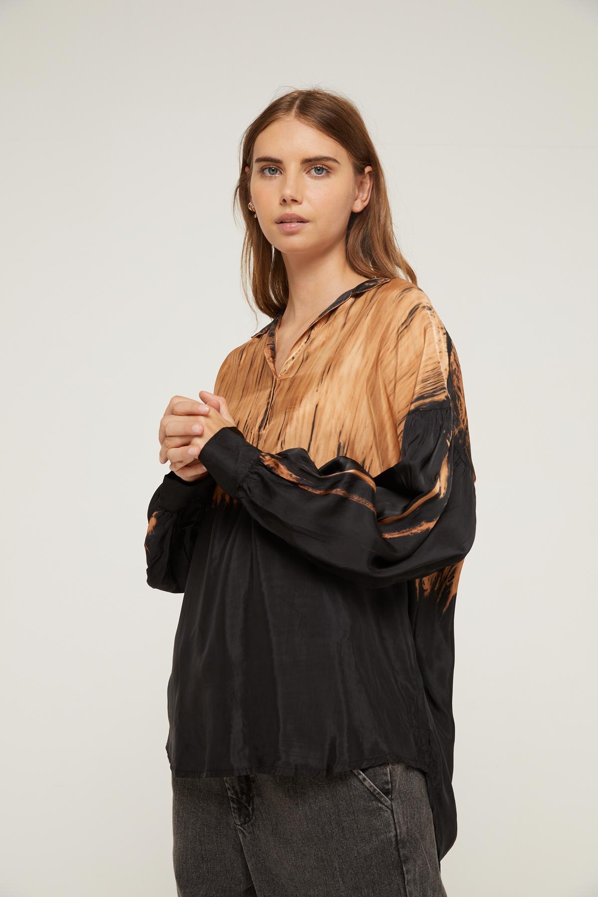 Silky and airy, the Demia blouse in satin viscose is distinguished by its golden tie&dye. Its fluidity makes it suitable for all body types. Match it with black jeans.