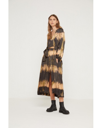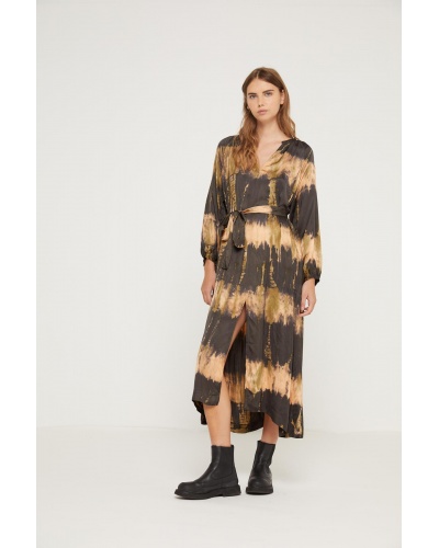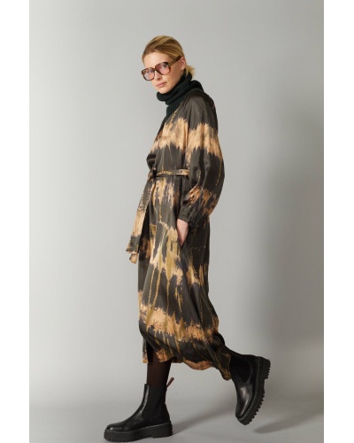 Silky and original, the Lunga dress in satin viscose is distinguished by its unique tie&dye. Its fluidity can suit all body types. Wear it with a turtleneck and black ankle boots.