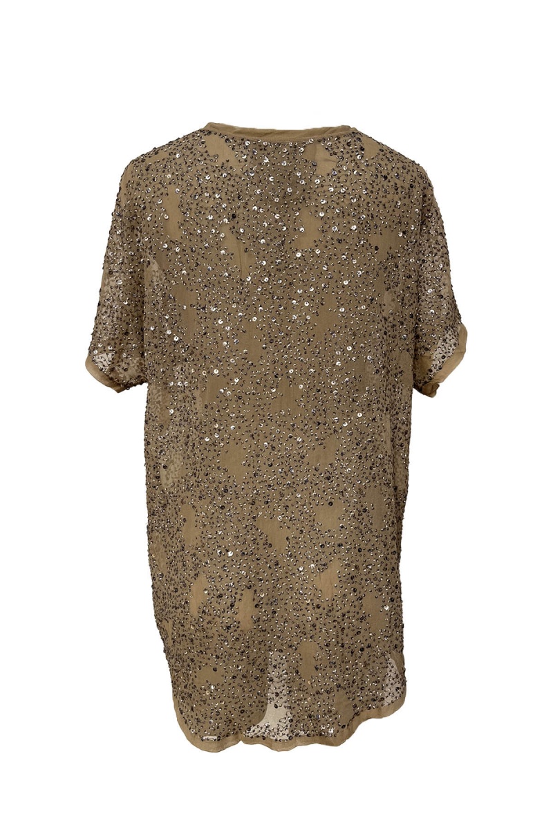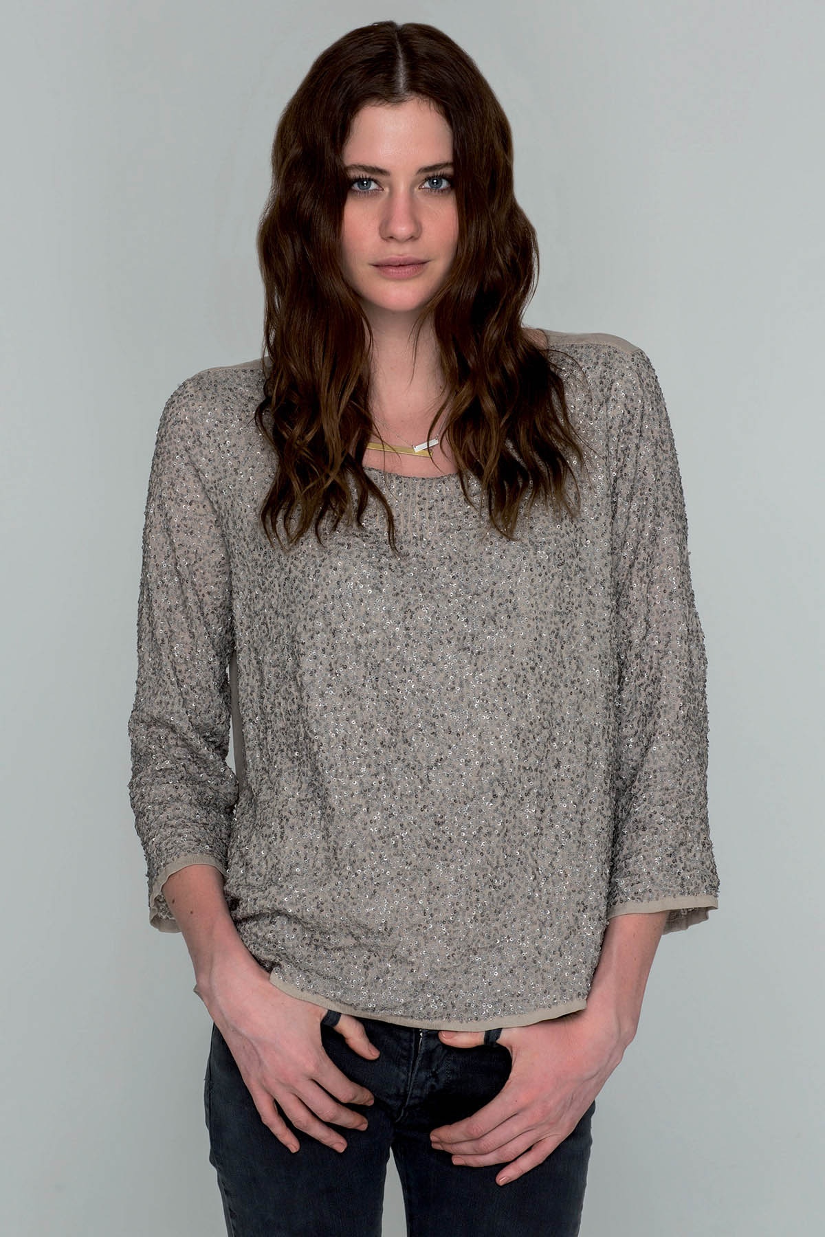 Add a touch of sparkle to your look with the Hexos T-shirt. This viscose voile model is light and delicately transparent. Fully embroidered with sequins, it reflects the light with every movement, adding a chic, festive dimension to your outfit.