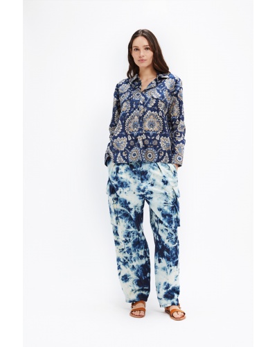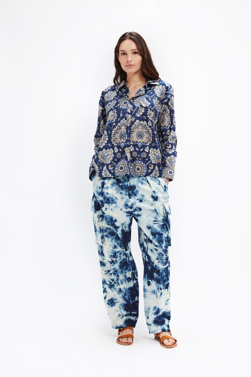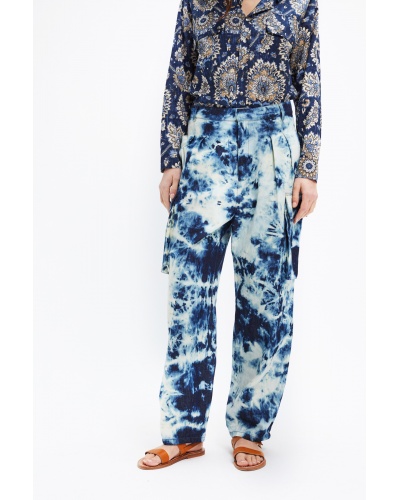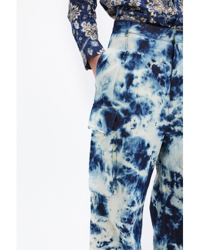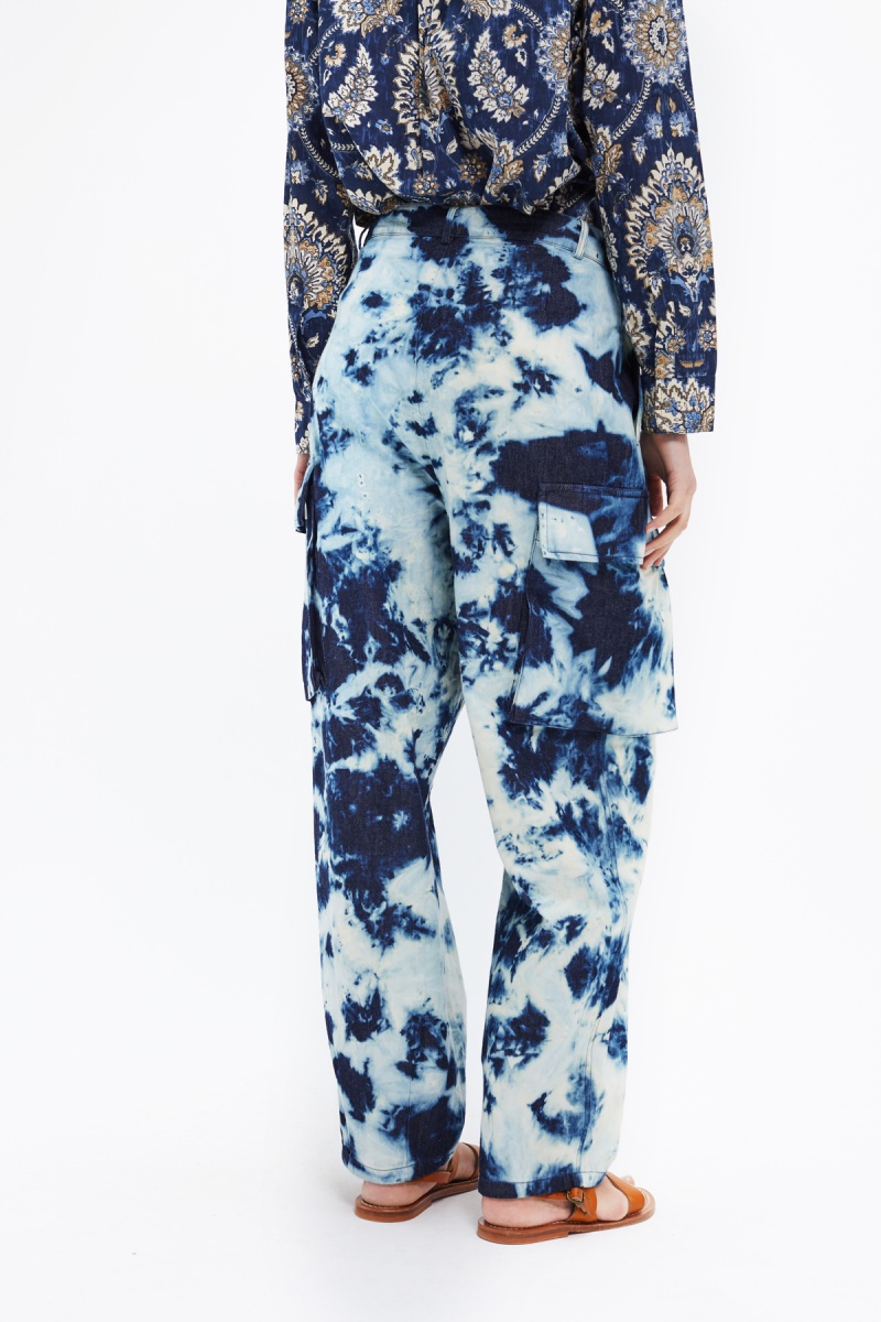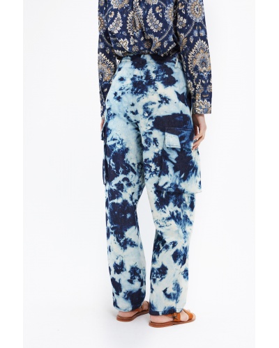 Inspired by the 2000's, the faux-masculine cut of the cargo is making a comeback this year. Its aqua blue tie&dye is handmade. Wear it with a white tee and a pair of sneakers.