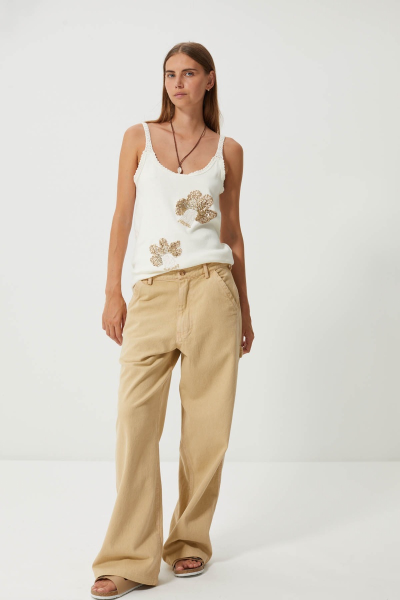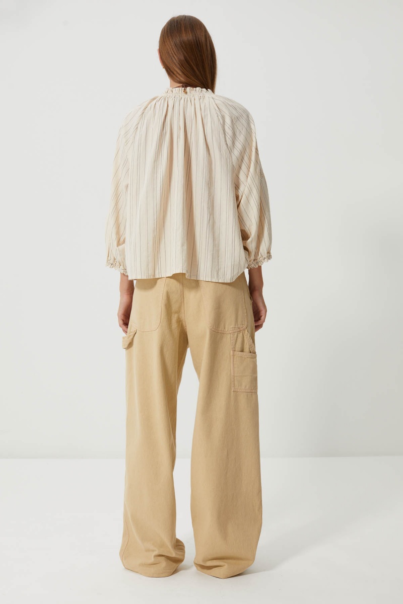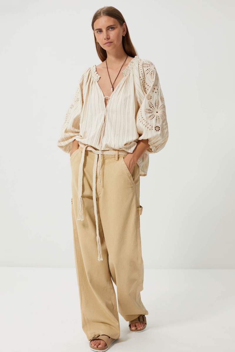Its Sahara beige hue makes it a timeless piece, easy to pair with a camisole or airy blouse. Its side pockets and cargo style revisit the codes of utility trousers with a modern edge.