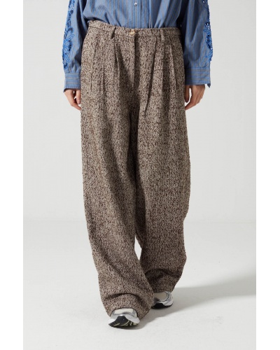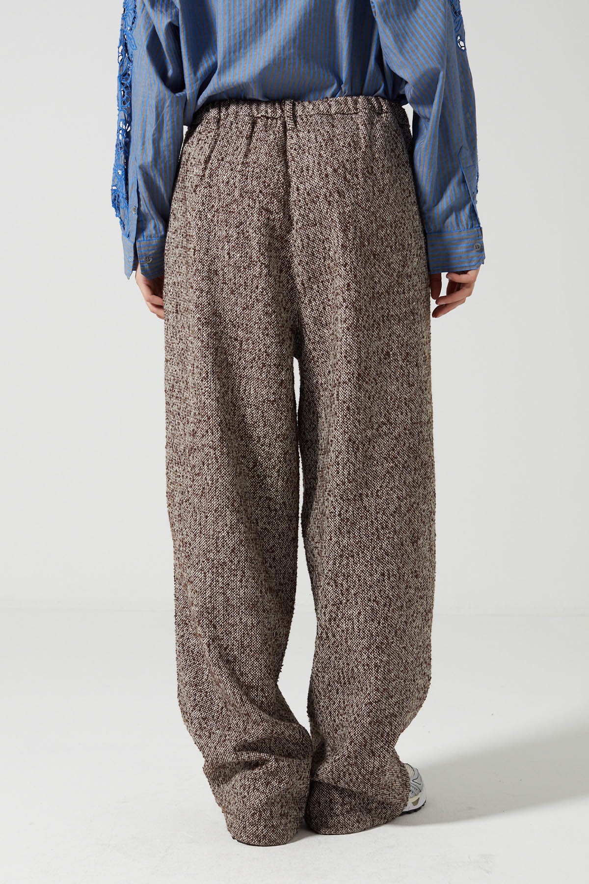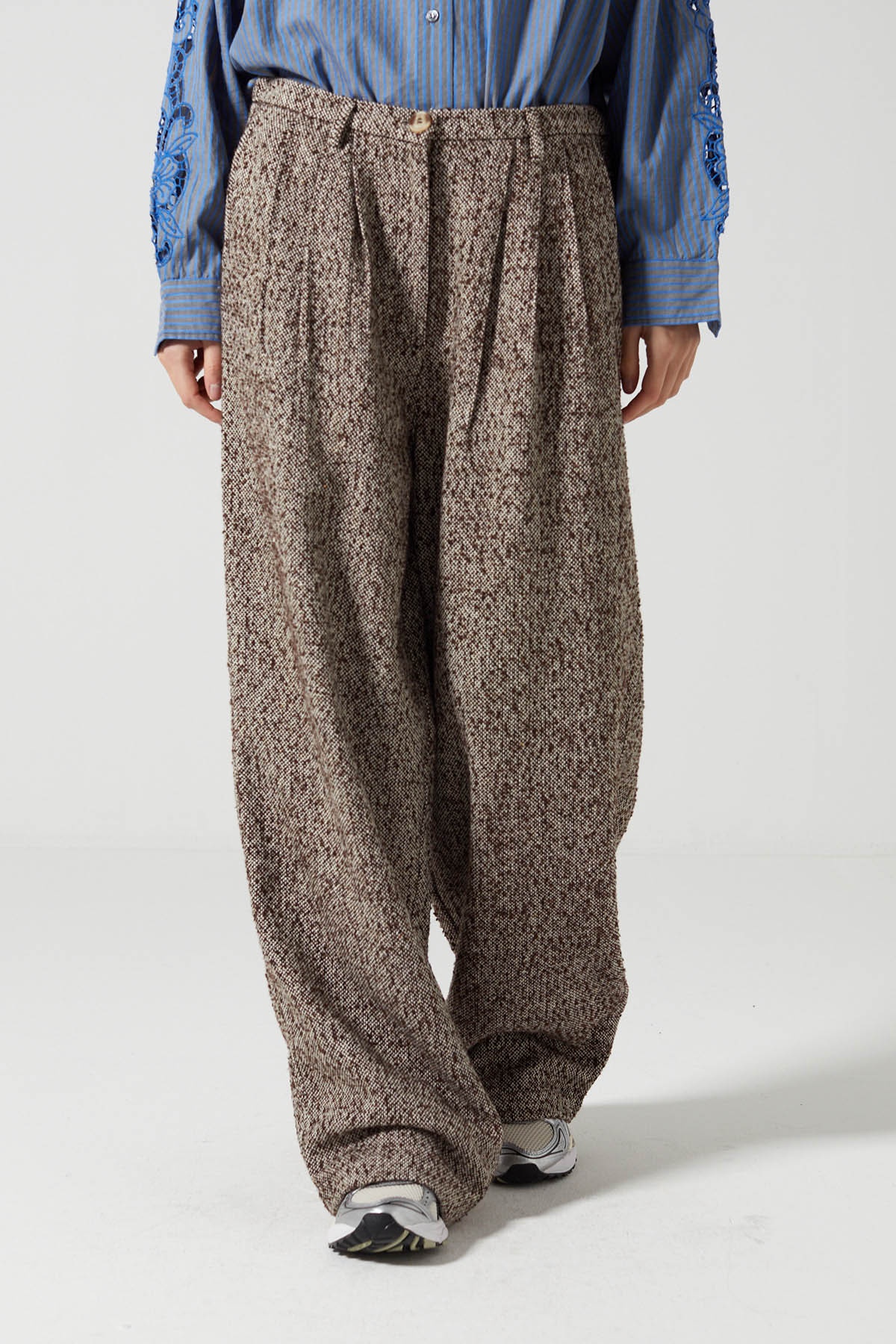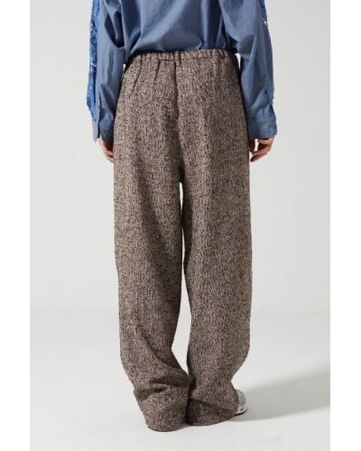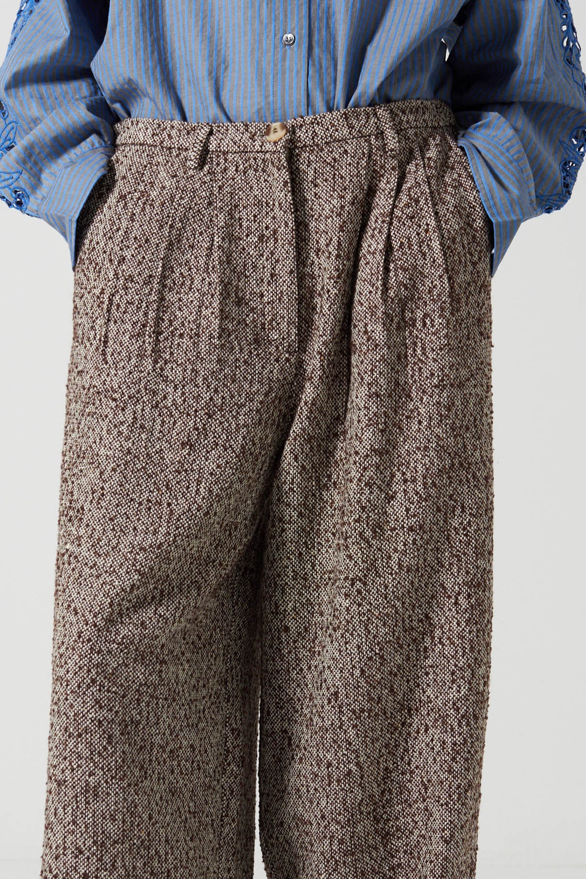 Crafted from soft, textured tweed, the Lysie trousers reinterpret tailoring with a casual twist. Their wide, flowing cut is balanced by a defined waist and stitched pleats at the front, creating a loose silhouette without compromising on structure.