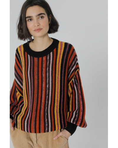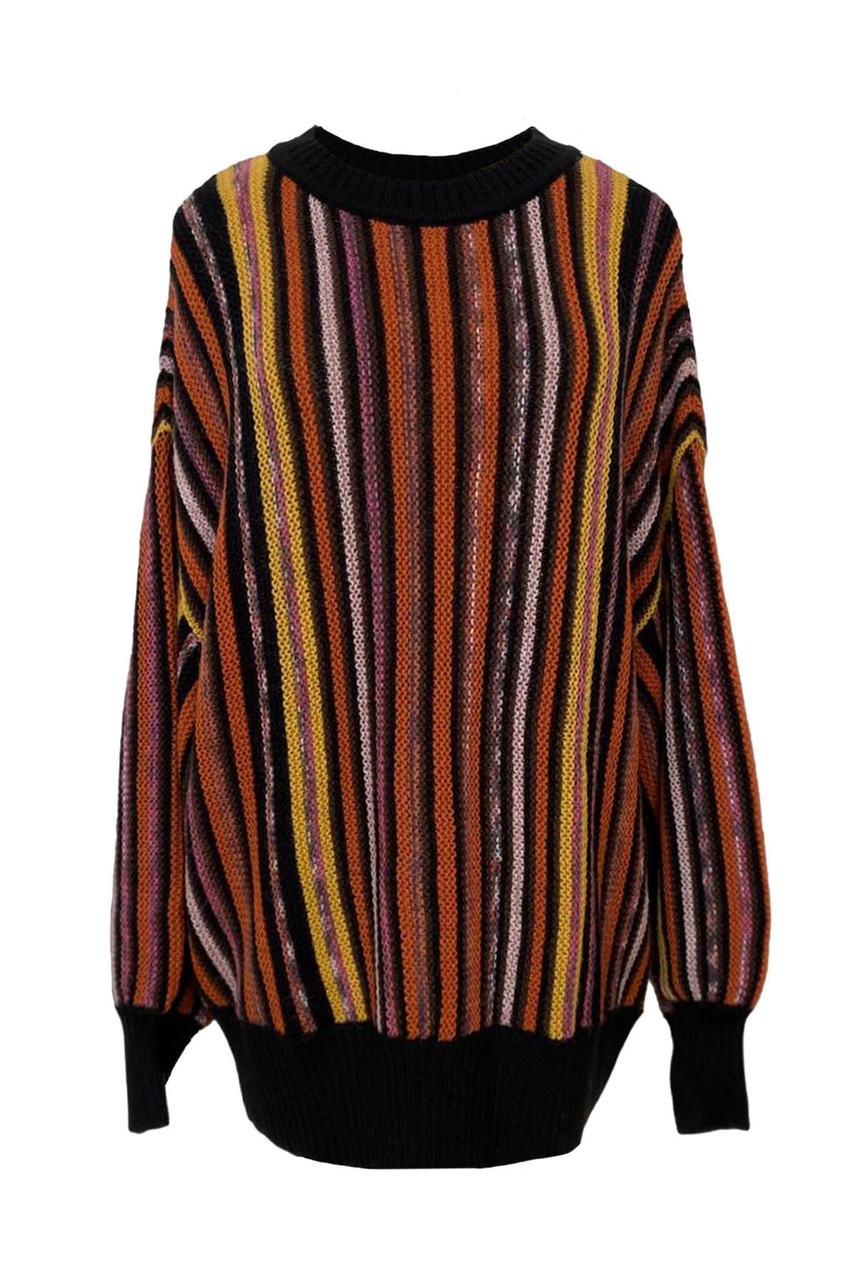 The colorful striped Denver sweater, with its on-trend length and elegant black ribbing, is an invitation to warmth and style. For a casual look, pair it with corduroy pants and sneakers, or for an elegant outfit, match it with suit pants and ankle boots.