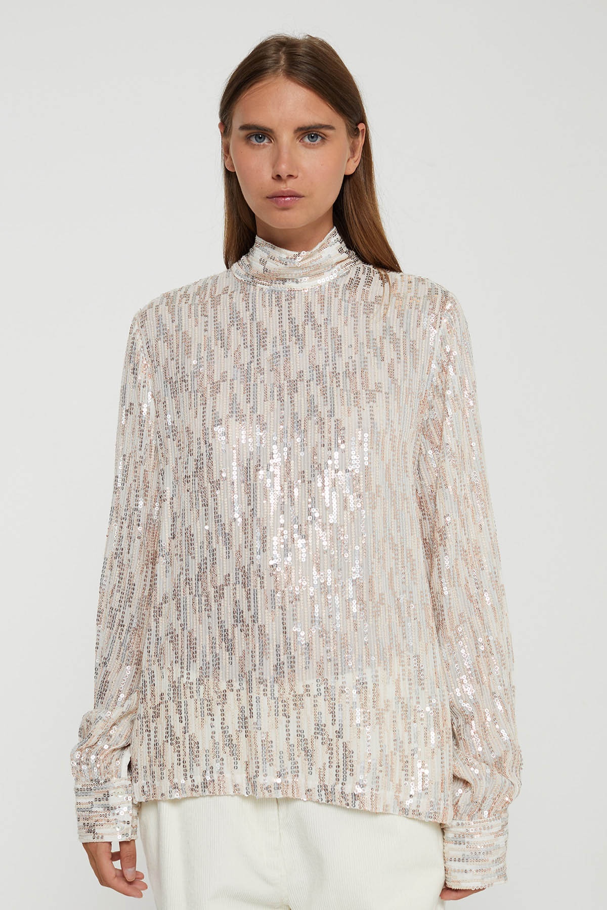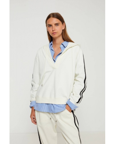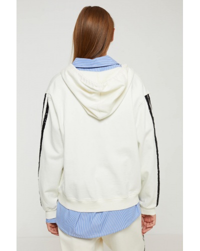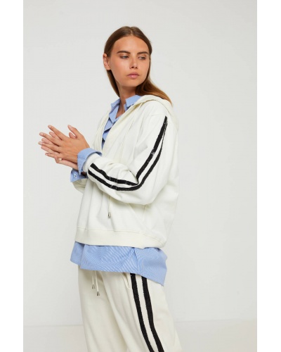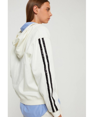 This sleek white hoodie is instantly captivating with its two black sequin stripes along the sleeves. Its plunging neckline gives it a modern look. Whether you want to face the cold in style or simply add a touch of sparkle to your casual outfit, the Chanis sweatshirt will meet all your expectations. Dive into casual elegance with this unique sweater that combines comfort and sophistication.