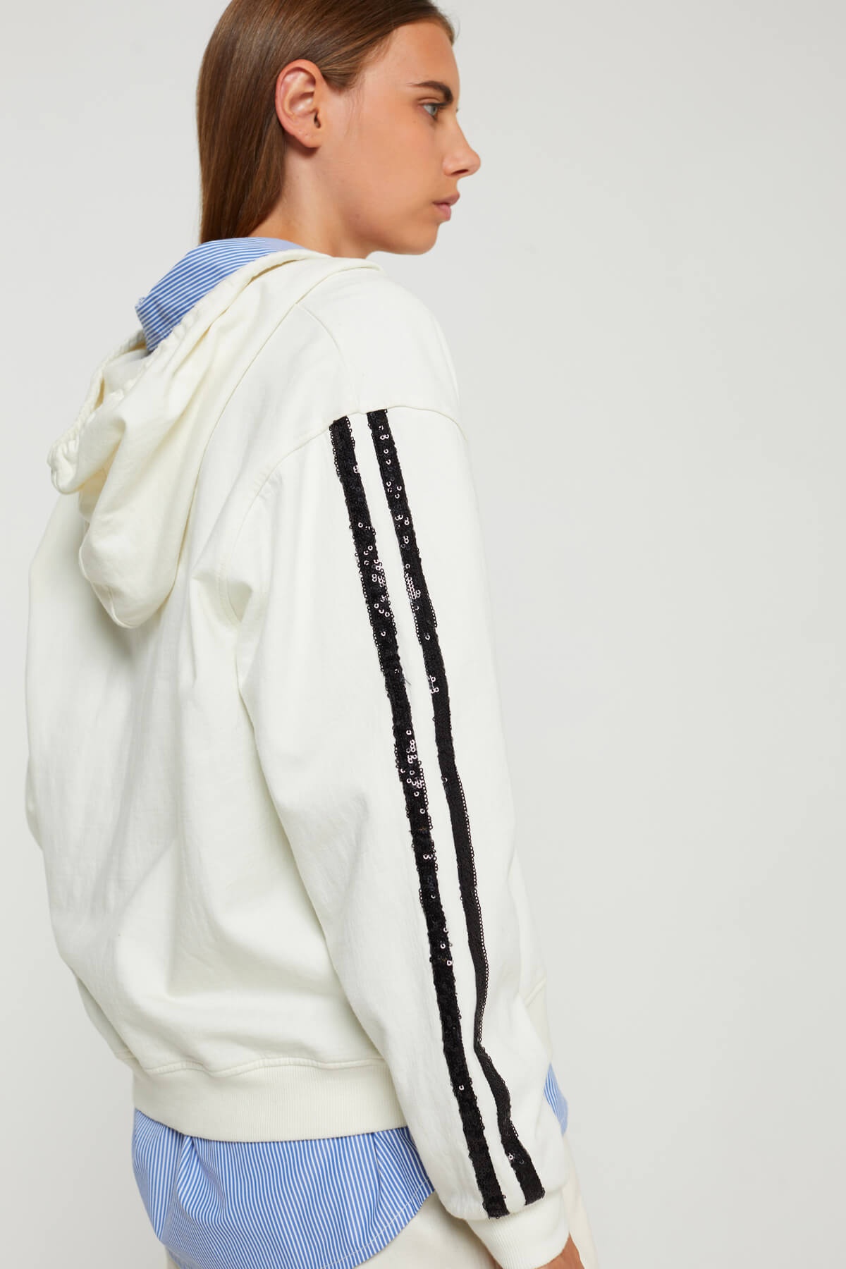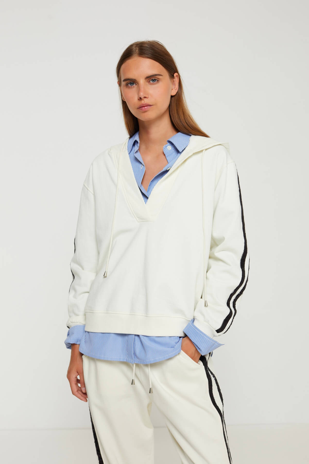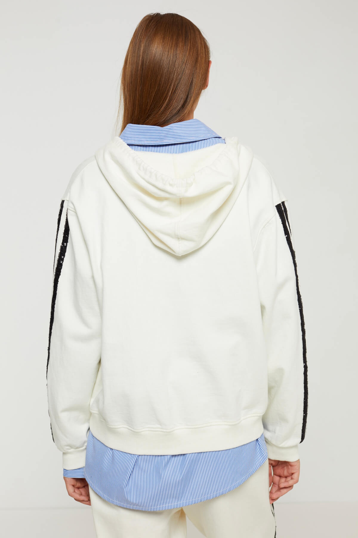 This sleek white hoodie is instantly captivating with its two black sequin stripes along the sleeves. Its plunging neckline gives it a modern look. Whether you want to face the cold in style or simply add a touch of sparkle to your casual outfit, the Chanis sweatshirt will meet all your expectations. Dive into casual elegance with this unique sweater that combines comfort and sophistication.