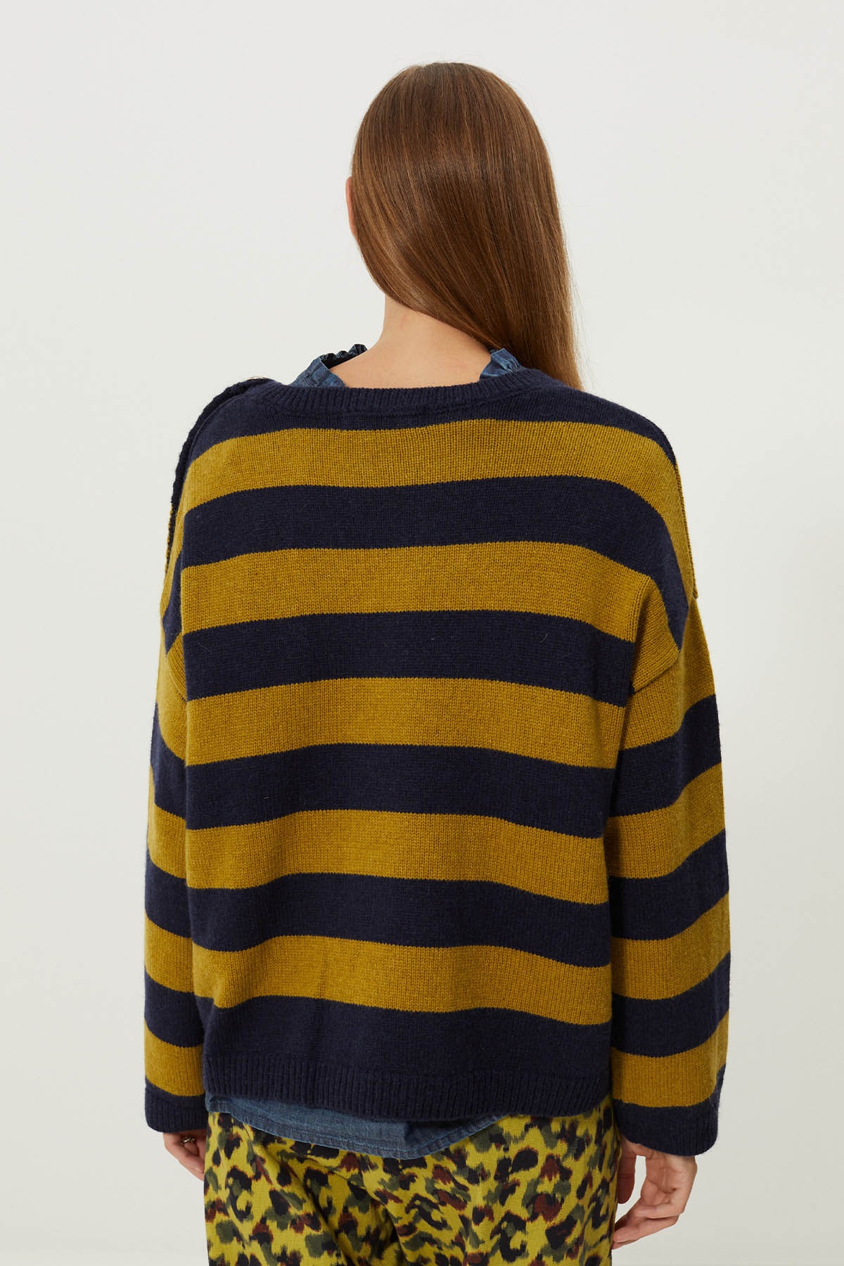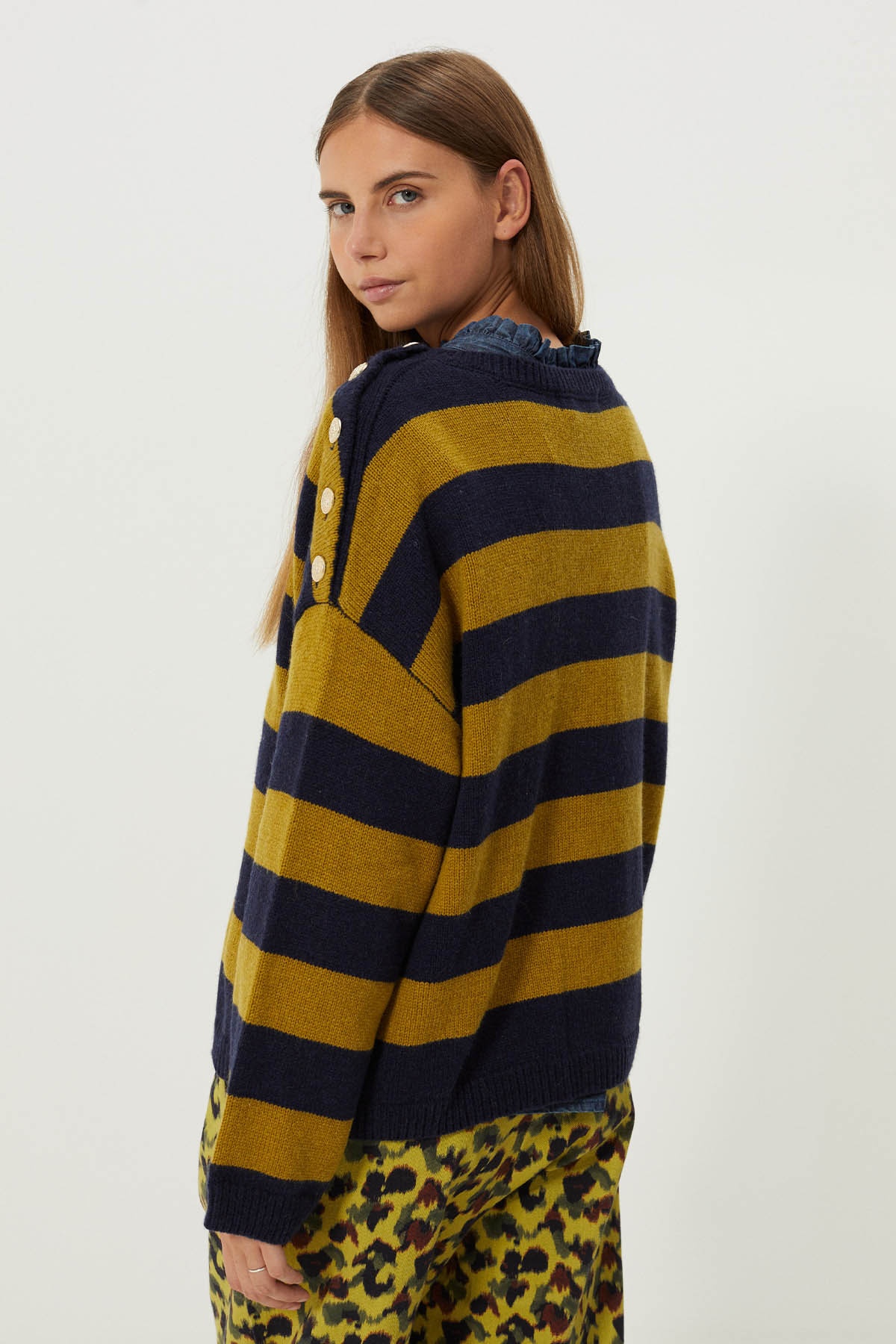 The Zita sweater revisits the timeless marinière style with a contemporary twist thanks to its navy blue and mustard stripes.