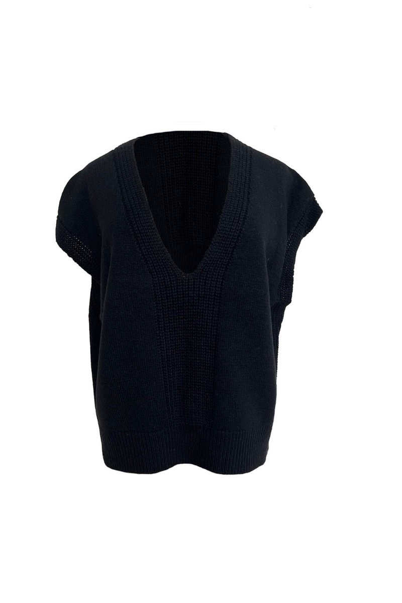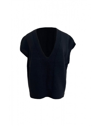 The Kitti jumper revisits the sleeveless jumper with a loose, feminine fit. Knitted in a soft wool blend, it stands out with its deep V-neck and intricate ribbed detailing.
