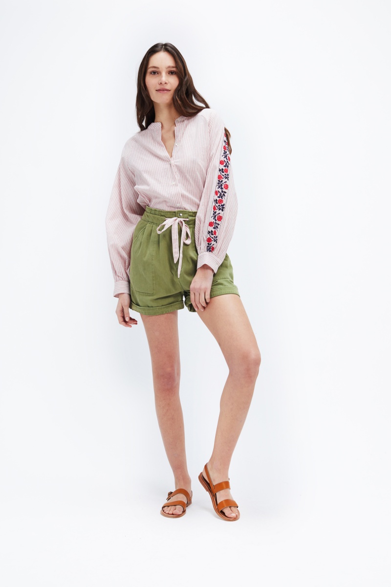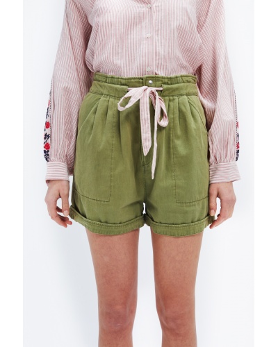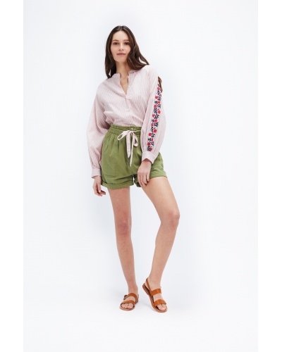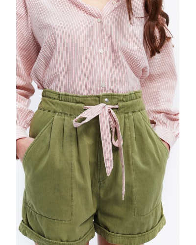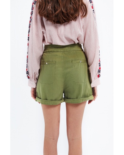 The kaki shorts have a loose fit and are fitted with a striped belt, a timeless piece to wear all summer. Pair it with a blouse in bright colours and strappy sandals.
