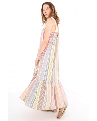 Let yourself be seduced by our Andreza dress, its soft stripes and its large flounce make it a delicate and summery piece. The straps to be tied allow you to adjust the height of the dress and its neckline according to your desires.